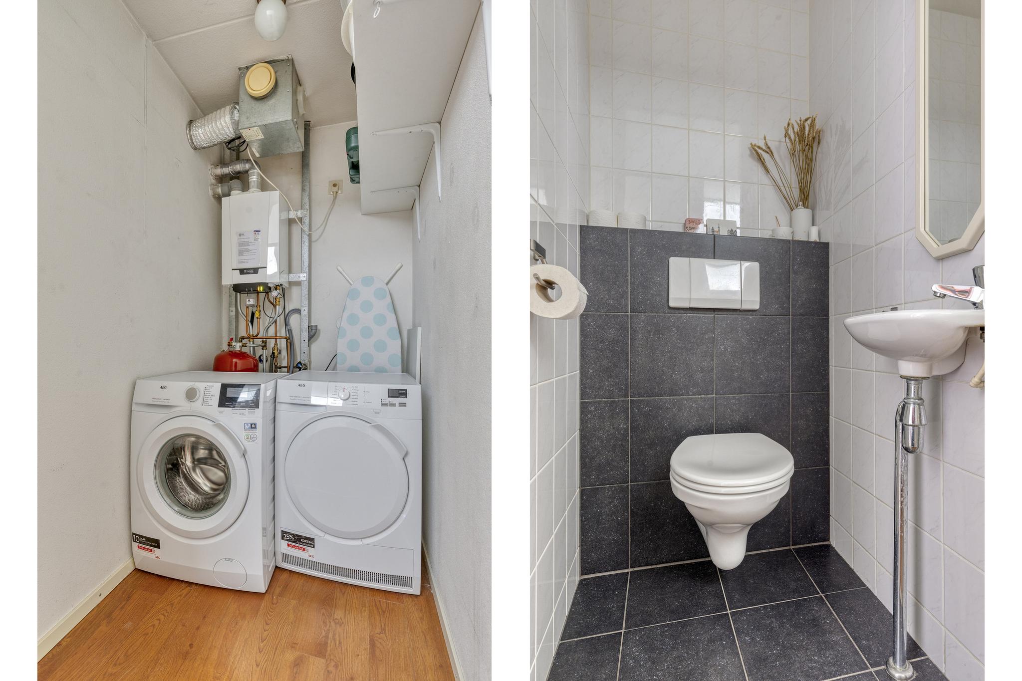 Vanuit de entree is tevens de technische ruimte bereikbaar. Hier bevinden zich de aansluitingen voor de wasapparatuur, de opstelling van de cv-ketel en biedt de ruimte voor het bergen van extra spullen.