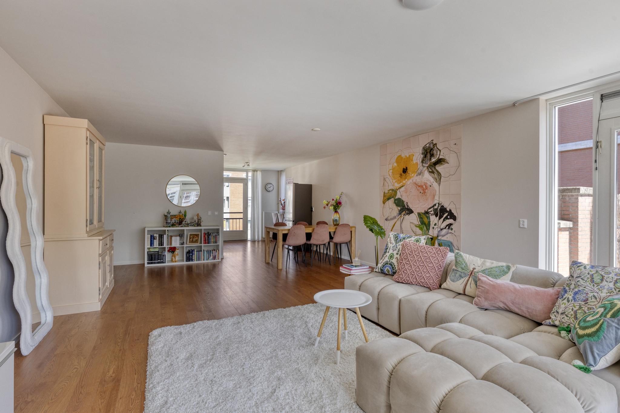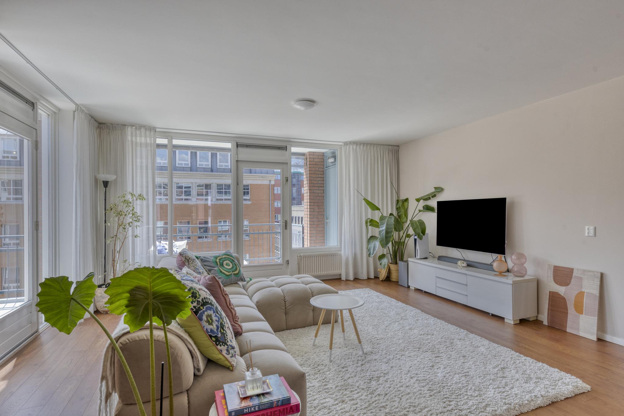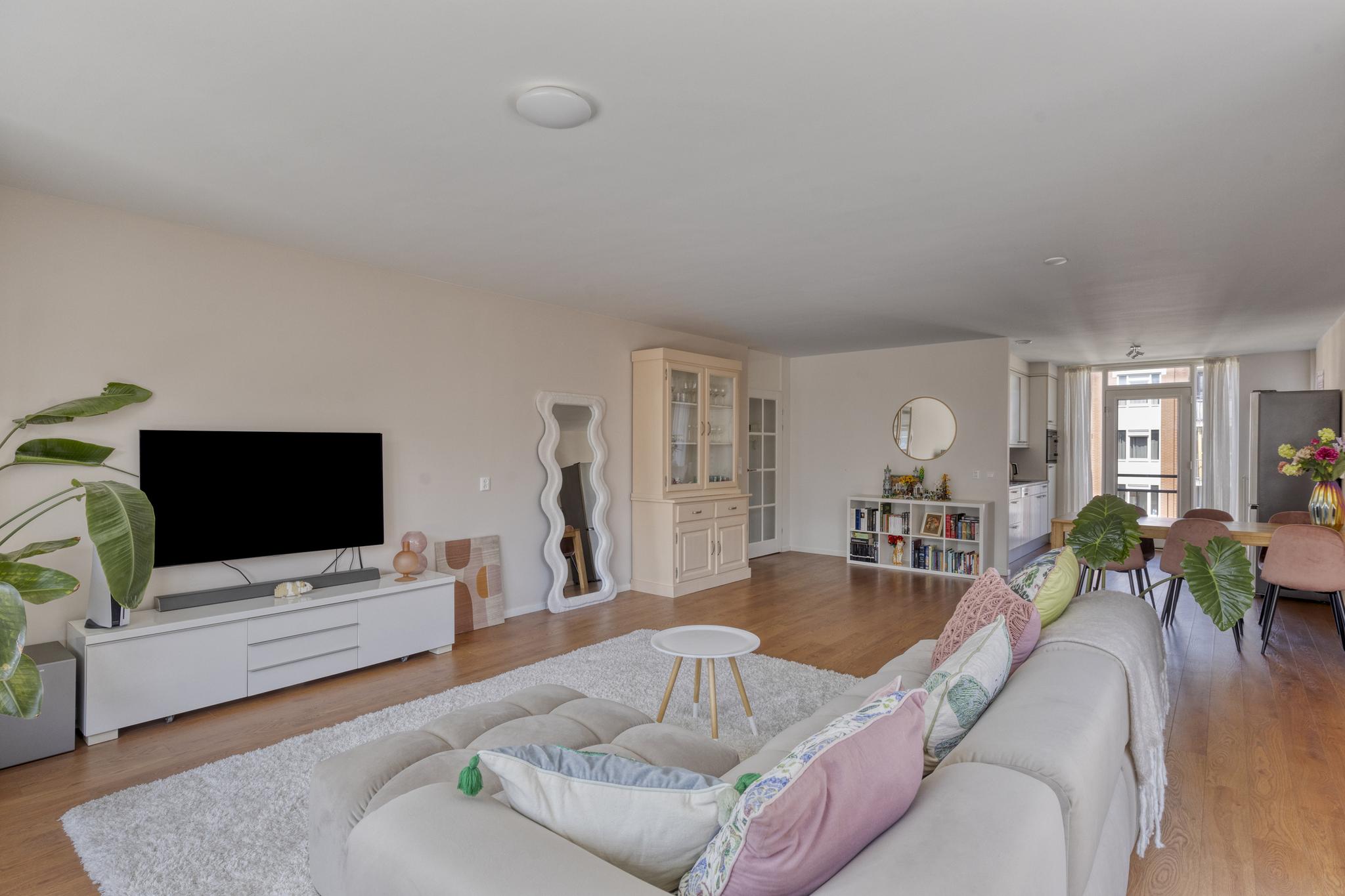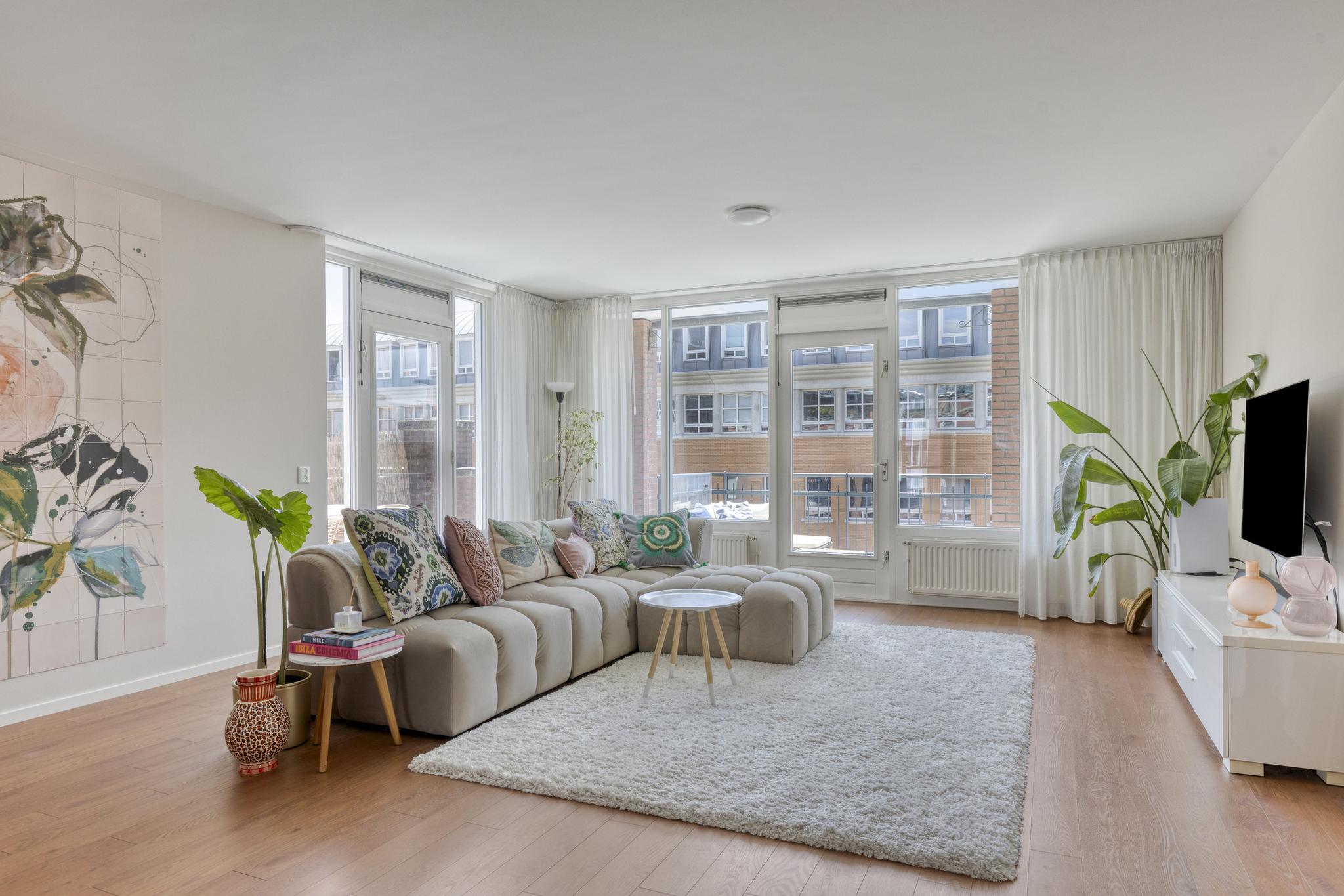 De ruime woonkamer is gelegen op de hoek en biedt met zijn vele raampartijen een geweldig uitzicht over de binnentuin en een prettige hoeveelheid lichtinval. Er is meer dan voldoende ruimte voor een leuke zithoek in de woonkamer. De riante buitenruimten zijn bereikbaar middels twee deuren en er is een elektrisch zonnescherm aanwezig.