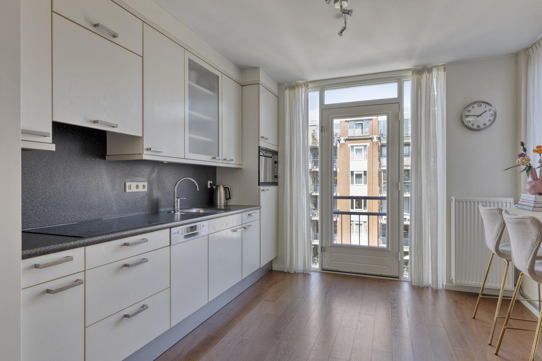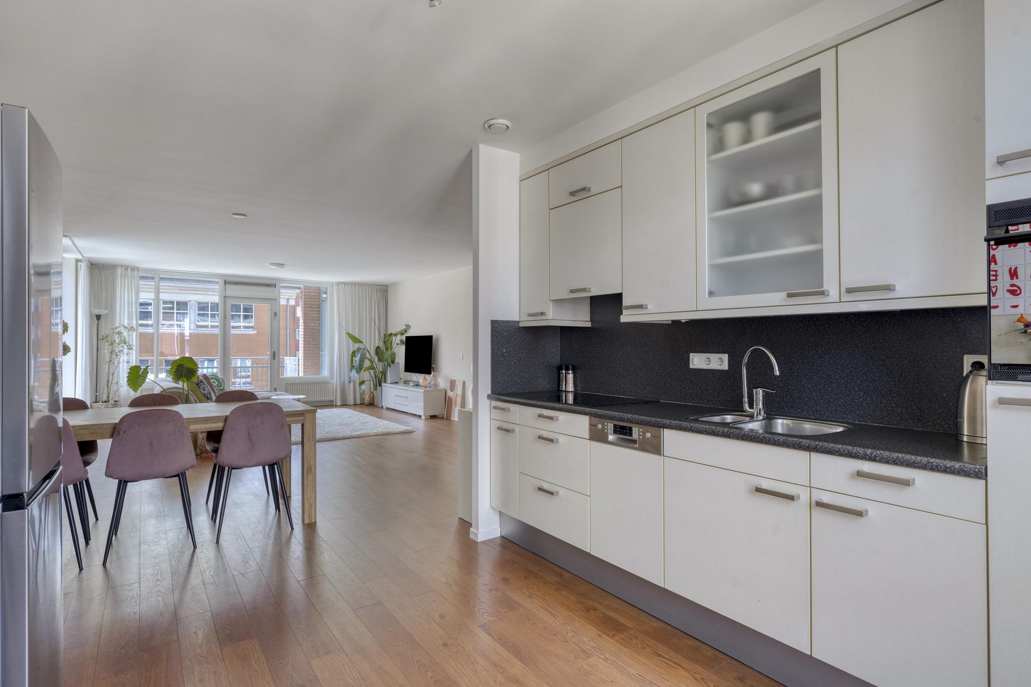 De open keuken is gesitueerd aan de achterzijde van het appartement en is voorzien van diverse inbouwapparatuur zoals combi-oven, inductie kookplaat, afzuiging en vaatwasser.