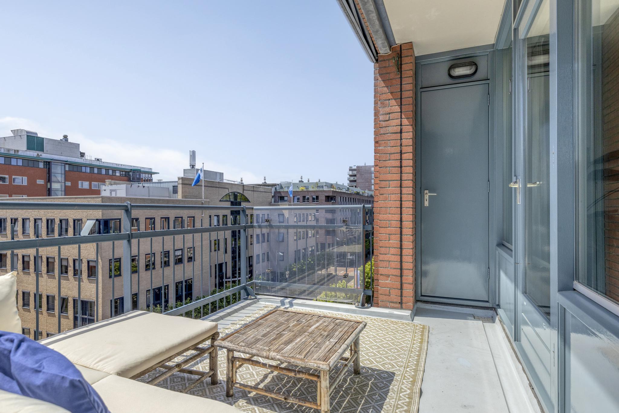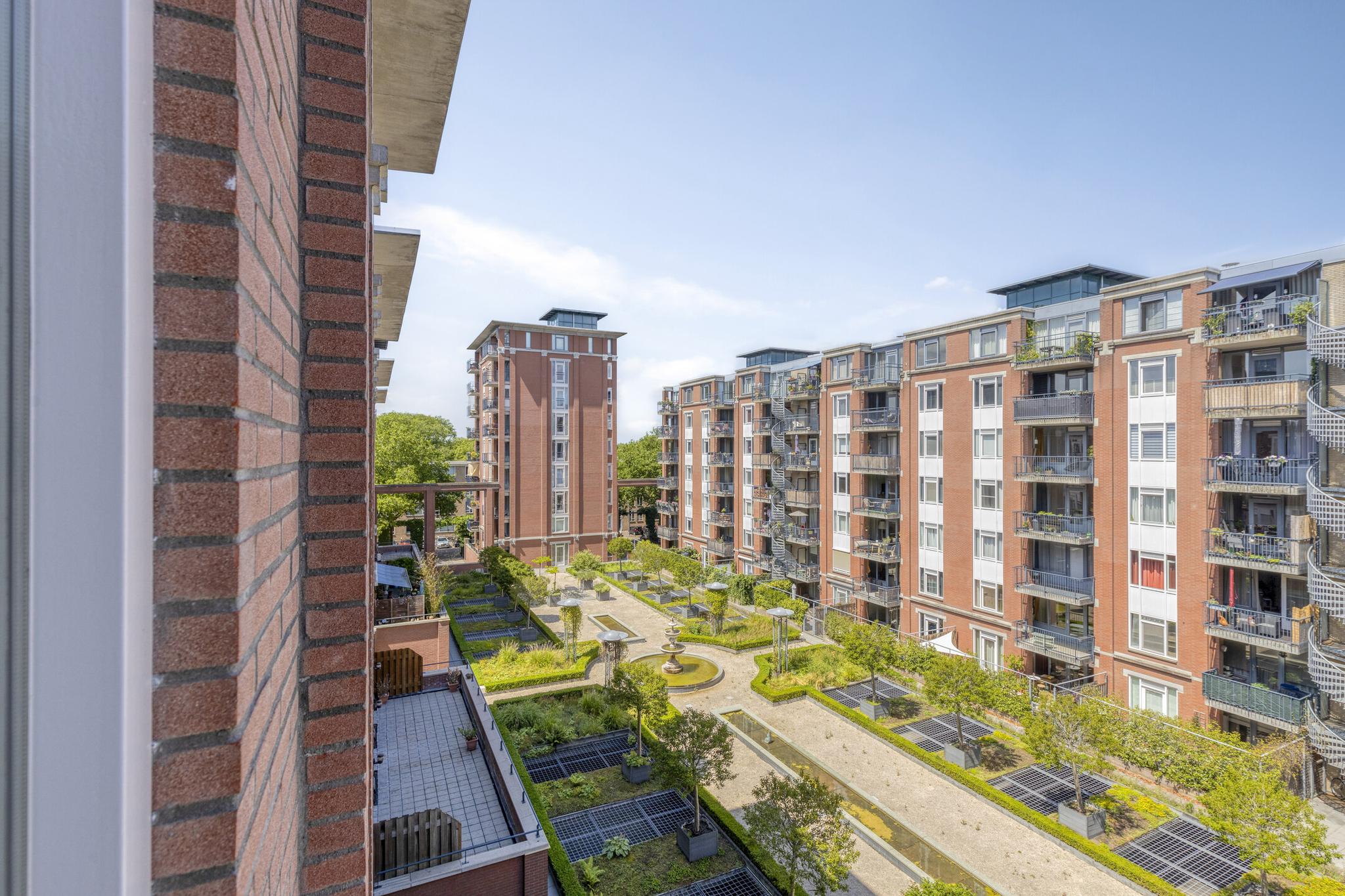Door de hoekligging van het appartement en de verdeling van twee buitenruimtes heeft u hier de gehele dag keus tussen zon en schaduw. De ligging op de vijfde verdieping heeft het voordeel dat er zich geen balkon boven bevindt, waardoor er zelfs in de winter veel zoninval is. Door de hoekligging van het appartement en de verdeling van de buitenruimtes heeft u hier de gehele dag keus tussen zowel zon als schaduw. Aan de voorzijde geniet u van het levendige uitzicht over de Leeghwaterlaan, aan de achterzijde kijkt u uit over de fraai aangelegde gemeenschappelijke binnentuin.
