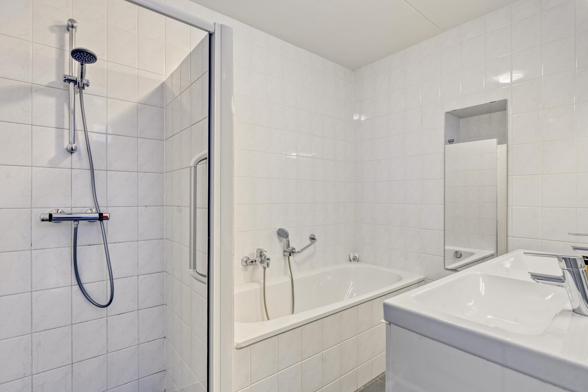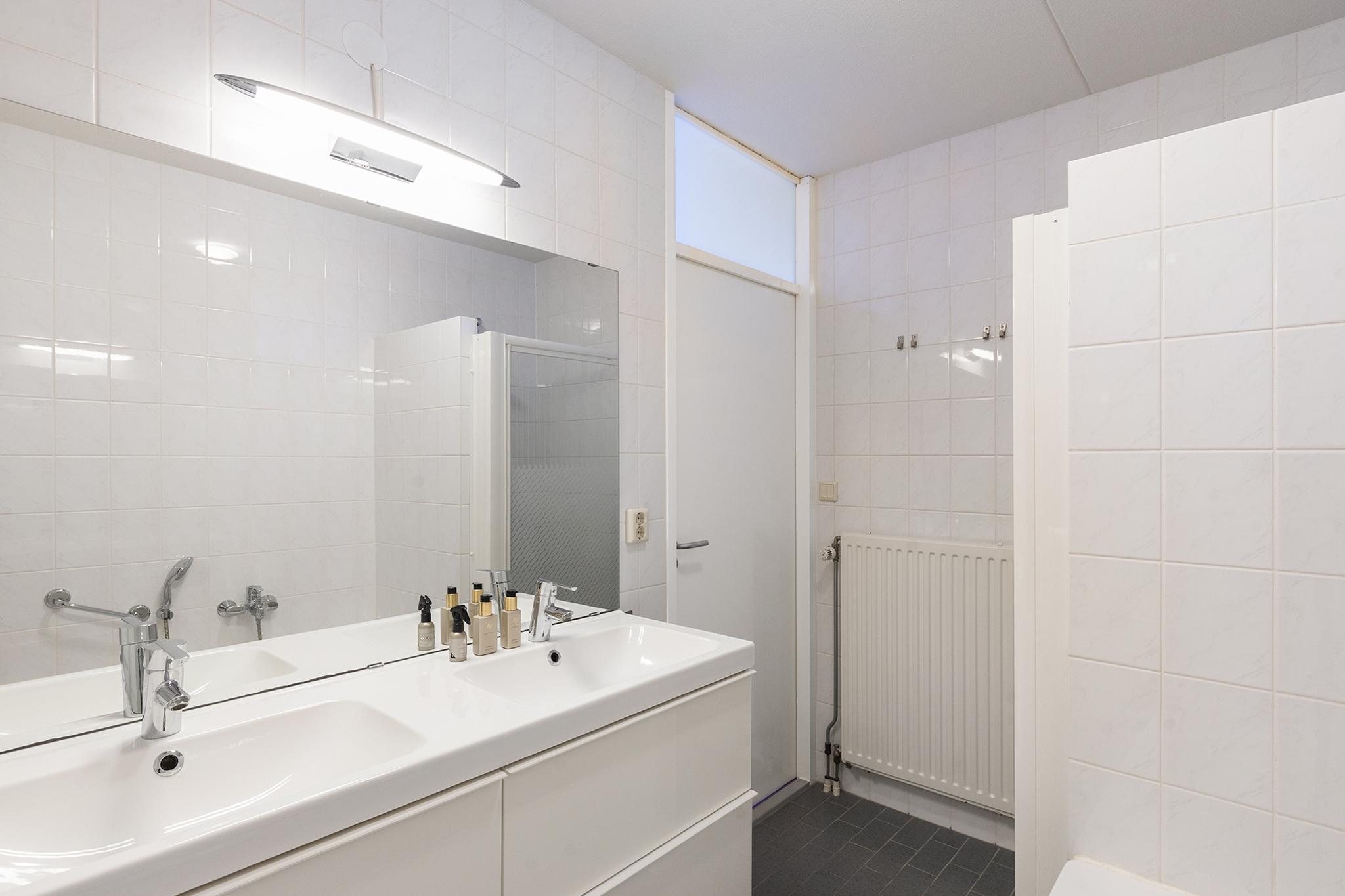 De complete badkamer is uitgevoerd in een lichte kleurstelling en van alle gemakken voorzien. Er bevindt zich een douche, ligbad en dubbele wastafel.
