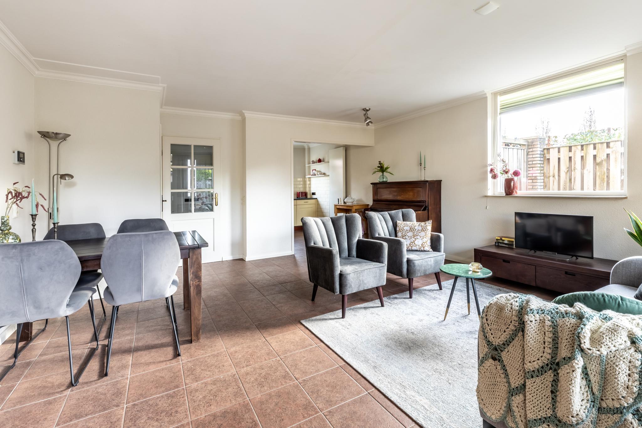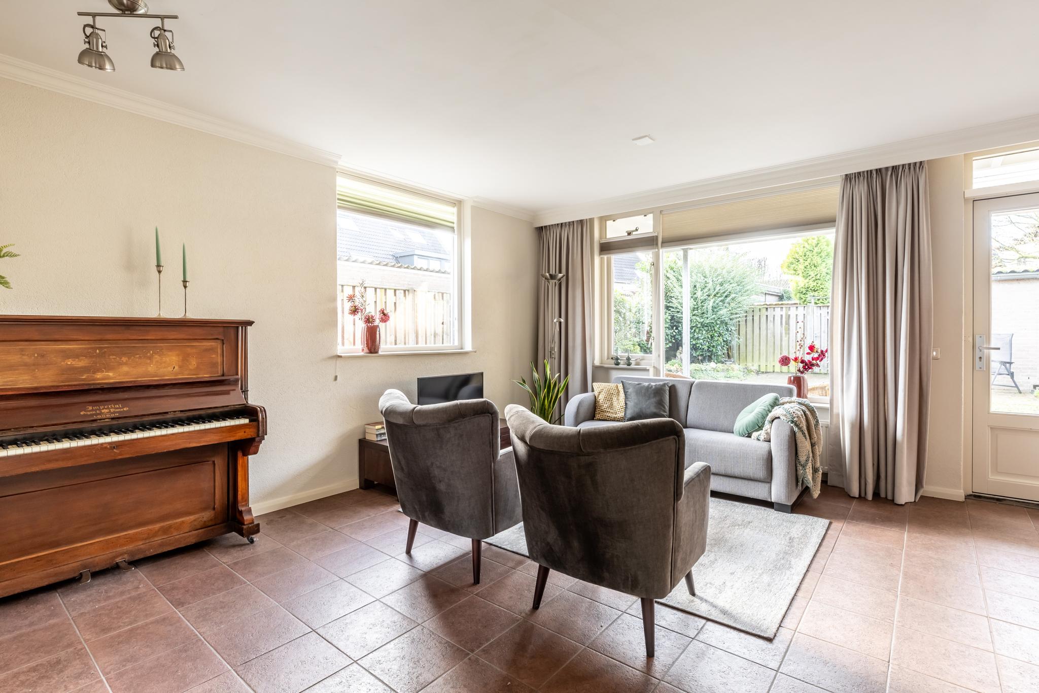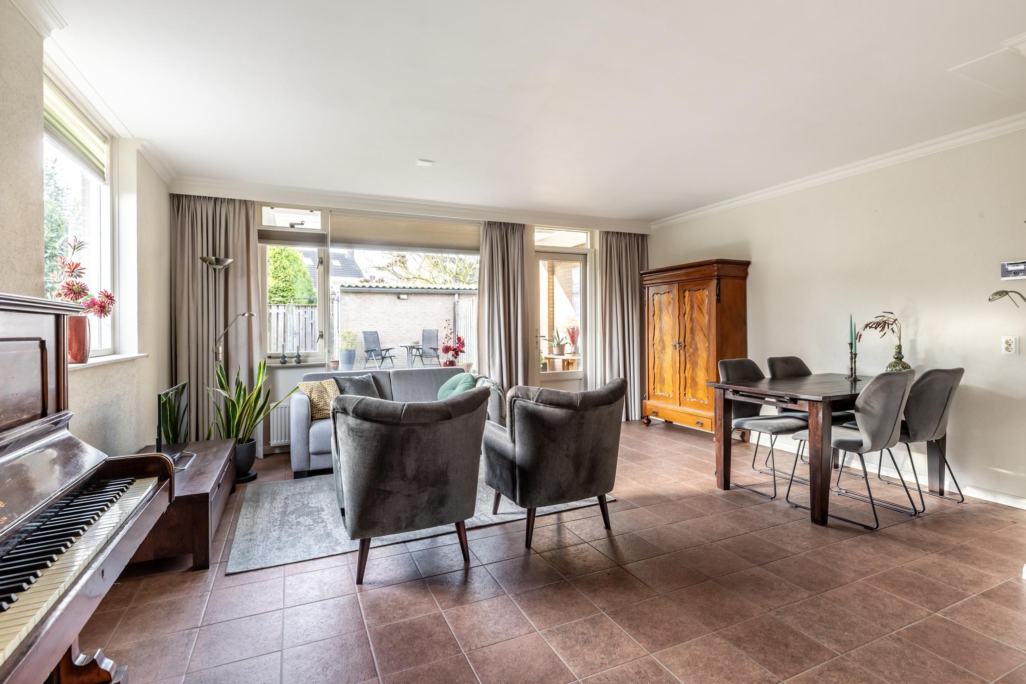 •Woonkamer voorzien van stucwerkwanden, grote raampartij met dubbele beglazing en tuindeur naar het terras.
