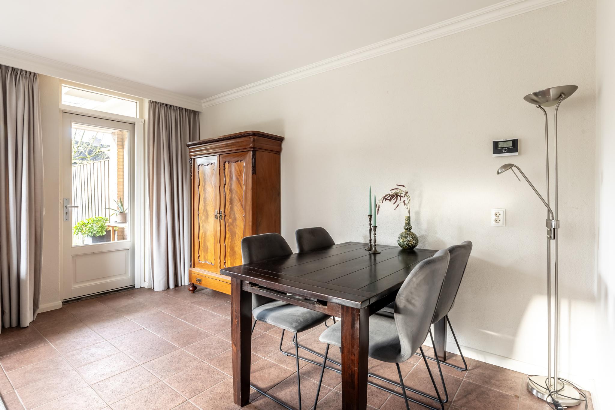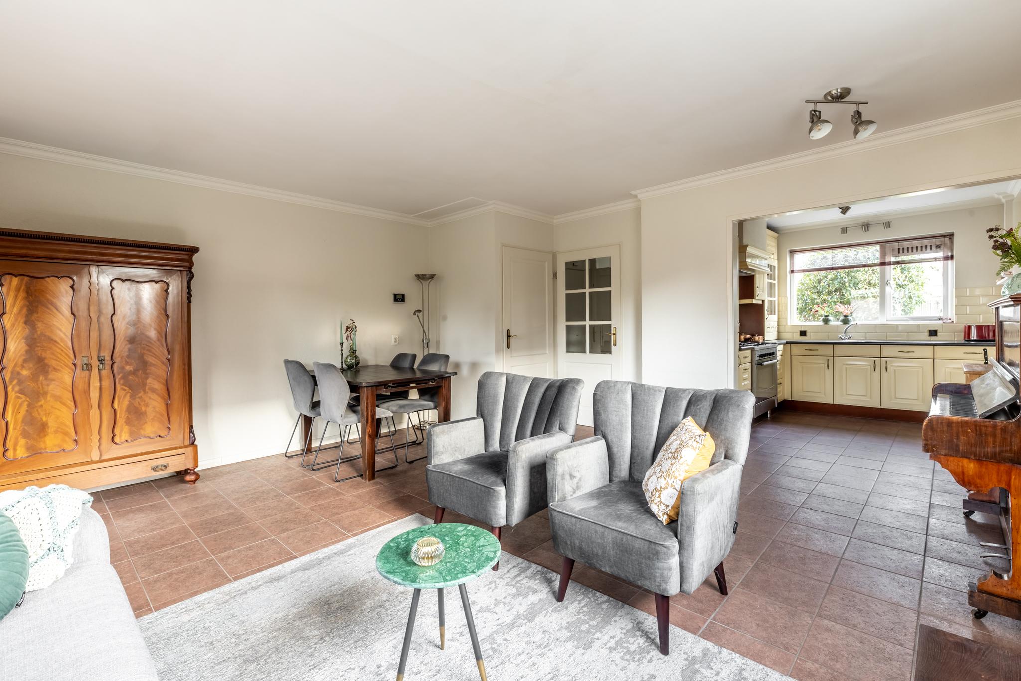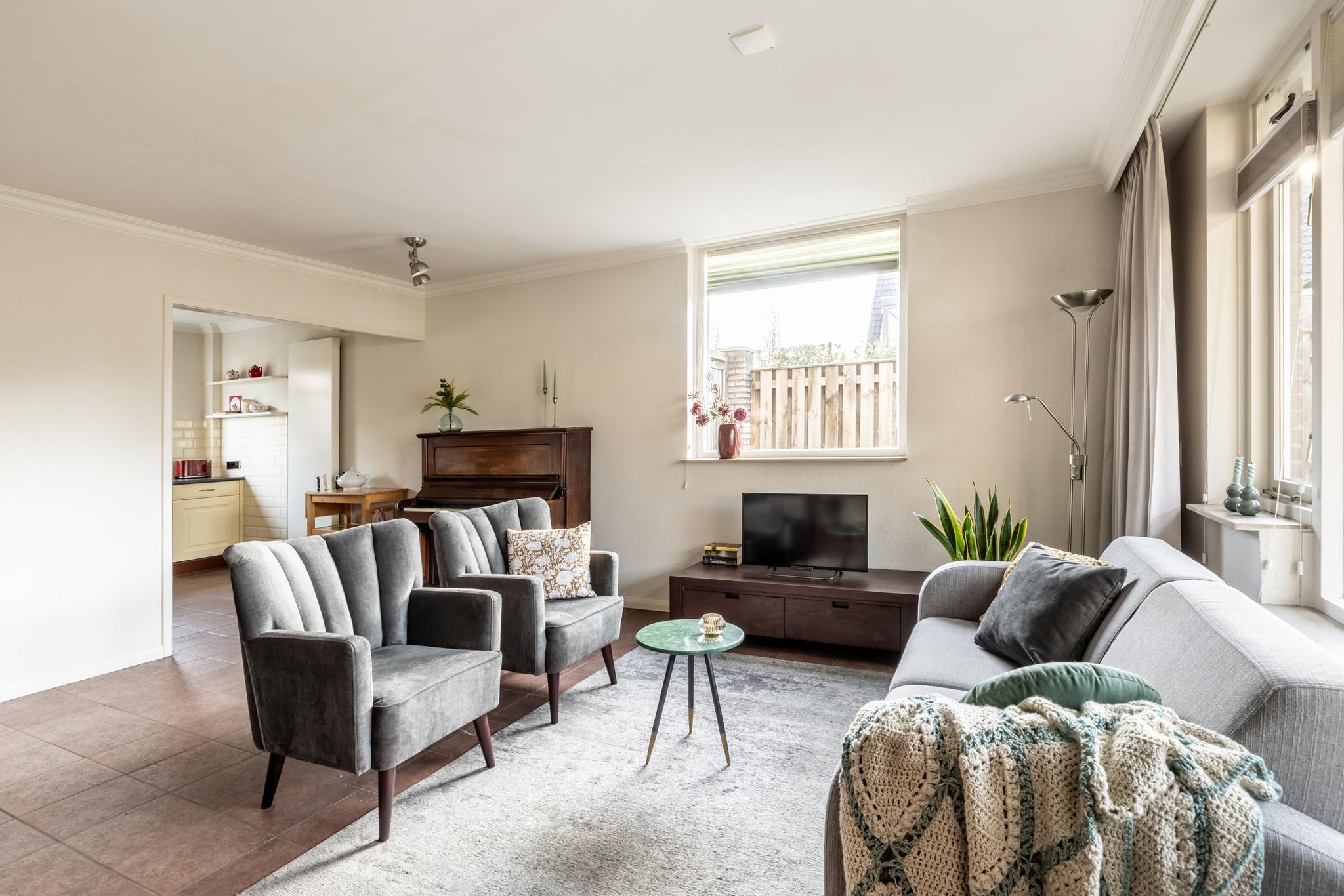 •Woonkamer voorzien van stucwerkwanden, grote raampartij met dubbele beglazing en tuindeur naar het terras.