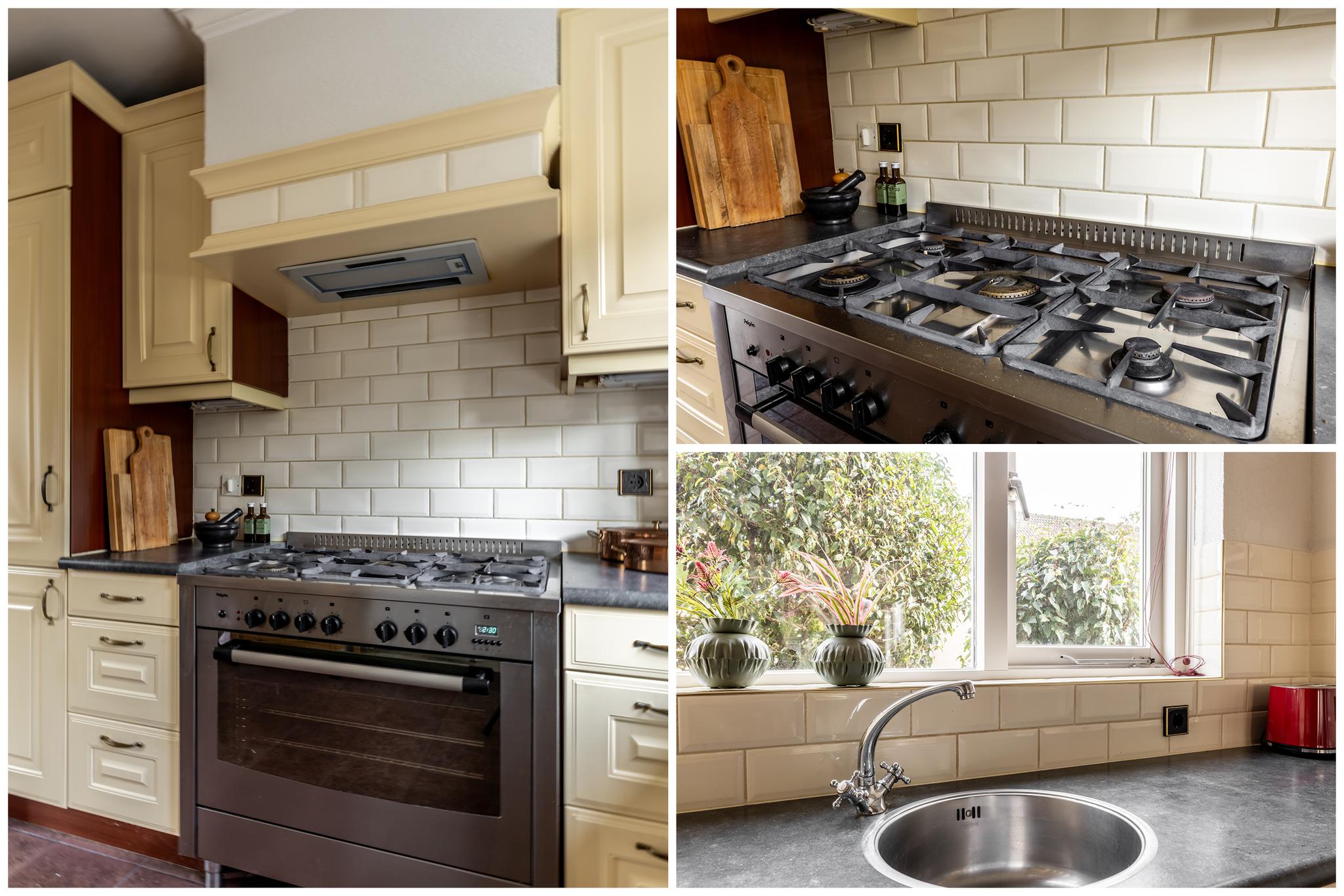 •Hoek keukenmeubel voorzien van diverse inbouwapparatuur. Te weten een vaatwasser, een koelkast, een diepvries, een combi-oven en een gasfornuis met afzuigkap.