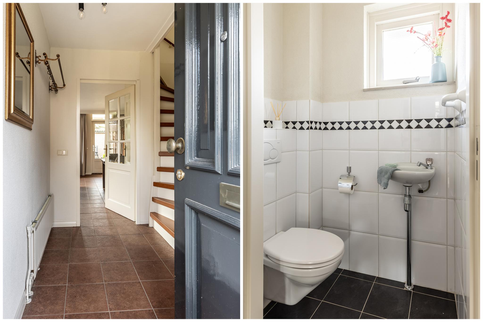 •Entree, hal met trapopgang, toilet en meterkast. De vloer is voorzien van een mooie tegelvloer die doorloopt in woonkamer/keuken.