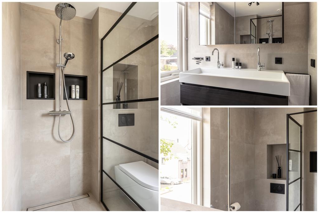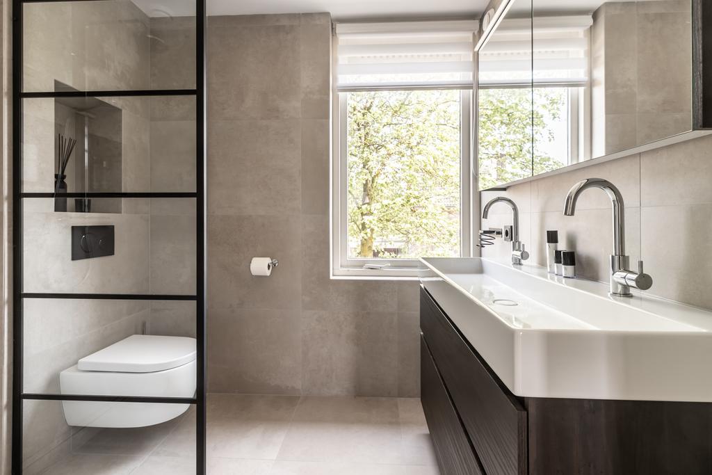•De prachtige badkamer (augustus 2023) is voorzien van vloerverwarming, een inloopdouche, wandtoilet en een brede wastafel met twee kranen.