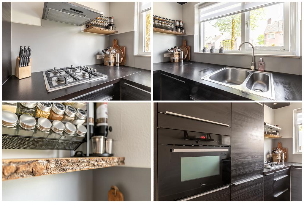 •Donker keukenmeubel voorzien van diverse inbouwapparatuur. Te weten een vaatwasser, een koelkast, een diepvries, een combi-oven, en een 4-pitsgaskookplaat met rvs afzuigkap.