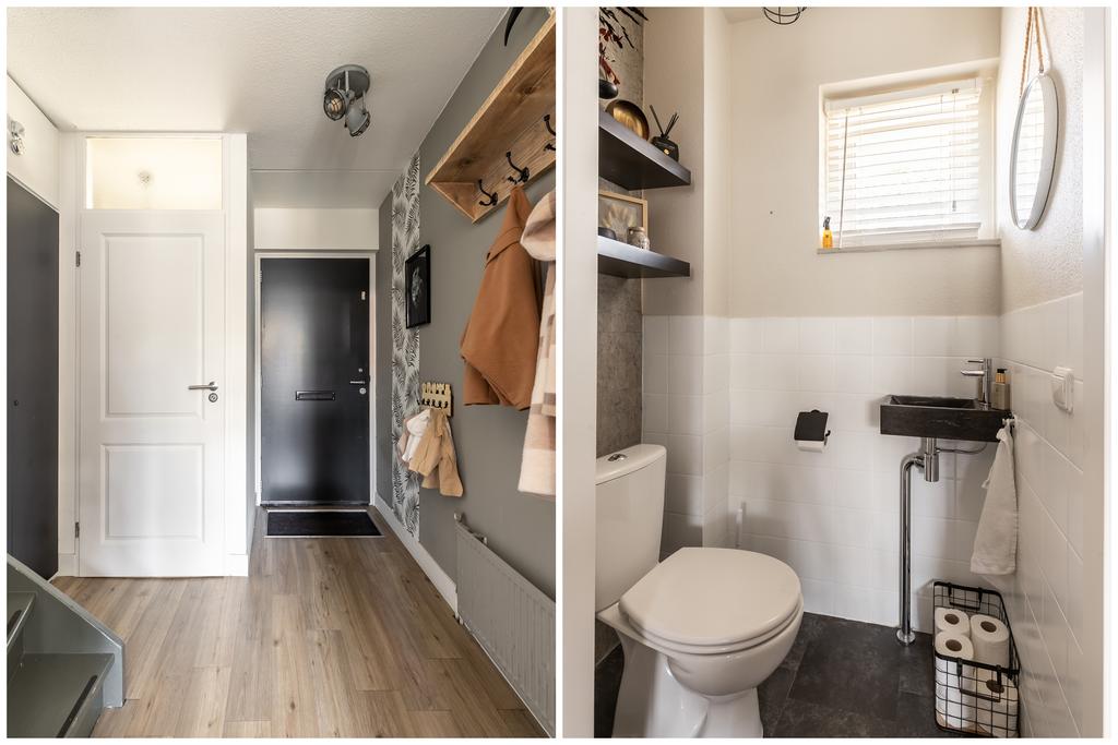 •Entree, hal met trapopgang, toilet en meterkast. De vloer is voorzien van een mooie PVCvloer die doorloopt in woonkamer/keuken.