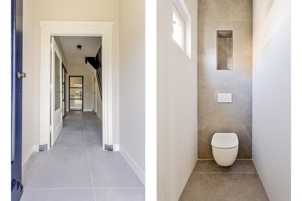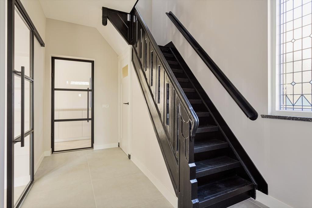 Entree met vestibule. Direct aansluitend de centrale hal van praktisch ruim formaat. Deze geeft direct de allure van de woning weer samen met de charmante jaren '30 invloeden door een glas-in-lood raam en een mooie jaren '30 natuurstenen vensterbank. De woning heeft oprecht een fraaie trapopgang met houten trap voorzien van authentiek houtsnijwerk naar de eerste verdieping. Onder de trap treffen we de toegang tot de kelder. Deze ruimte is praktisch in gebruik voor de warmtepomp installatie van de woning.