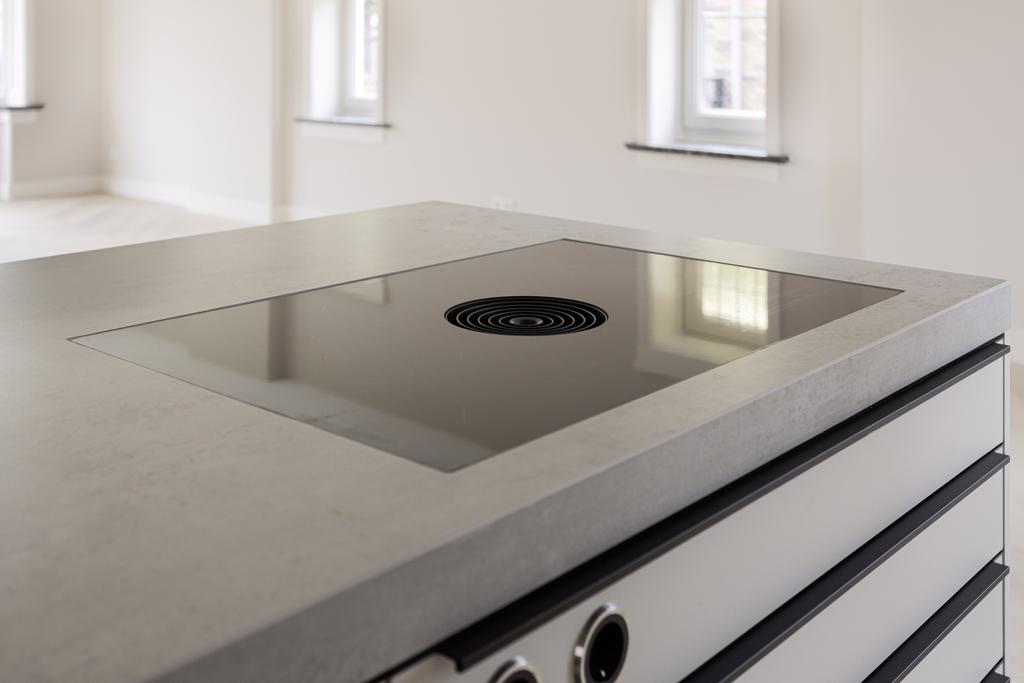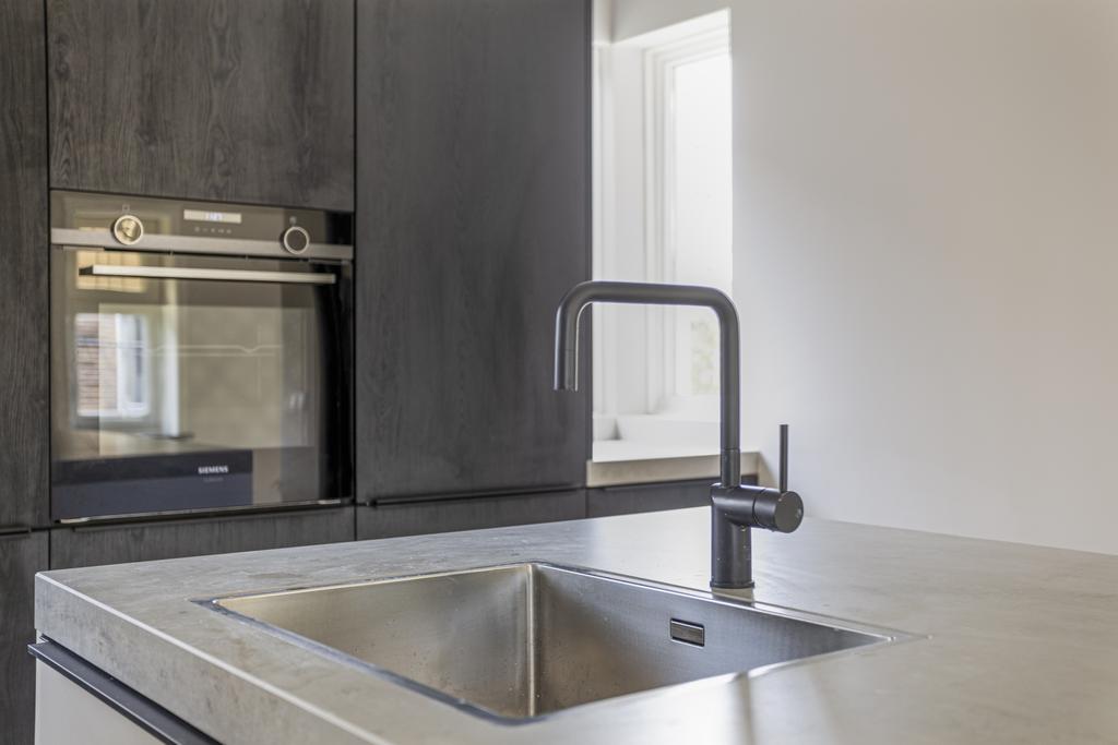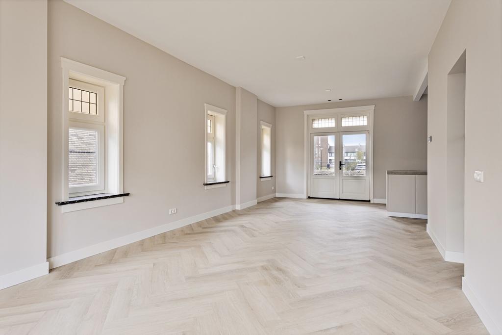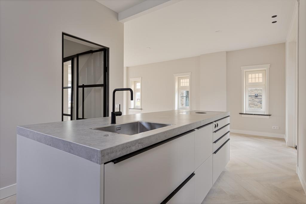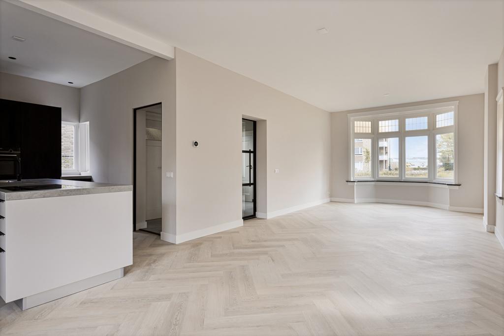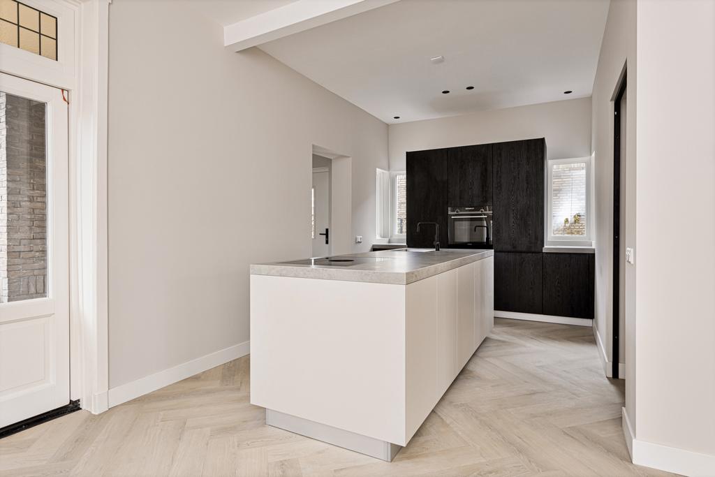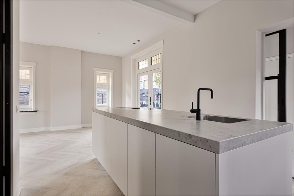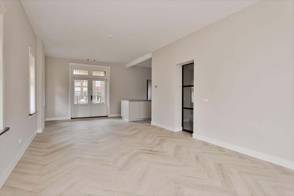 Vanuit de hal is de woonkamer toegankelijk. Het jaren '30 karakter wordt kracht bijgezet door de erker aan de voorkant van de woning. Achter geven dubbele tuindeuren toegang tot een overdekt terras. De woonkamer heeft mooie hoge plafonds, is voorzien van een nieuwe pvc-vloer met vloerverwarming en de wanden plus plafonds zijn zeer strak gestuct. De woonkamer staat in open verbinding met de keuken. De keuken is een luxe uitgevoerde keuken van het kwaliteitsmerk Poggenpohl. De keuken heeft een goed formaat kookeiland met diverse inbouwkasten en ruime lades. Naast het eiland is er een "apparaten wand in donkere kleurstelling voorzien. Je mag eerste klasmaterialen en inbouwapparatuur van Siemens en Miele verwachten. Denk hierbij aan een inductiekookplaat, een koelkast, een vriezer, een vaatwasser en een combi-oven. Direct aan de keuken en via een stalen schuifdeur toegankelijk is het tussenportaal annex achterom gesitueerd. Deze heeft ook toegang tot de berging / wasruimte.