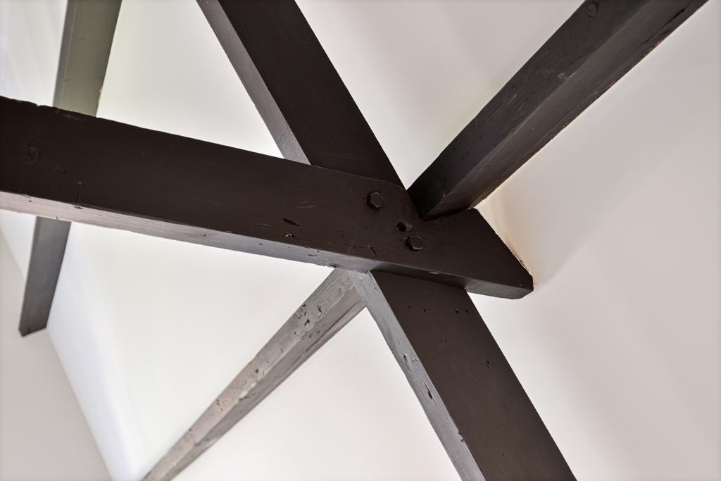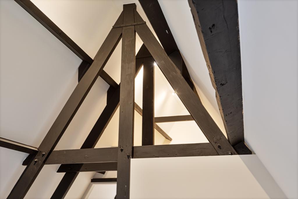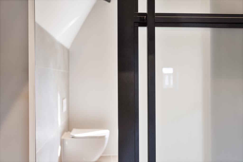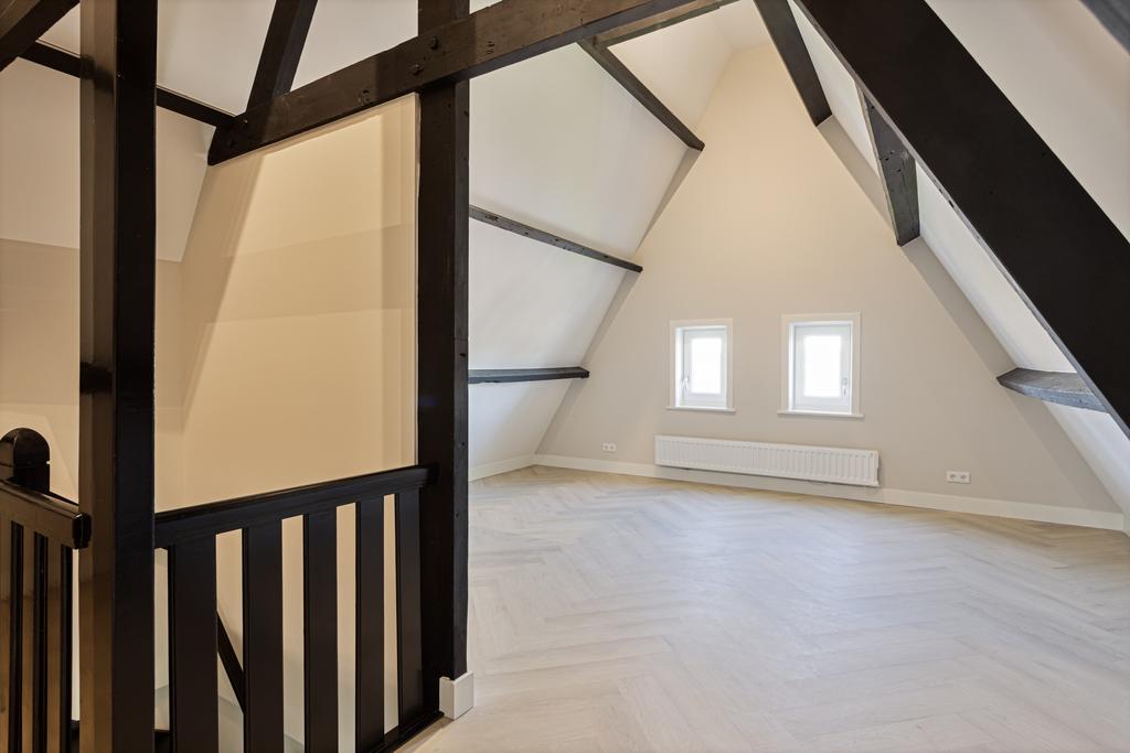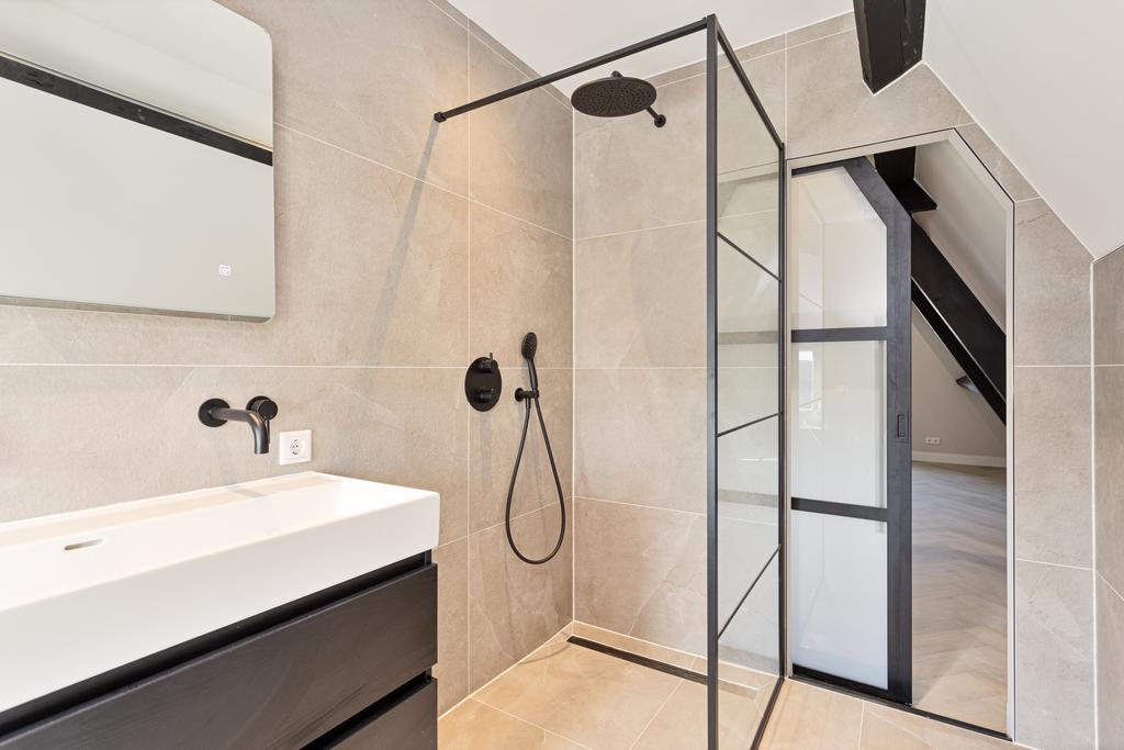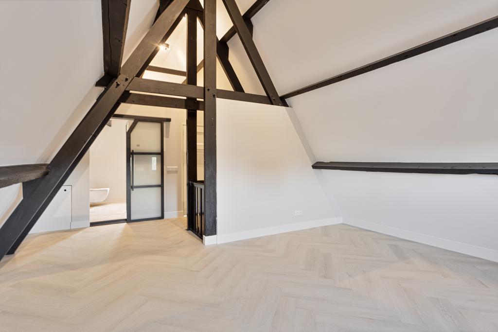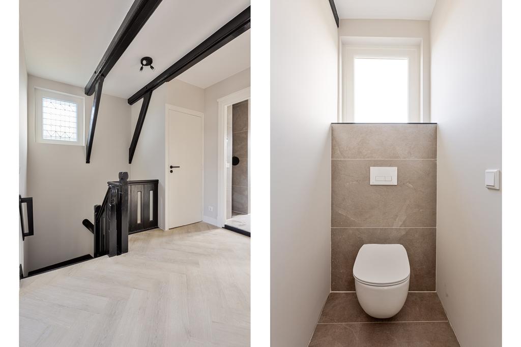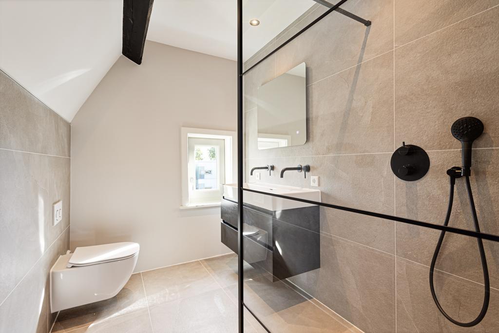 Overloop naar twee slaapkamers en een tweede badkamer. De grootste slaapkamer is oprecht indrukwekkend met de hoge plafonds en mooie balken constructie in het zicht. De badkamer op deze verdieping is net als de badkamer op de eerste verdieping volledig nieuwe en luxe afgewerkt met een stalen schuifdeur, inloopdouche met luxe inbouw kraan, een extra toilet en een breed wastafelmeubel met dubbele lade en luxe inbouw kranen.