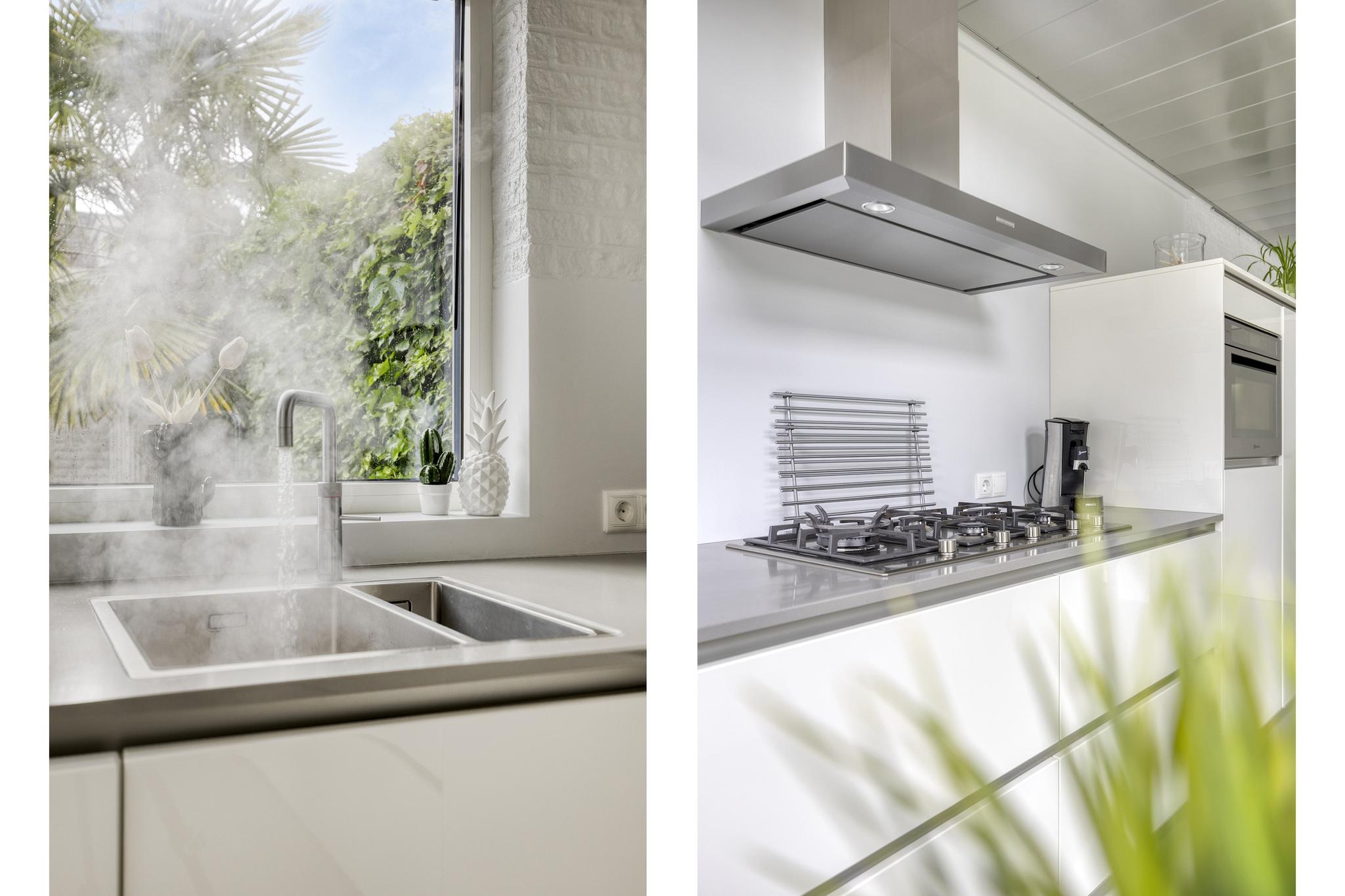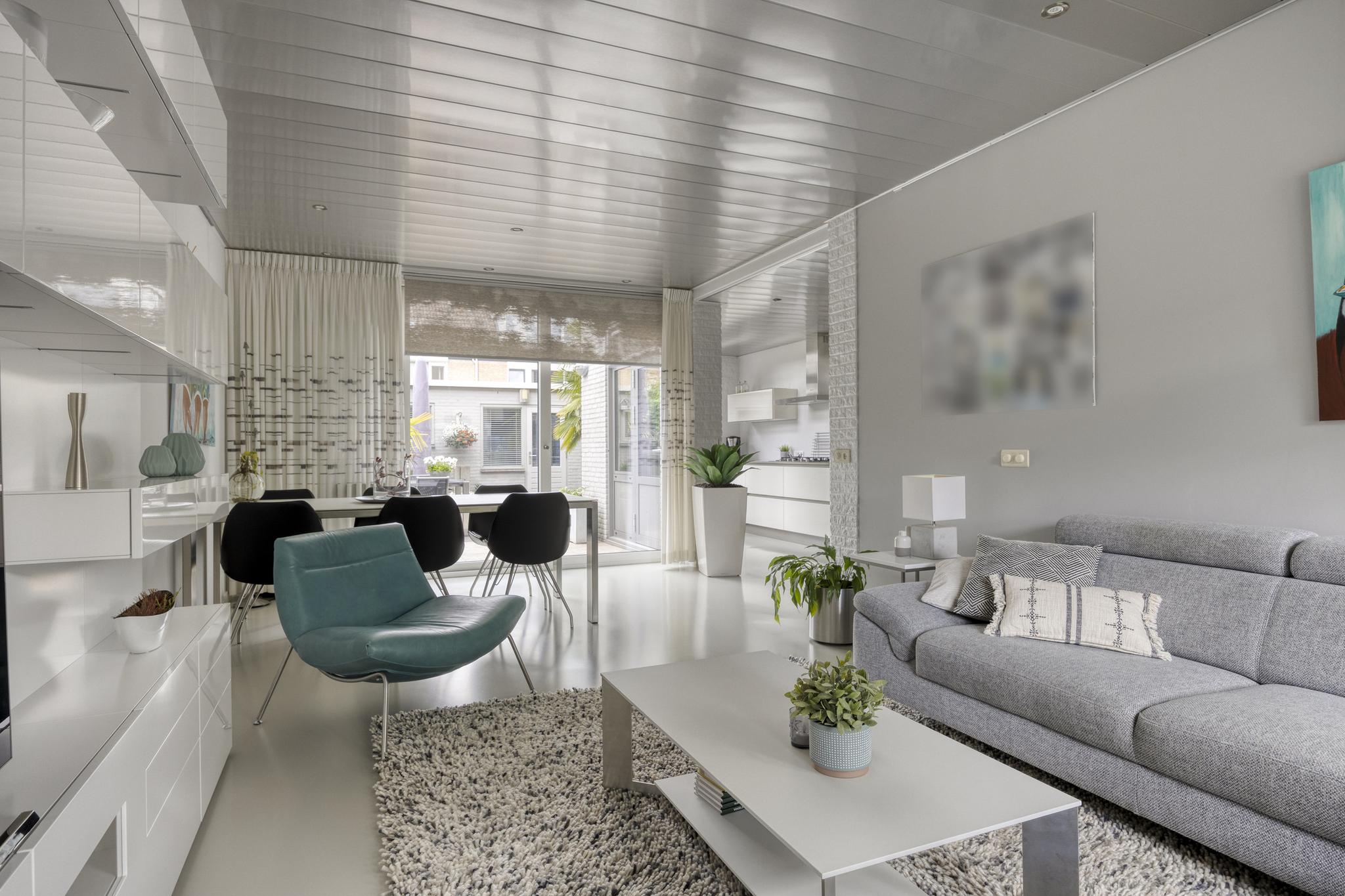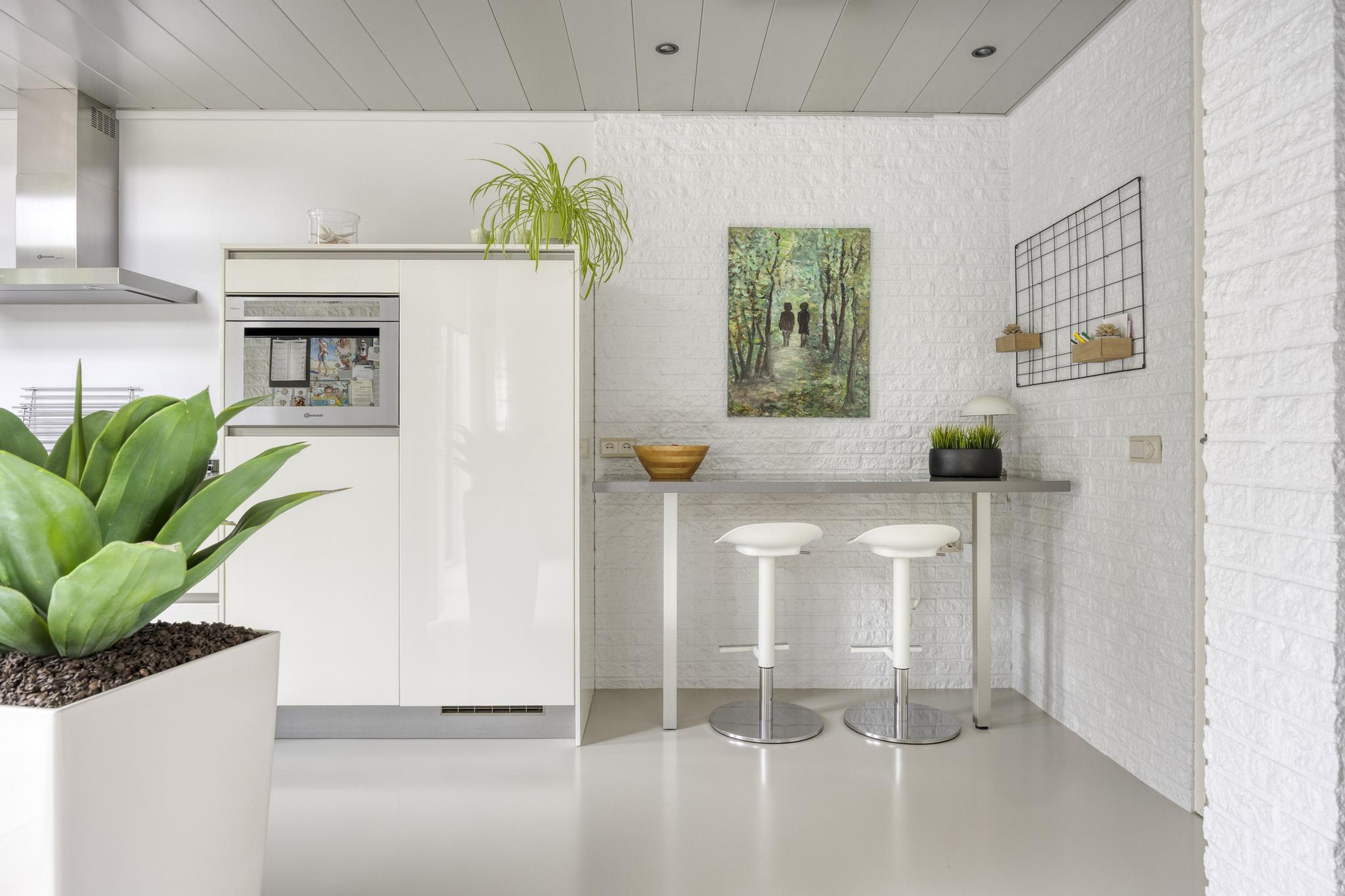 Bij binnenkomst via de ruime hal valt meteen de verrassend lichte woonkamer op, waar natuurlijk daglicht in overvloed binnenkomt. De mooie gietvloer gecombineerd met lichte kleurstellingen zorgt voor een moderne sfeer. Dankzij de stijlvolle inbouwspots is de ruimte ook ‘s avonds perfect verlicht en extra sfeervol. De woning biedt een gezellige zithoek aan de voorzijde, waar je heerlijk kunt ontspannen op een royale hoekbank of genieten van je favoriete televisieprogramma. Daarnaast is er volop plek voor een ruime eettafel met diverse stoelen, die dankzij de grote schuifpui direct verbonden is met de buitenruimte – ideaal voor warme zomerdagen of gezellige diners buiten. De keuken is modern en praktisch ingericht, voorzien van hoogwaardige inbouwapparatuur zoals een Quooker, combi-oven/magnetron, 5-pits gasfornuis, afzuigkap, vaatwasser en koelkast. Een charmant barretje aan het begin van de keuken nodigt uit om te genieten van een snel ontbijt of een kop koffie. Ook hier zorgt een tuindeur voor een directe verbinding met de tuin, wat zorgt voor een fijn binnen-buitengevoel. Daarnaast beschikt de begane grond over een handige berging onder de trap en een separaat toilet met fonteintje.