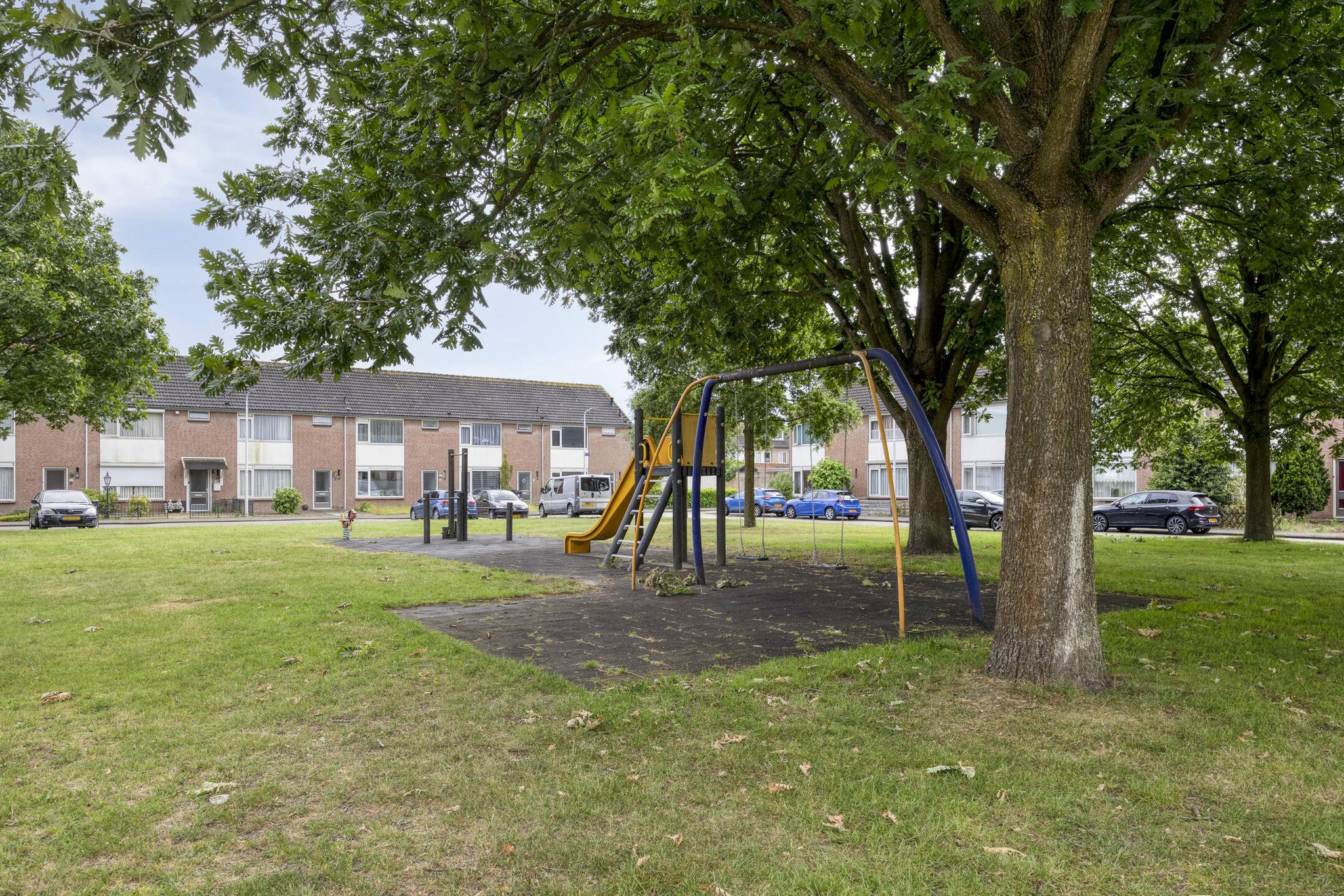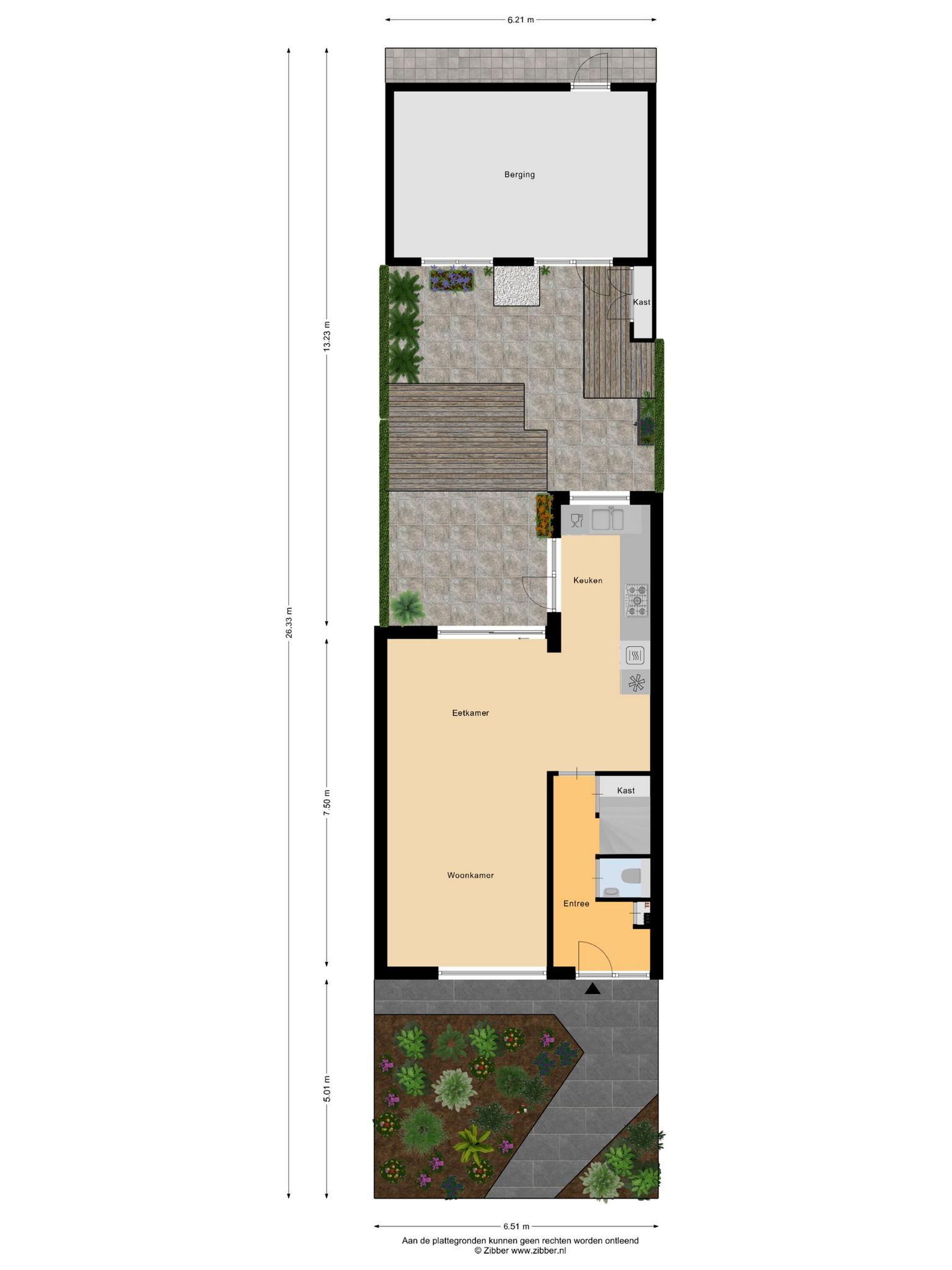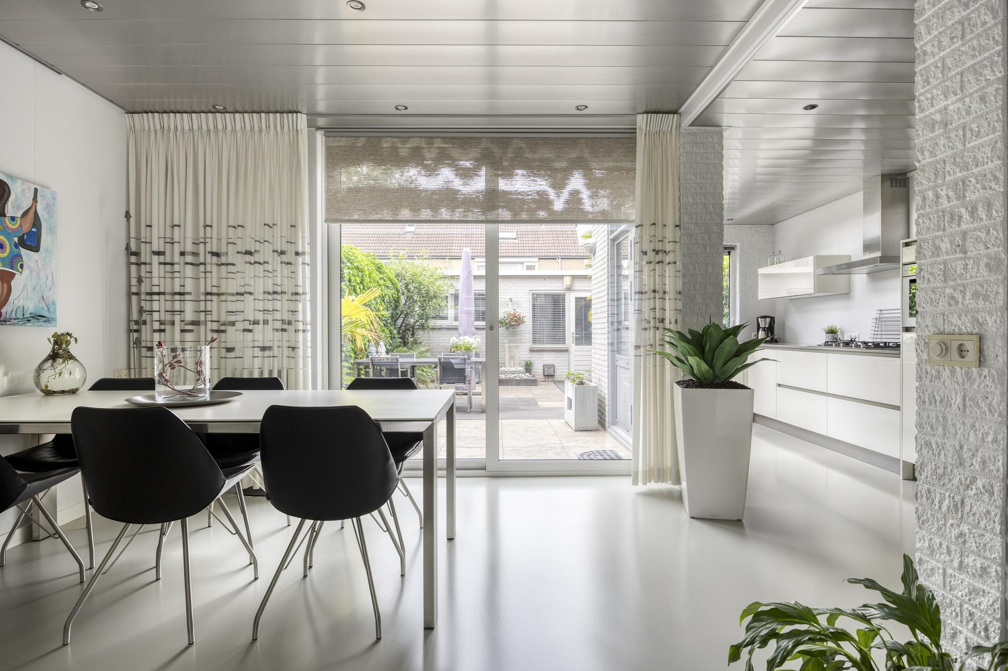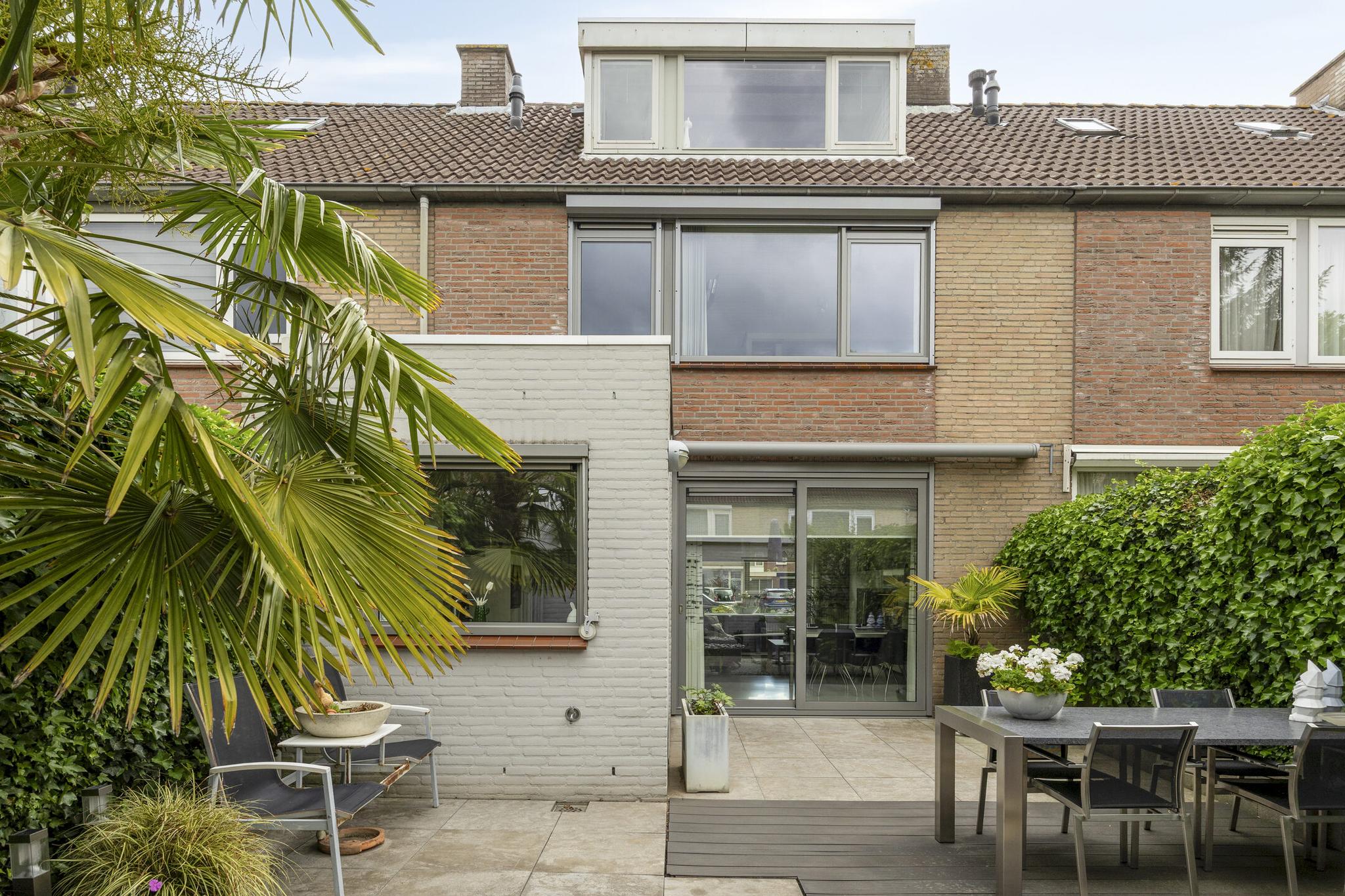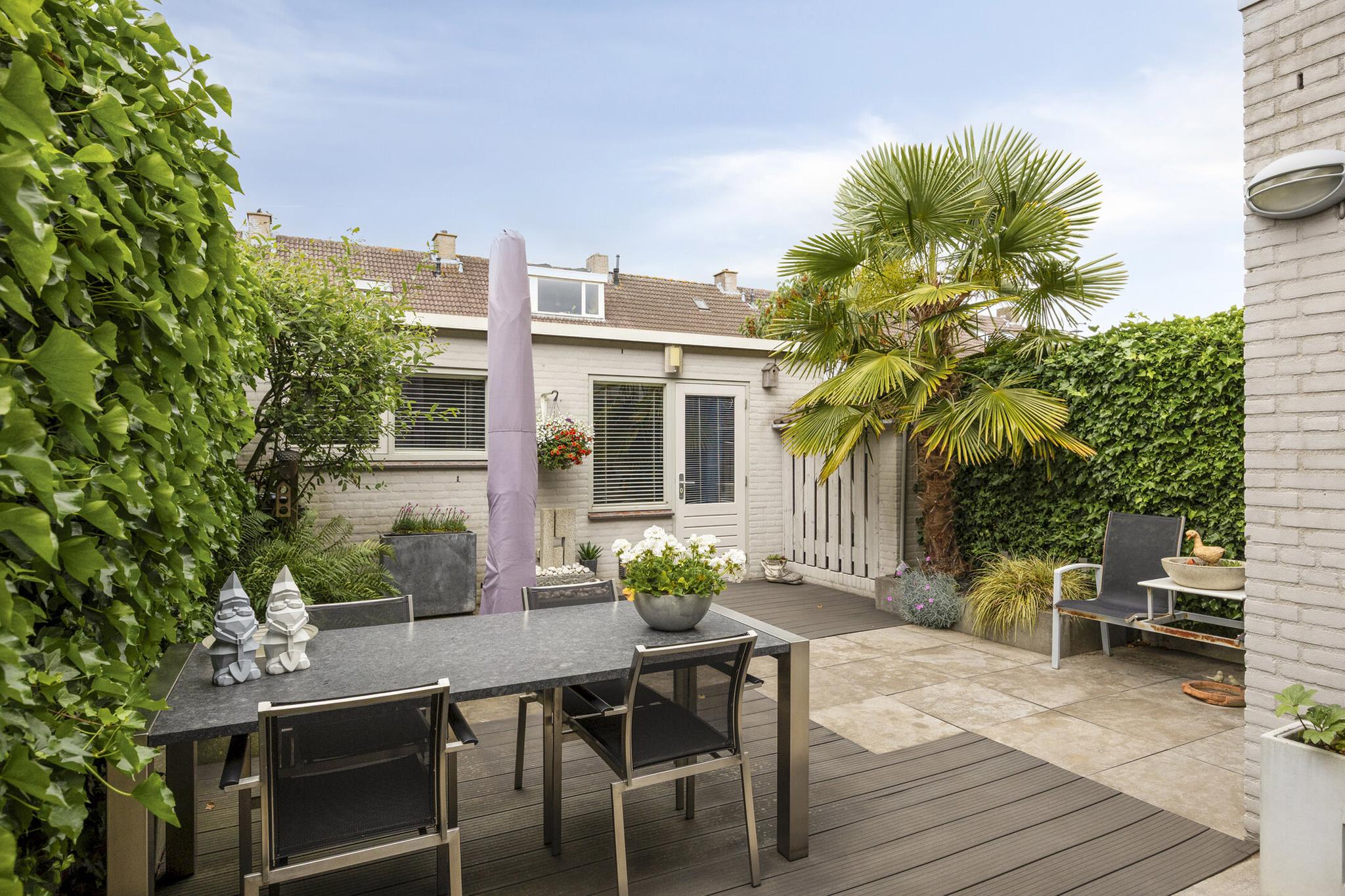 De onderhoudsvriendelijke tuin valt direct op als een prettige en uitnodigende plek om heerlijk van de zon te genieten tijdens de warmere maanden. De combinatie van ruime, strakke tuintegels en diverse groenvoorzieningen geeft de tuin een moderne uitstraling die naadloos aansluit op de binnenruimte. De opvallende palmboom zorgt voor een extra tropische touch en maakt de buitenruimte helemaal af. Voor schaduw op zonnige dagen is er een praktische zonneluifel aanwezig, zodat je altijd comfortabel buiten kunt zitten. Daarnaast is er een ruime stenen berging met elektriciteit, ideaal voor het opbergen en opladen van tuingereedschap of een elektrische fiets. Vanuit de tuin is er een handige achterom, die toegang geeft tot een brandgang.