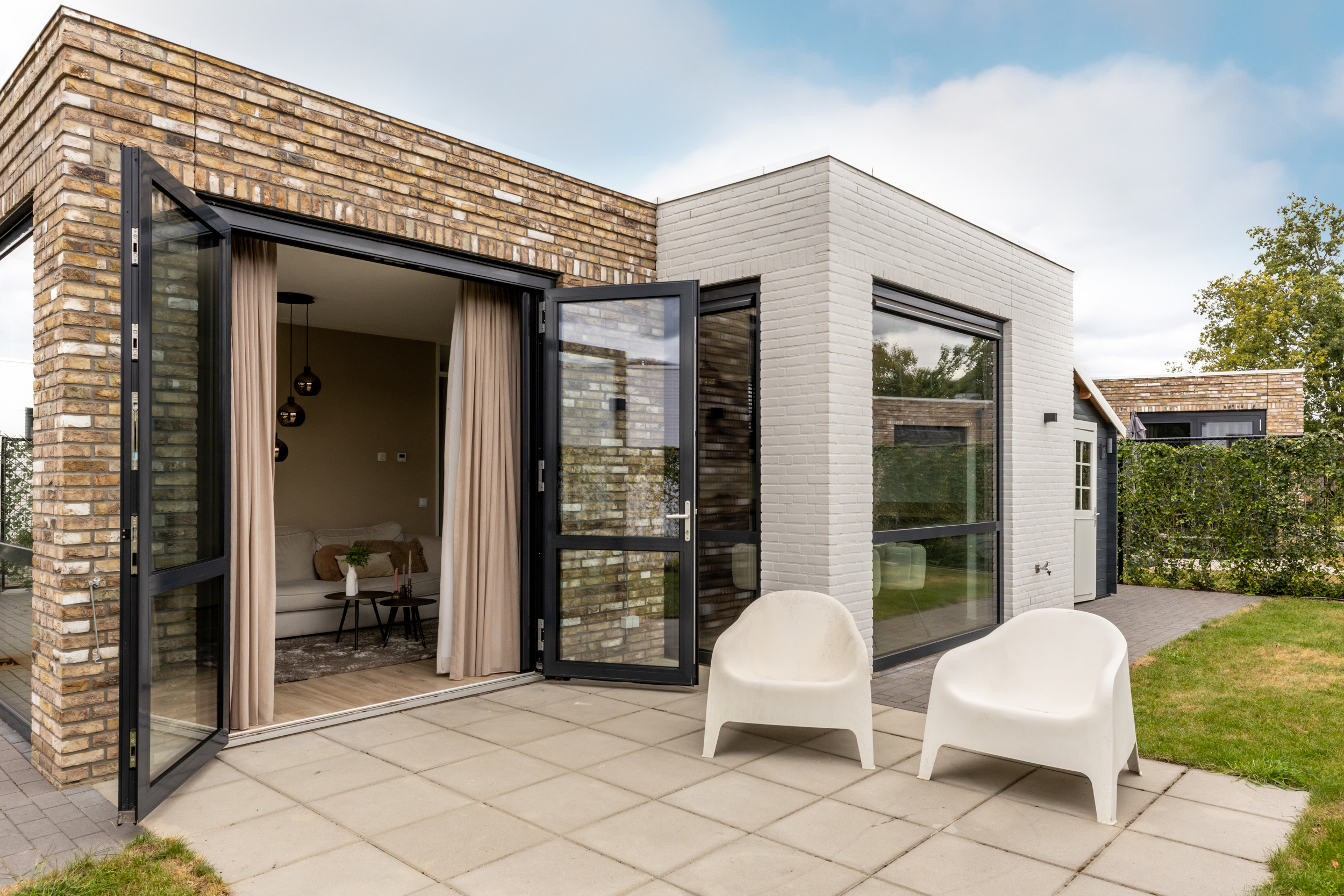 In de living zorgen de grote aluminium raampartijen met tripleglas voor een zee aan daglicht. Schuif de gordijnen open, zet de openslaande deuren bij de woonkamer wijd open en laat binnen en buiten in elkaar overlopen. De draai kantelramen en ook de opslaande tuindeuren zijn voorzien van horren.