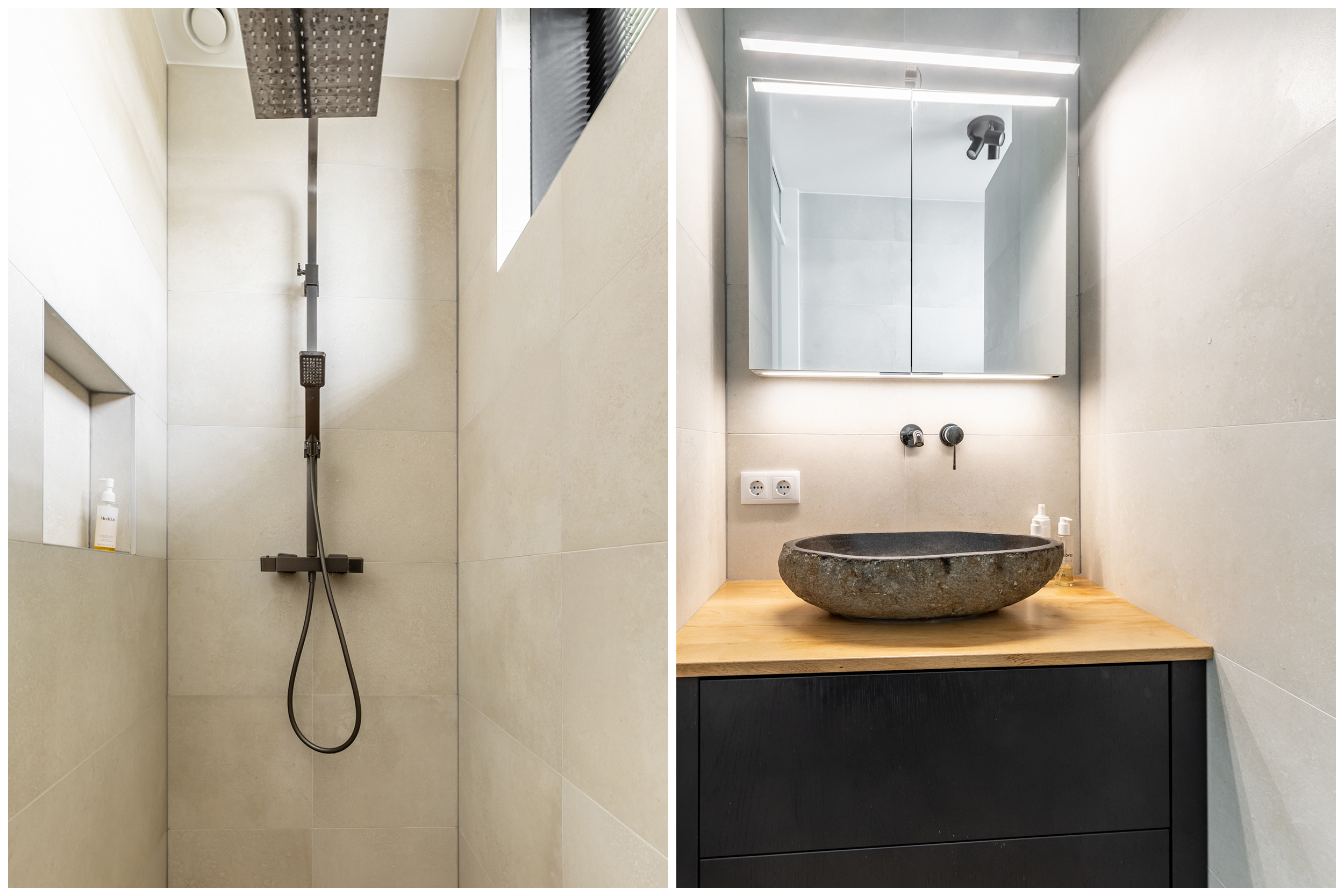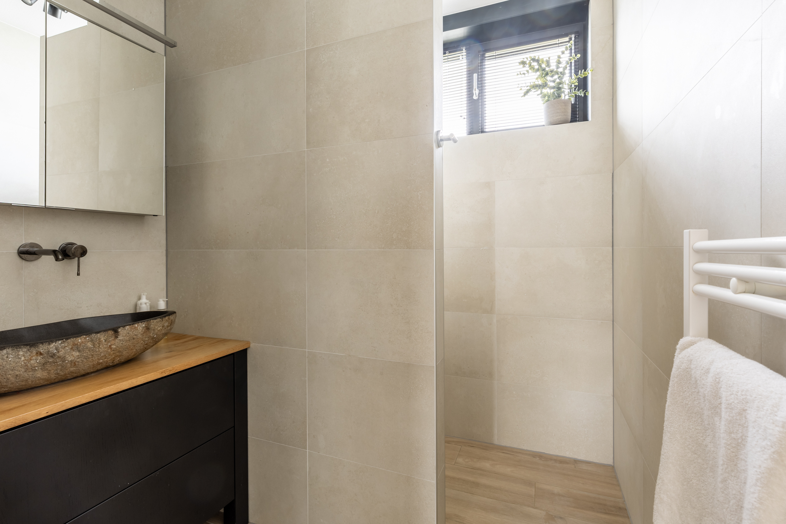De badkamer beschikt over grootformaat tegels in zachte natuurtinten, een inloopdouche met regendouche, en een robuuste natuurstenen waskom op een houten blad met daarboven een verlichte spiegelkast. Fraai, tijdloos en makkelijk in onderhoud.