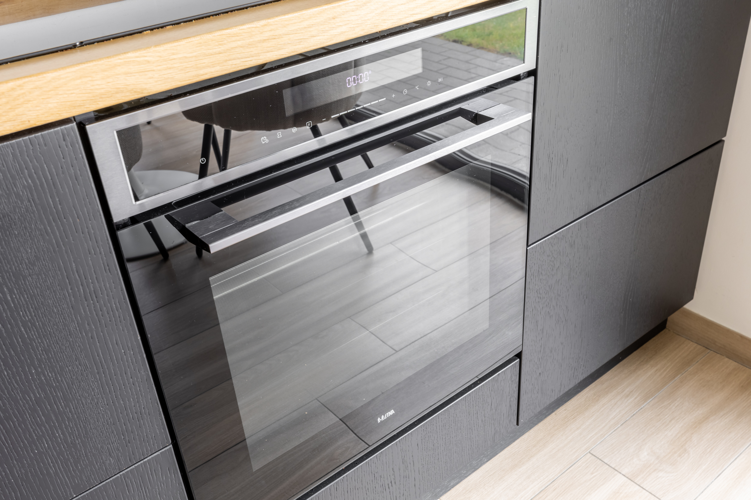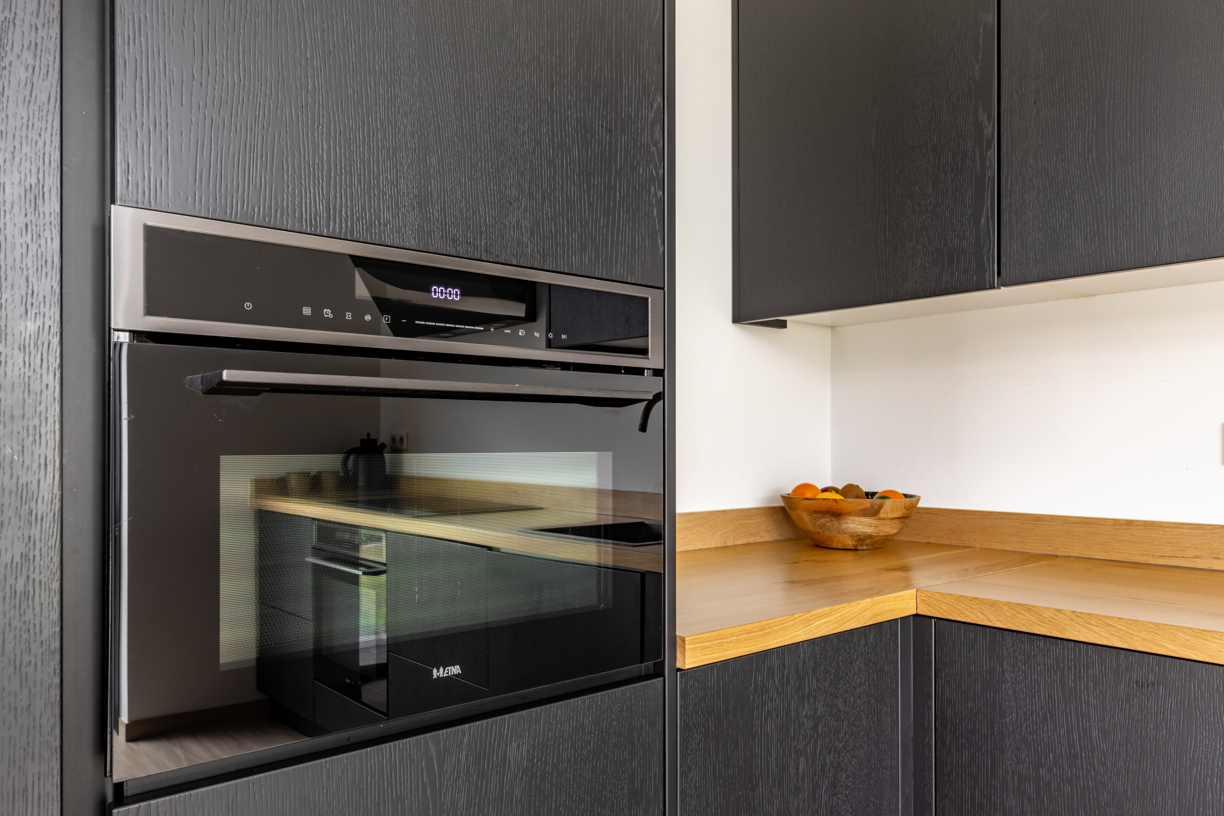 De uitgebreide keuken is een echte blikvanger: matzwarte fronten, een warm houten werkblad rondom en veel opbergruimte. De keuken beschikt over een inductiekookplaat, afzuigkap, combi-magnetron, oven, vaatwasser en een koel/vriescombinatie.