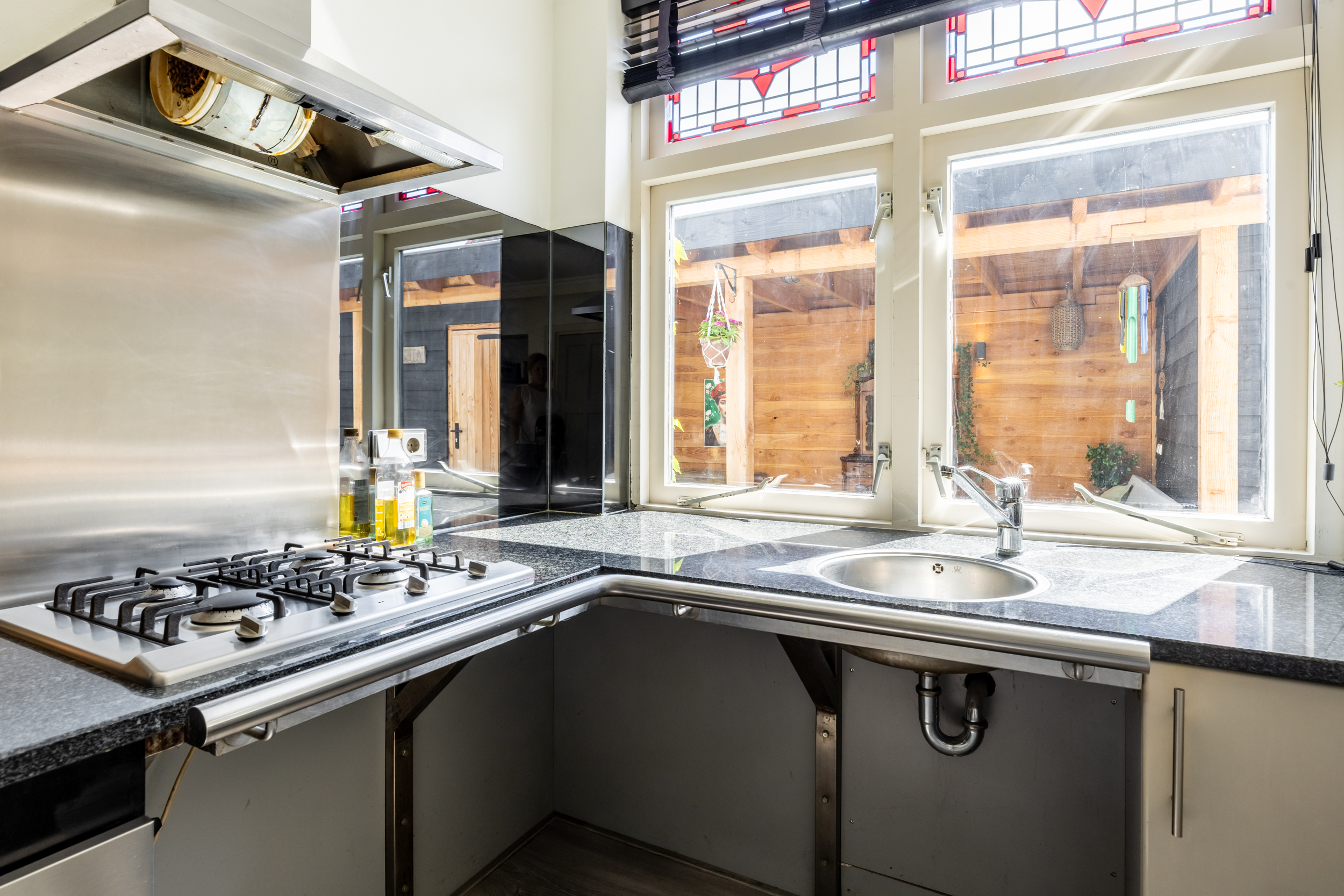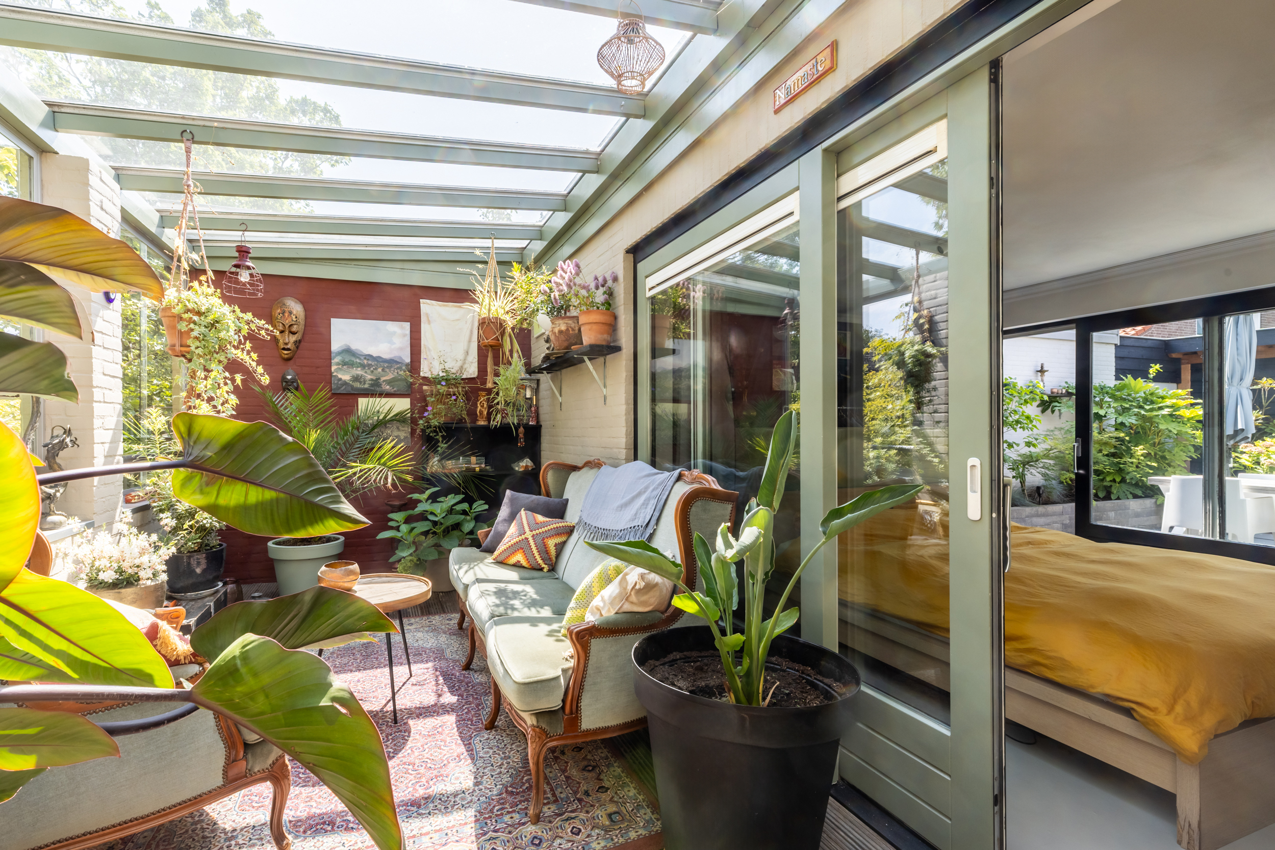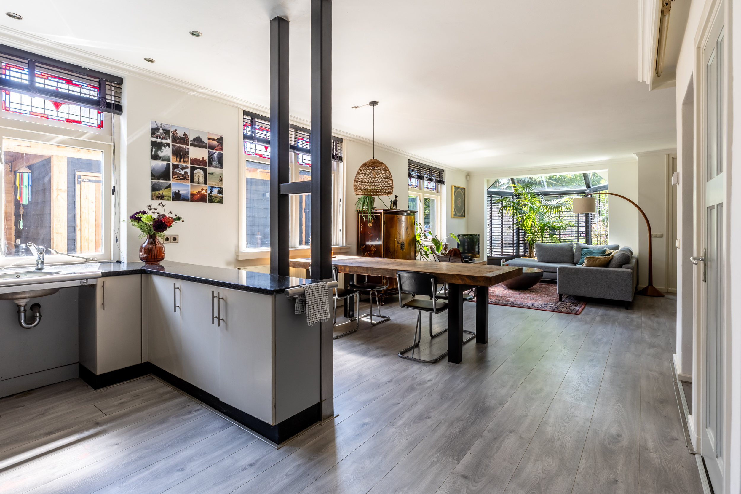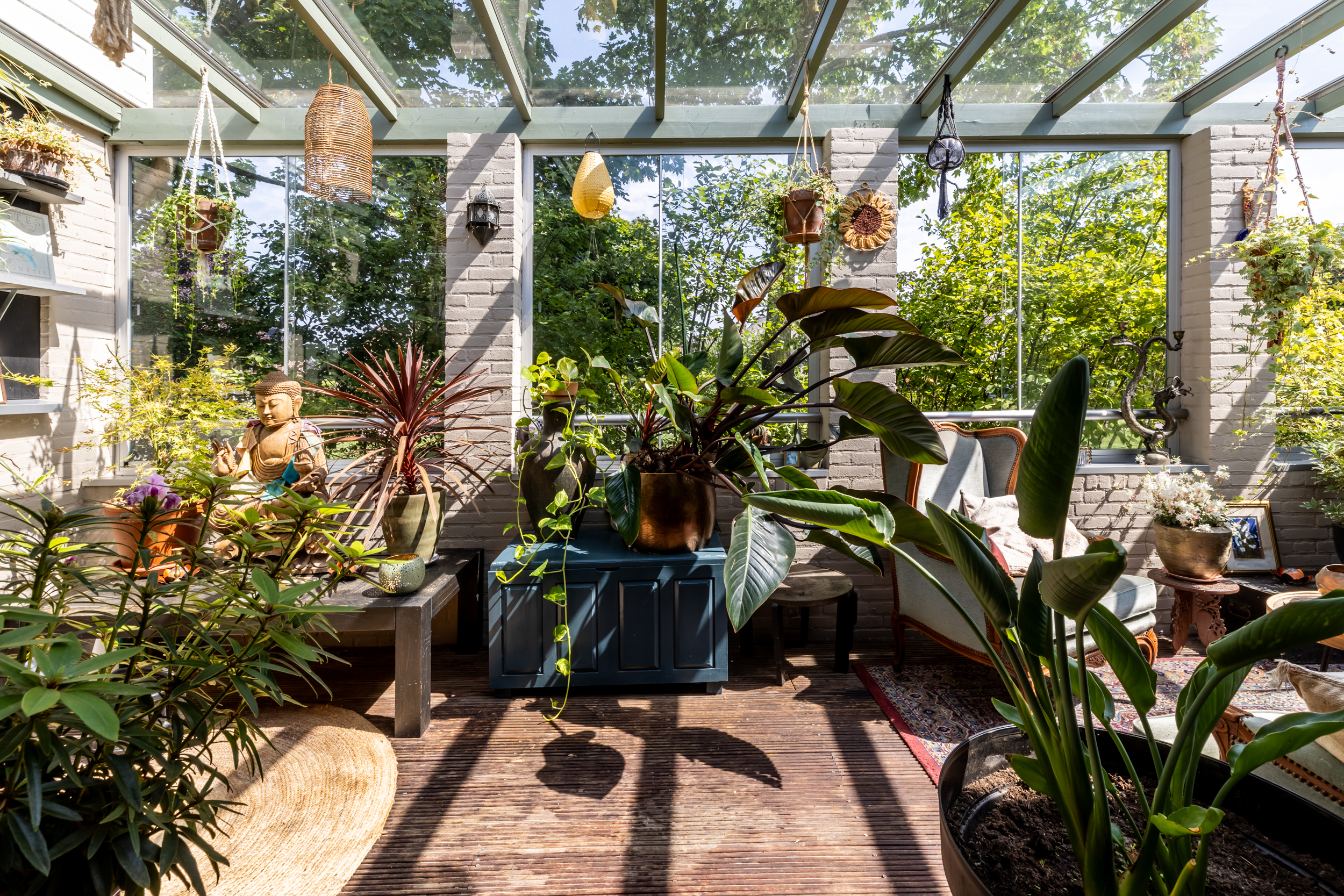 Via de voordeur betreedt u de woning en komt u direct terecht in een bijzonder ruime woonkamer. Hier is meer dan genoeg plek voor een royale zithoek én een grote eettafel. Dankzij de vele raampartijen en de sfeervolle glas-in-loodramen is het binnen heerlijk licht en warm. Aansluitend bevindt zich de open keuken, voorzien van meerdere kastruimtes en toegang tot een hal. Vanuit deze hal bereikt u de tuin, het toilet en de kast waar de cv-installatie hangt. Aan de achterzijde liggen royale ruimtes die momenteel als werkruimte dienen, ideaal voor een kantoor aan huis of extra slaapkamers. Ook de hoofdslaapkamer bevindt zich hier: ruim genoeg voor een tweepersoonsbed, voorzien van een inloopkast en directe toegang tot de tuin. Achter deze slaapkamer ligt bovendien een prachtige tuinkamer, perfect om even tot rust te komen.