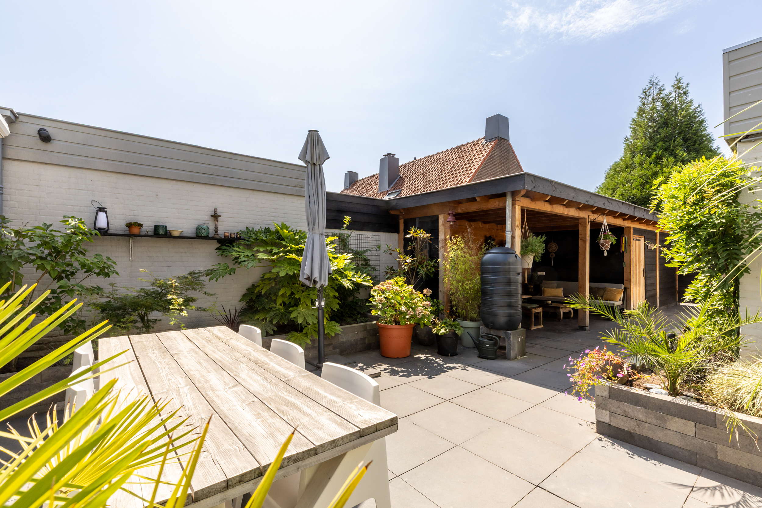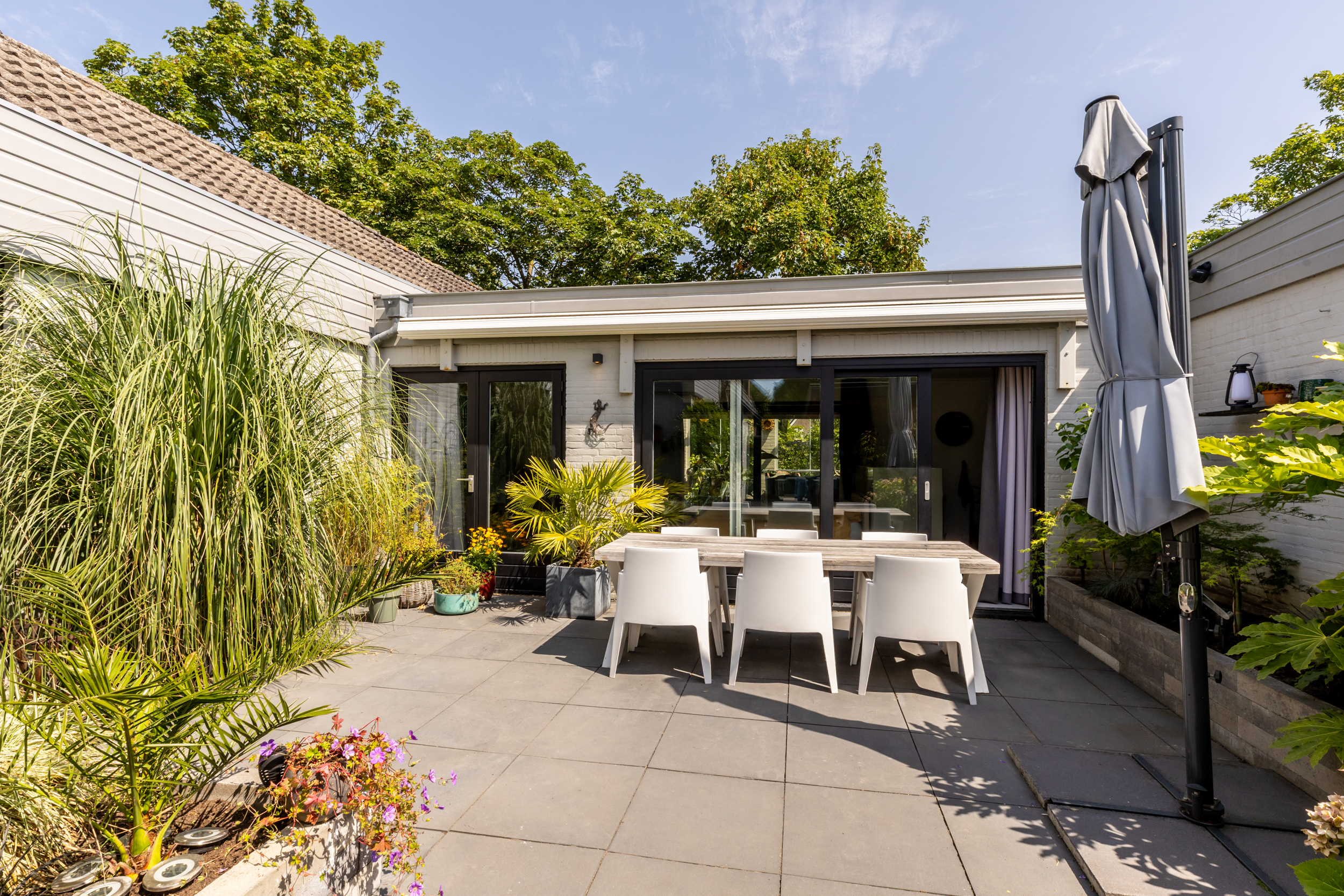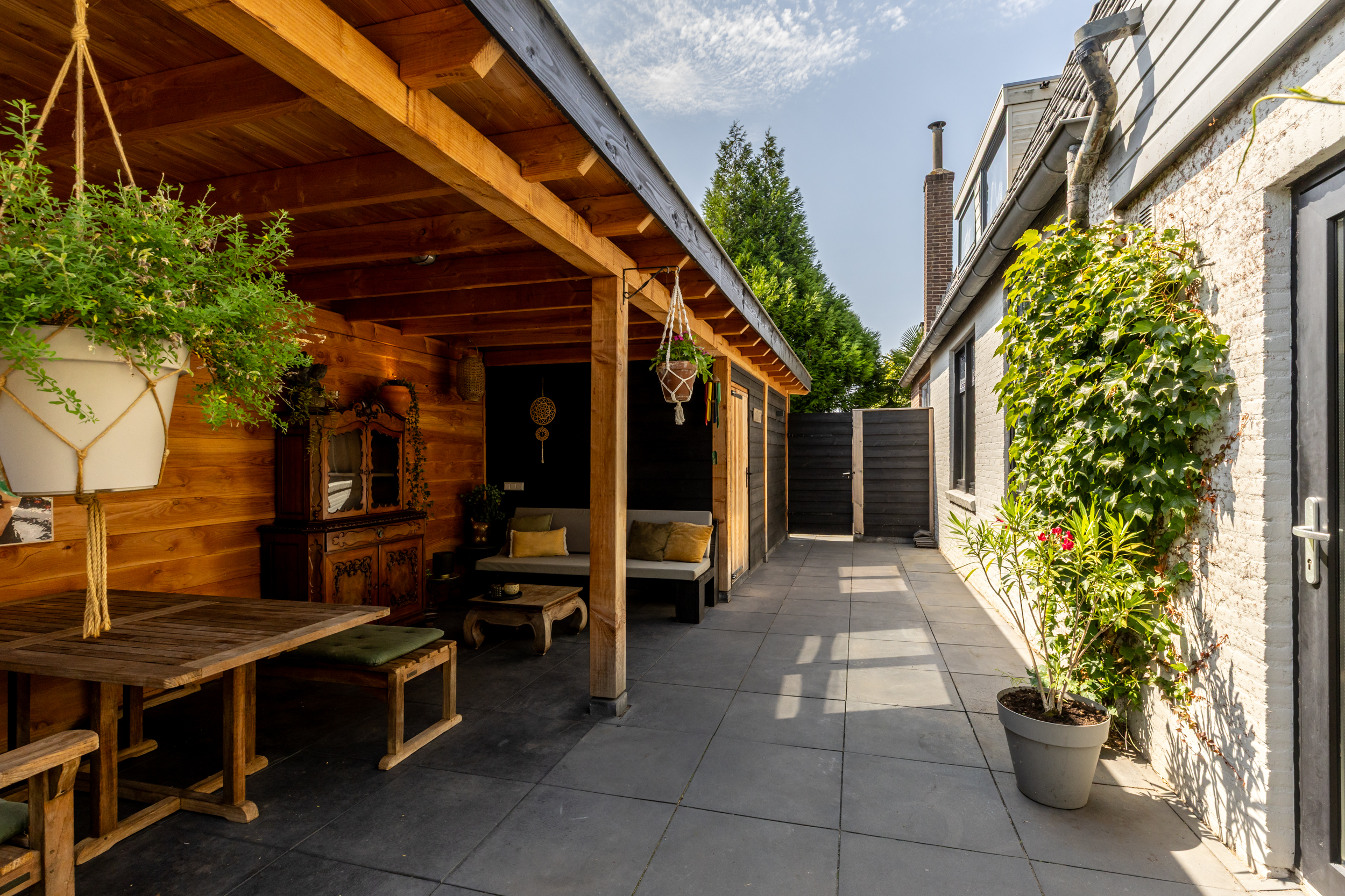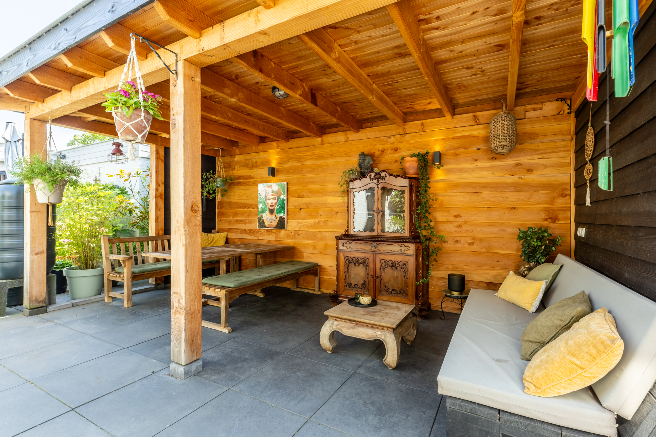 De heerlijke zijtuin is gericht op het zuiden, waardoor u de hele dag van de zon kunt genieten. Onder de overkapping is het goed toeven, bijvoorbeeld met een loungebank om lange zomeravonden door te brengen. Daarnaast is er een praktische berging aanwezig, perfect voor het stallen van fietsen en het opbergen van tuingereedschap. De tuin biedt zowel comfort als gemak, en vormt daarmee een verlengstuk van het woongenot binnen.