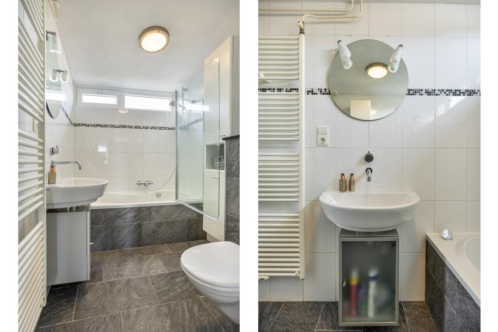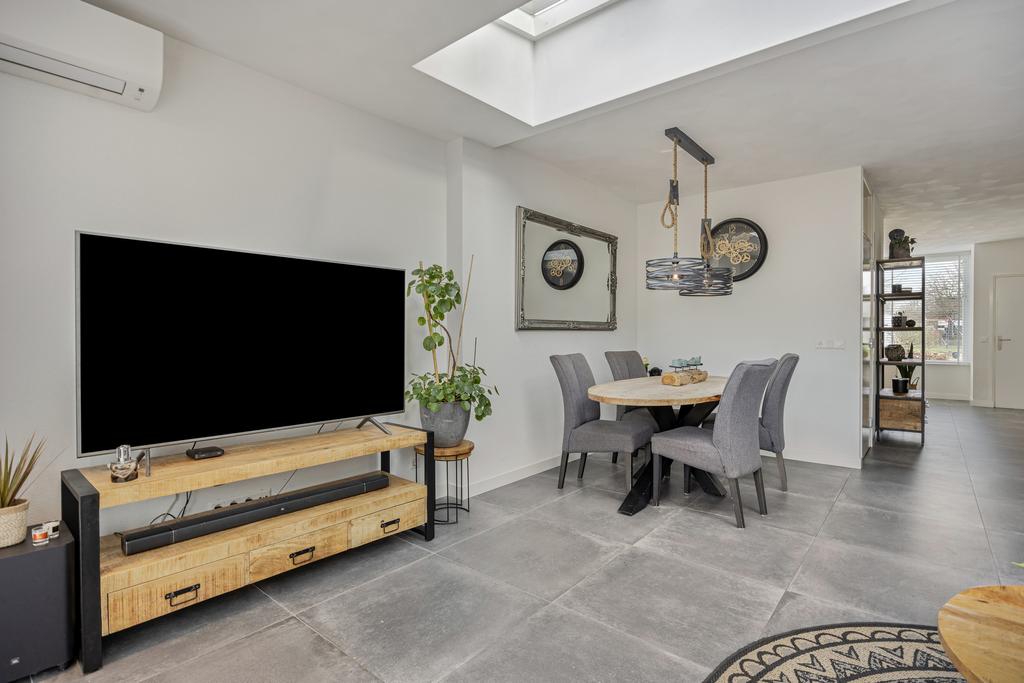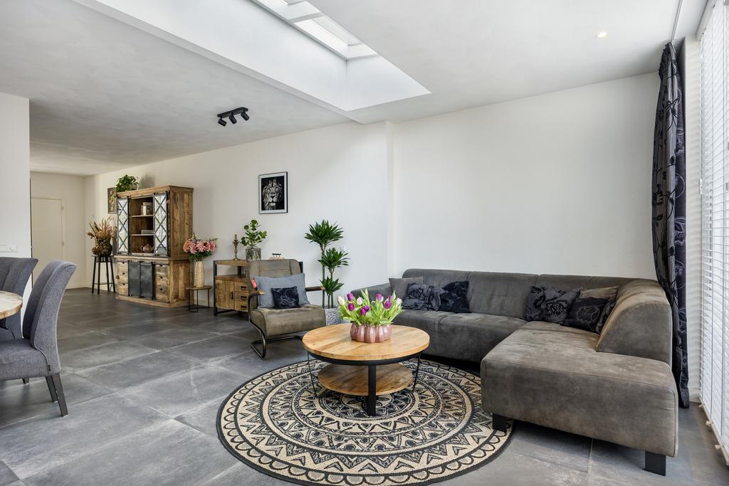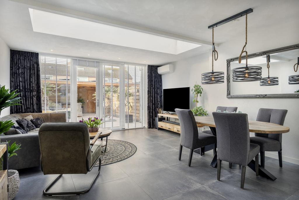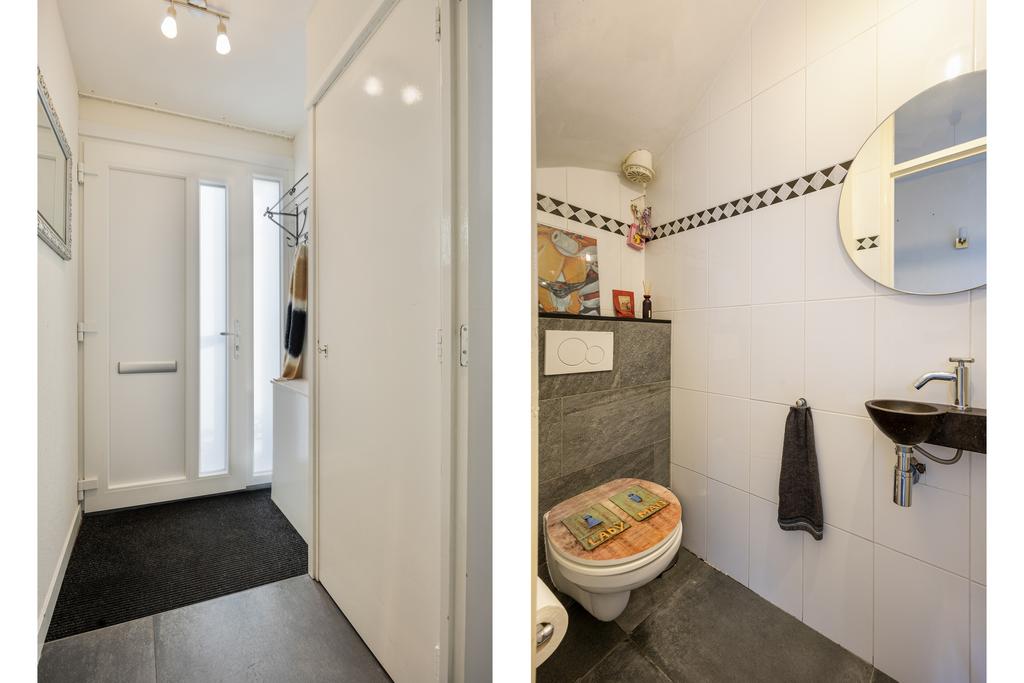 De woonkamer is met de verbouwing verplaatst naar de achterzijde van de woning en heeft toegang tot de zonnige achtertuin middels zowel de dubbele tuindeuren. Door de uitbouw is de ruimte goed van formaat. Deze is ook nog eens lekker ligt door de grote raampartijen en lichtstraat. In de zomer is het goed koel te houden doormiddel van de airconditioning. In het midden van de woning is een portaal gesitueerd waar het trappenhuis en toilet zich bevinden. De toiletruimte is in neutrale kleurstelling betegeld en voorzien van een wandcloset en fonteintje.