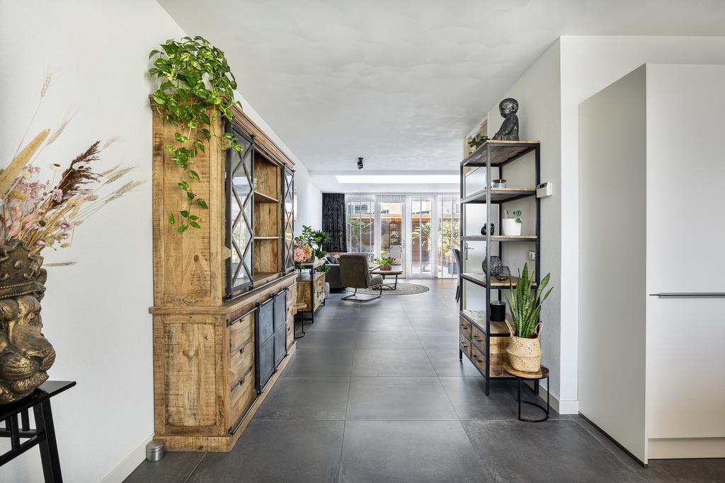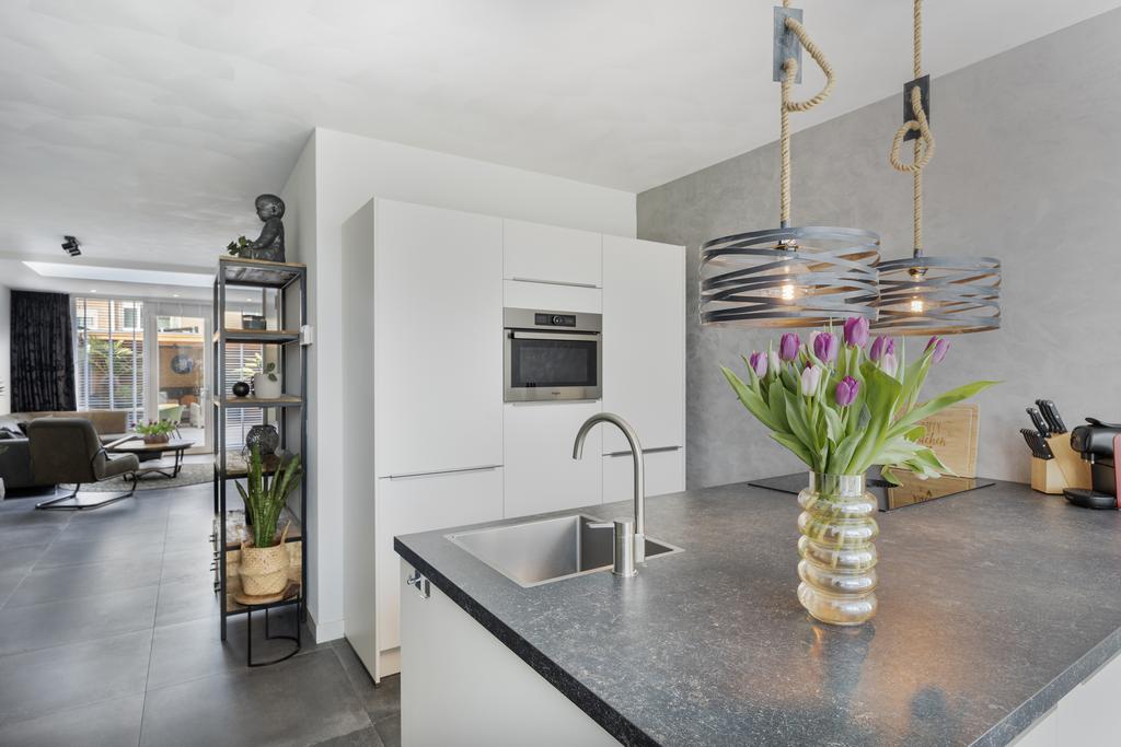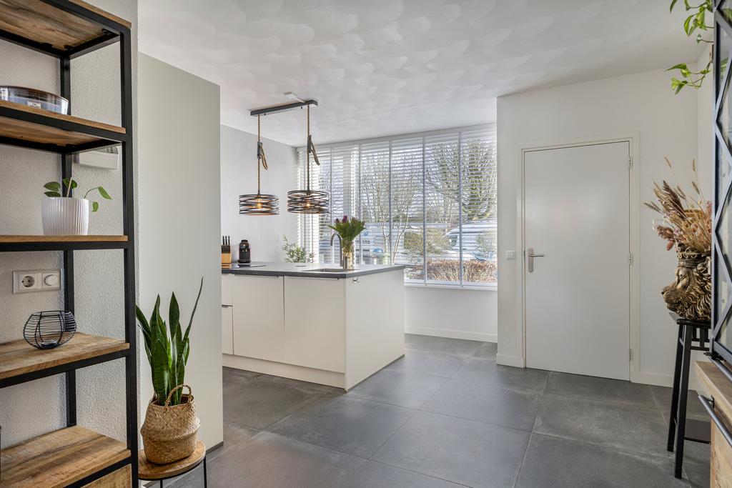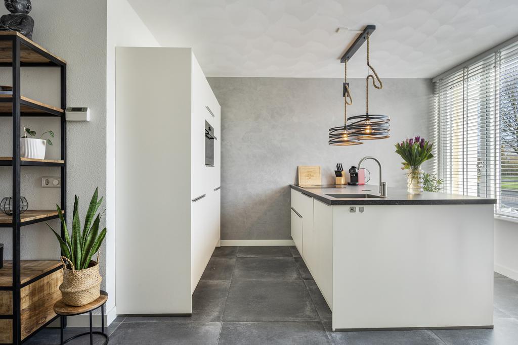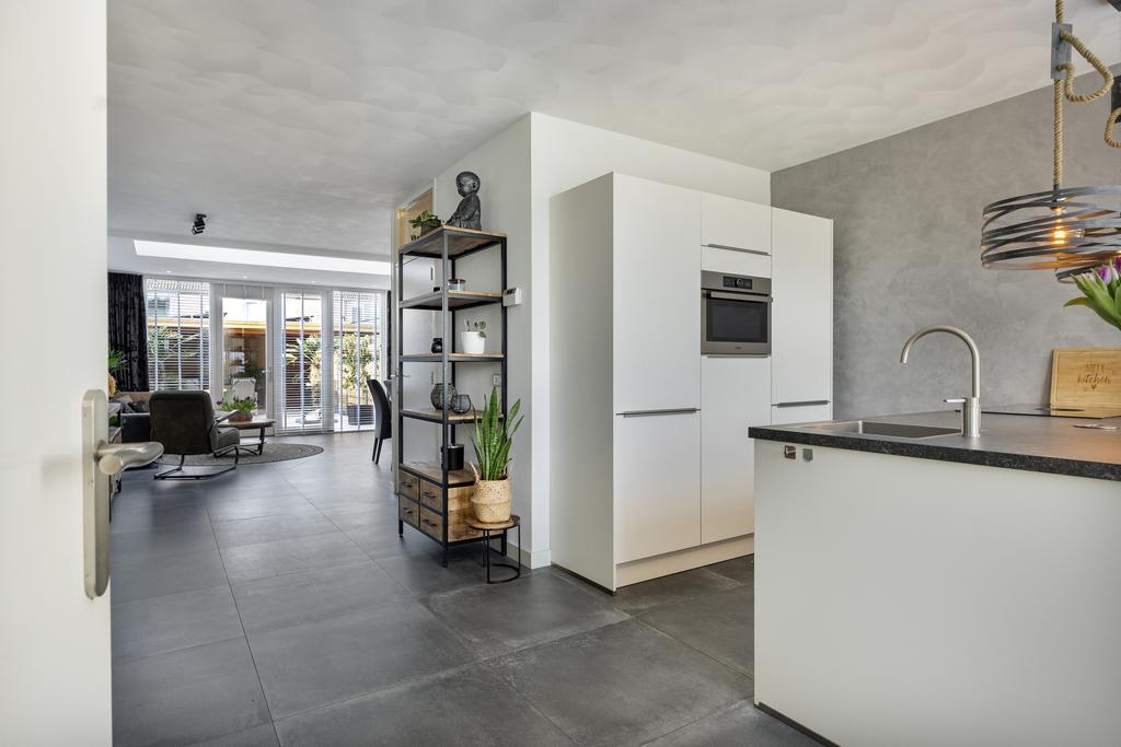 We betreden de woning aan de voorzijde, waar we in de entree de garderobe en meterkast aantreffen. Vanuit de entree is er toegang tot de woonkamer en de keuken. De begane grond heeft een moderne uitstraling door de strakke wanden en gestucte plafonds. Op de vloer ligt een nette grijze tegel met vloerverwarming. De huidige eigenaren hebben de woning grondig verbouwd en de keuken naar de voorzijde van de woning verplaatst. Vanuit hier heb je mooi vrij zicht over het plantsoen aan de voorzijde van de woning. De keuken heeft een apparatenwand met inbouwapparatuur en een kookeiland met luxe Bora inductiekookplaat met downdraft afzuiging. Daarnaast nog de spoelbak. De keuken is in lichte kleurstelling en uitgerust met een kunststof werkblad, combi-oven/ magnetron, koelkast, vriezer en vaatwasser.