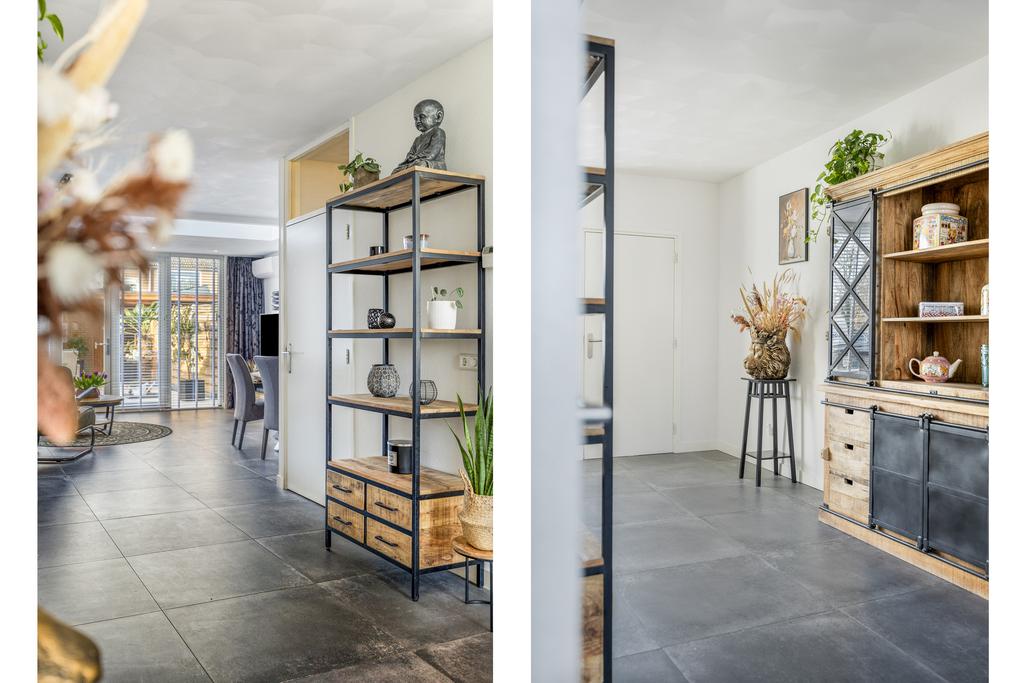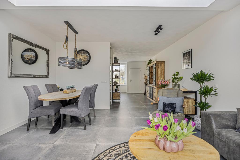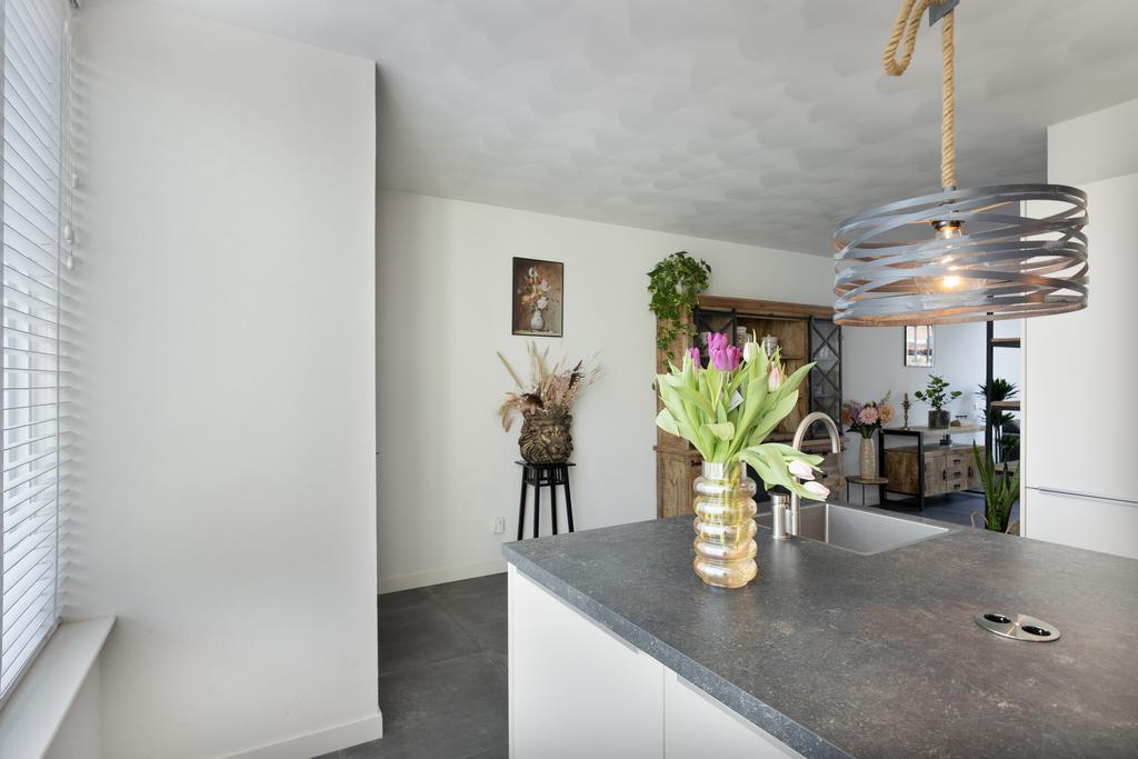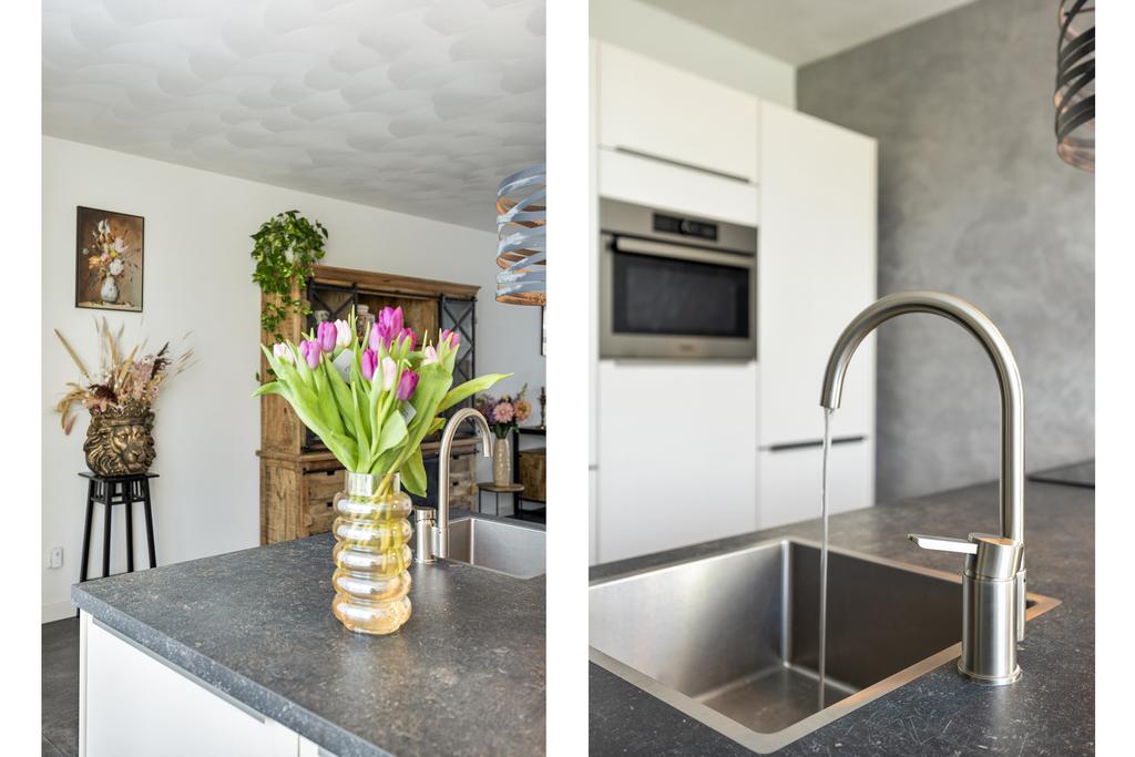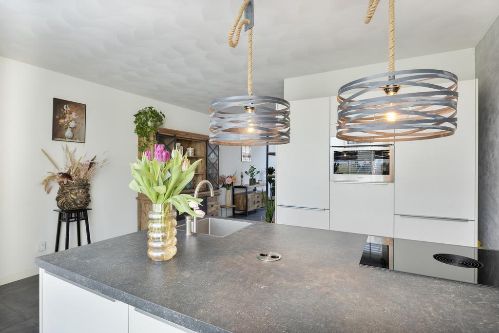 We betreden de woning aan de voorzijde, waar we in de entree de garderobe en meterkast aantreffen. Vanuit de entree is er toegang tot de woonkamer en de keuken. De begane grond heeft een moderne uitstraling door de strakke wanden en gestucte plafonds. Op de vloer ligt een nette grijze tegel met vloerverwarming. De huidige eigenaren hebben de woning grondig verbouwd en de keuken naar de voorzijde van de woning verplaatst. Vanuit hier heb je mooi vrij zicht over het plantsoen aan de voorzijde van de woning. De keuken heeft een apparatenwand met inbouwapparatuur en een kookeiland met luxe Bora inductiekookplaat met downdraft afzuiging. Daarnaast nog de spoelbak. De keuken is in lichte kleurstelling en uitgerust met een kunststof werkblad, combi-oven/ magnetron, koelkast, vriezer en vaatwasser.