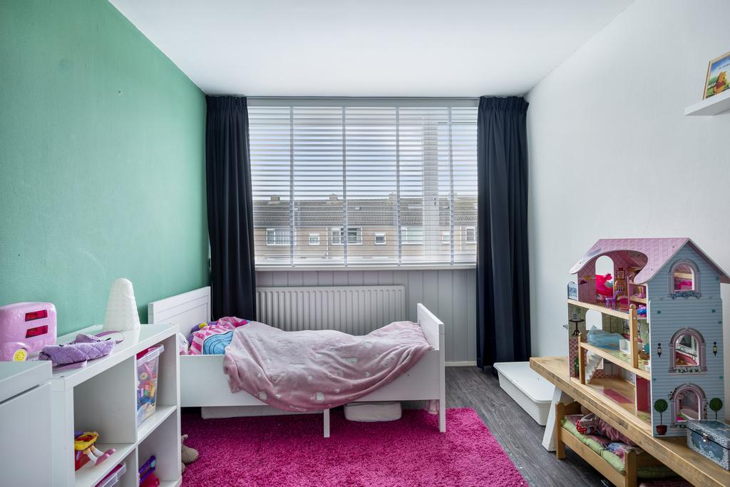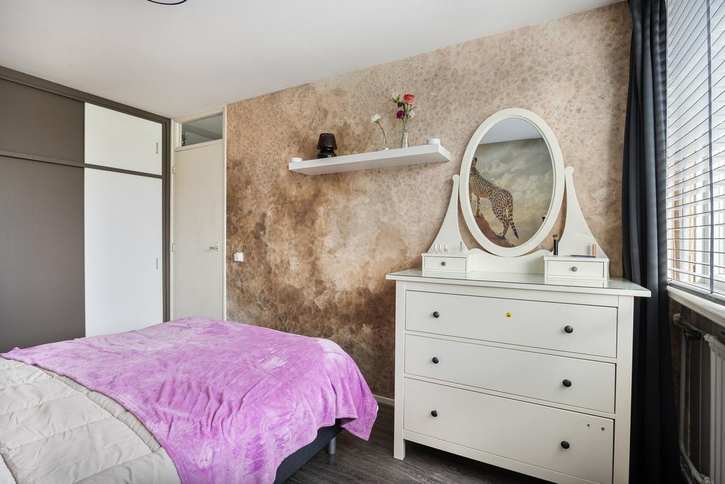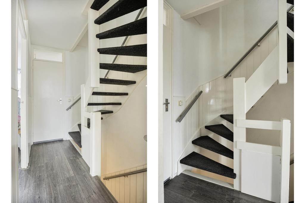 De overloop, welke voorzien is van een vaste kast, biedt toegang tot drie slaapkamers, de badkamer en de trapopgang naar de 2e verdieping. Twee slaapkamers zijn gelegen aan de voorzijde en één aan de achterzijde. De slaapkamers aan de voorzijde is voorzien van een vaste kastenwand. De badkamer is in lichte kleuren afgewerkt. Het sanitair is wit van kleur en bestaat uit een ligbad, toilet, wastafel met onderkast en een handdoekenradiator.