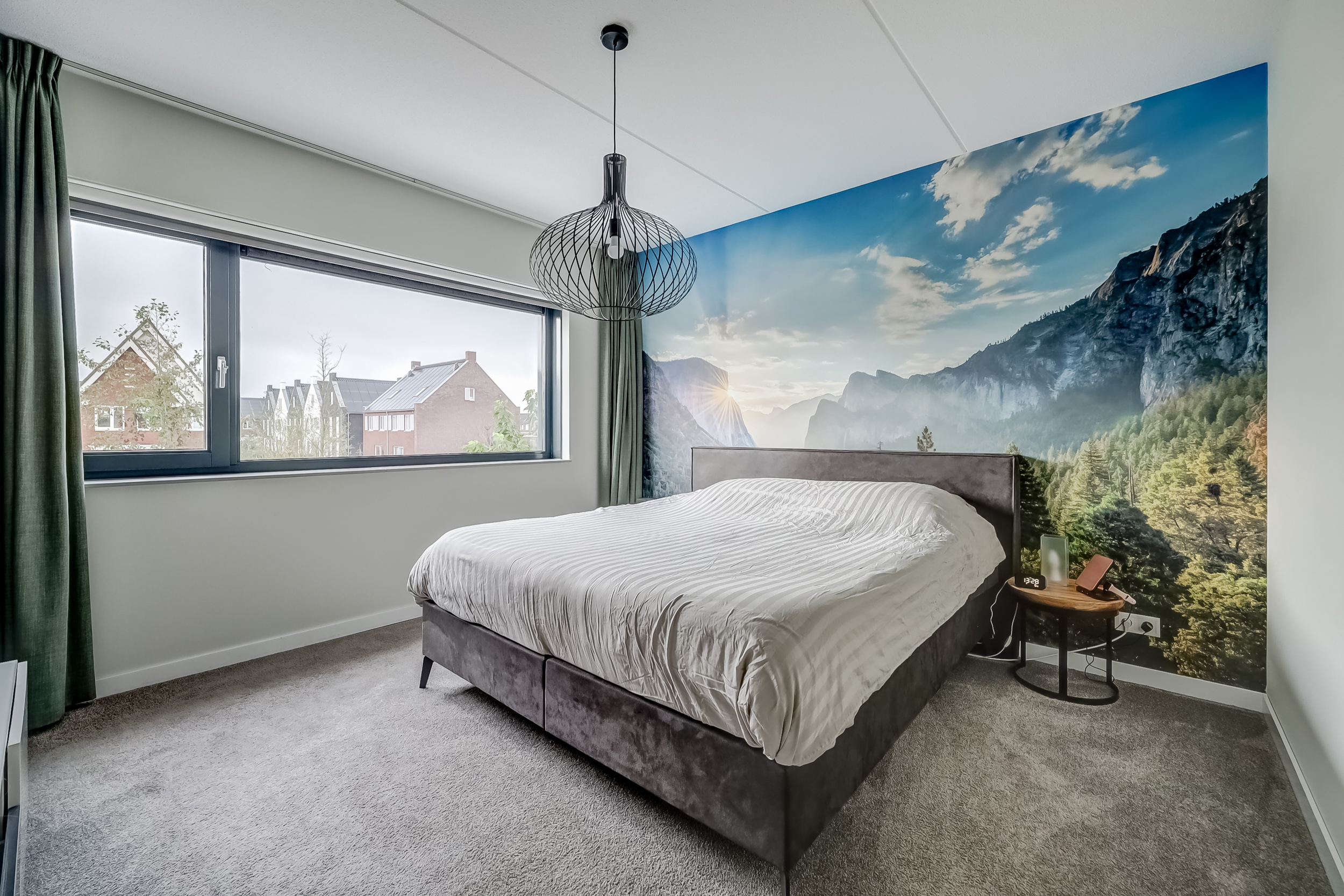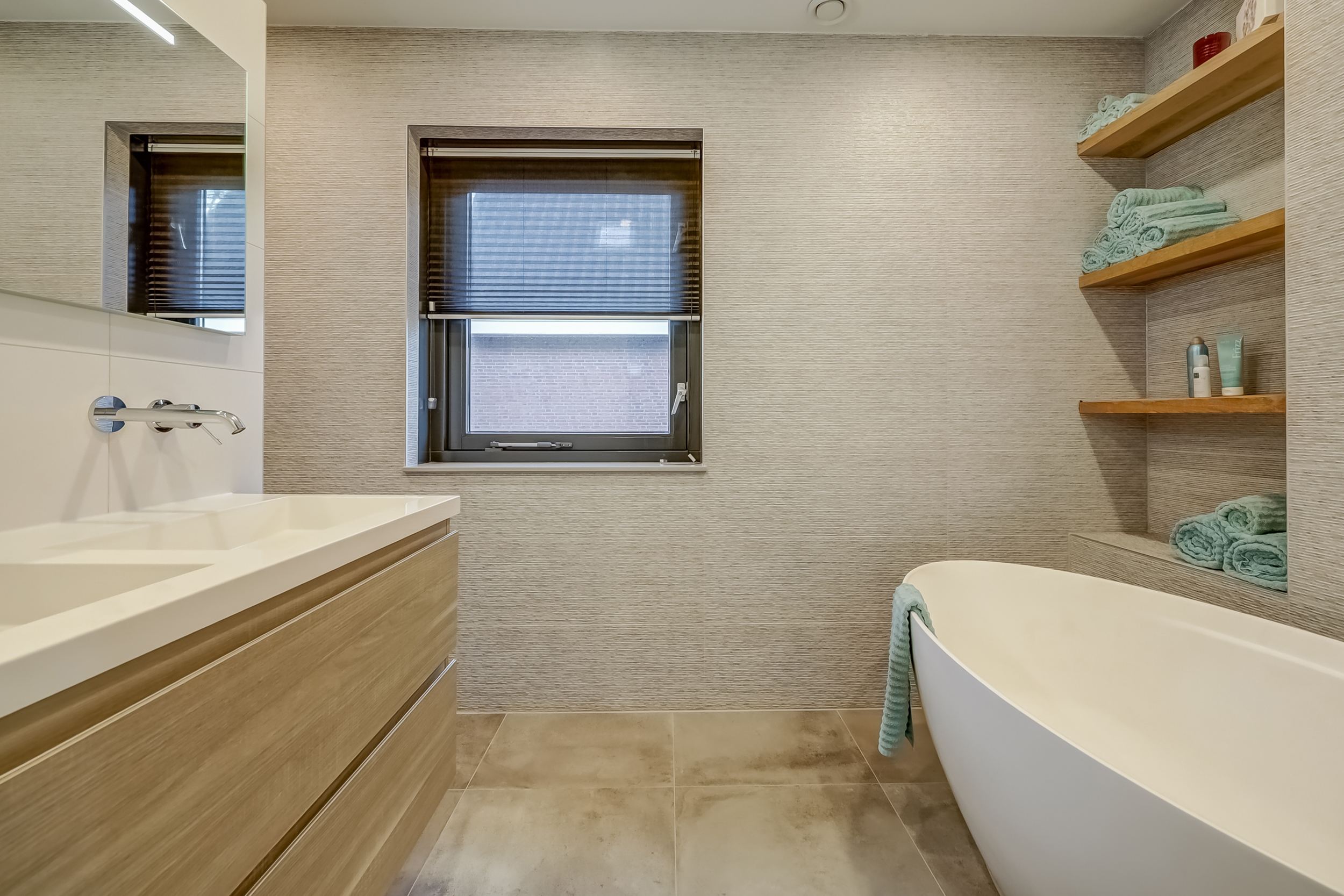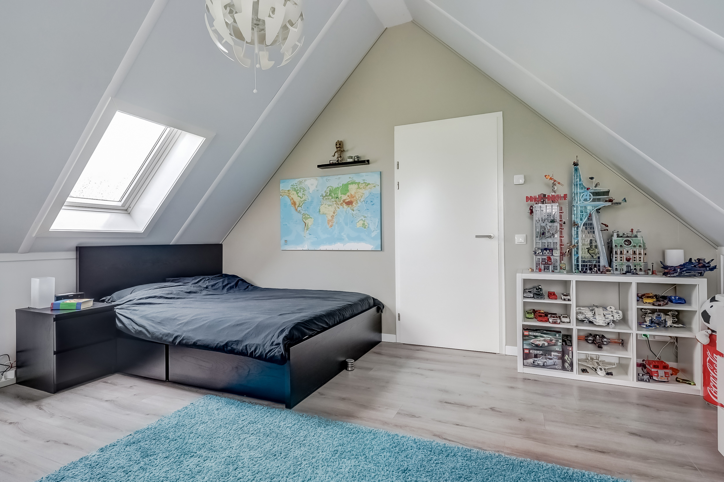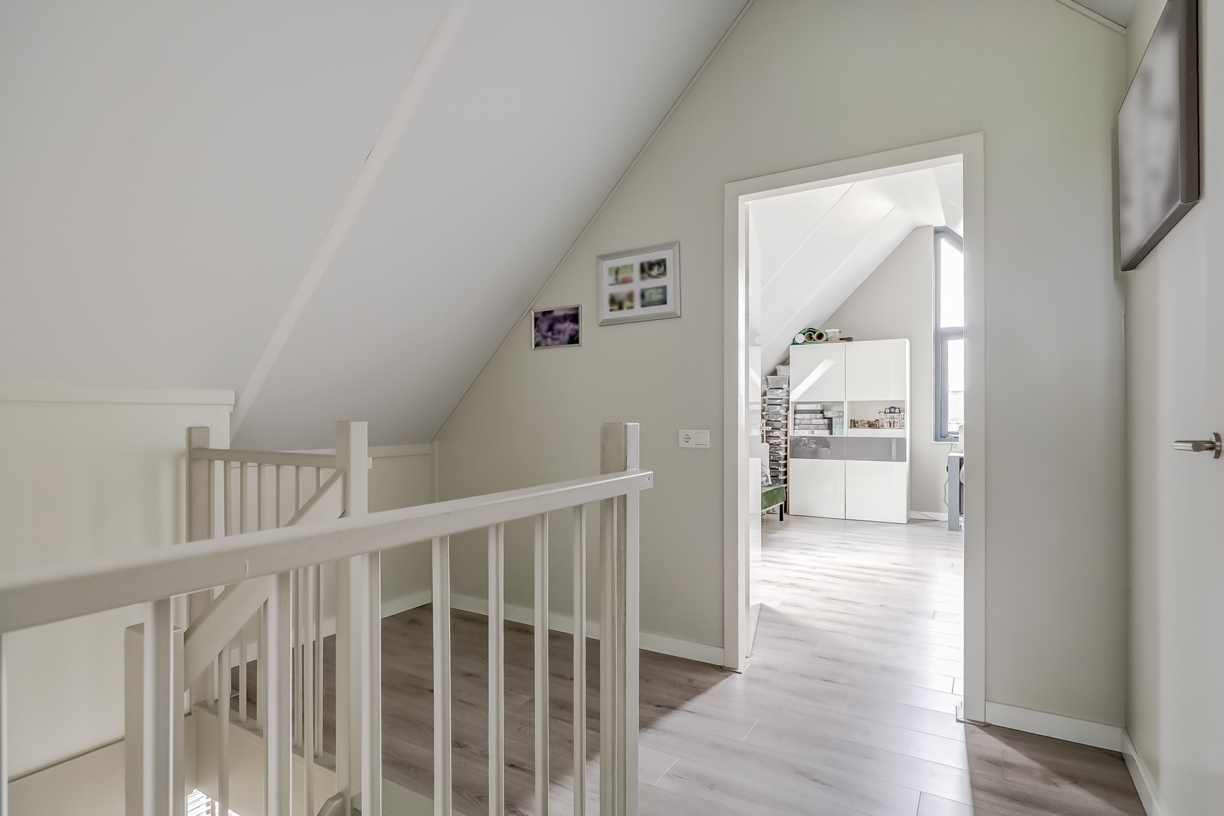 Via de trap in de entreehal bereik je de eerste verdieping. De overloop geeft toegang tot vier slaapkamers, de badkamer en een separaat toilet. De hoofdslaapkamer is ruim van formaat, biedt plaats aan een groot bed en is voorzien van een grote inloopkast. De twee slaapkamers aan de voorzijde zijn ideaal als kinderkamer, met genoeg ruimte voor een tweepersoonsbed en een bureau. De vierde slaapkamer leent zich ook uitstekend als kantoorruimte of hobbykamer. De badkamer is modern afgewerkt en uitgerust met een dubbele wastafel met meubel, een ligbad en een ruime inloopdouche.