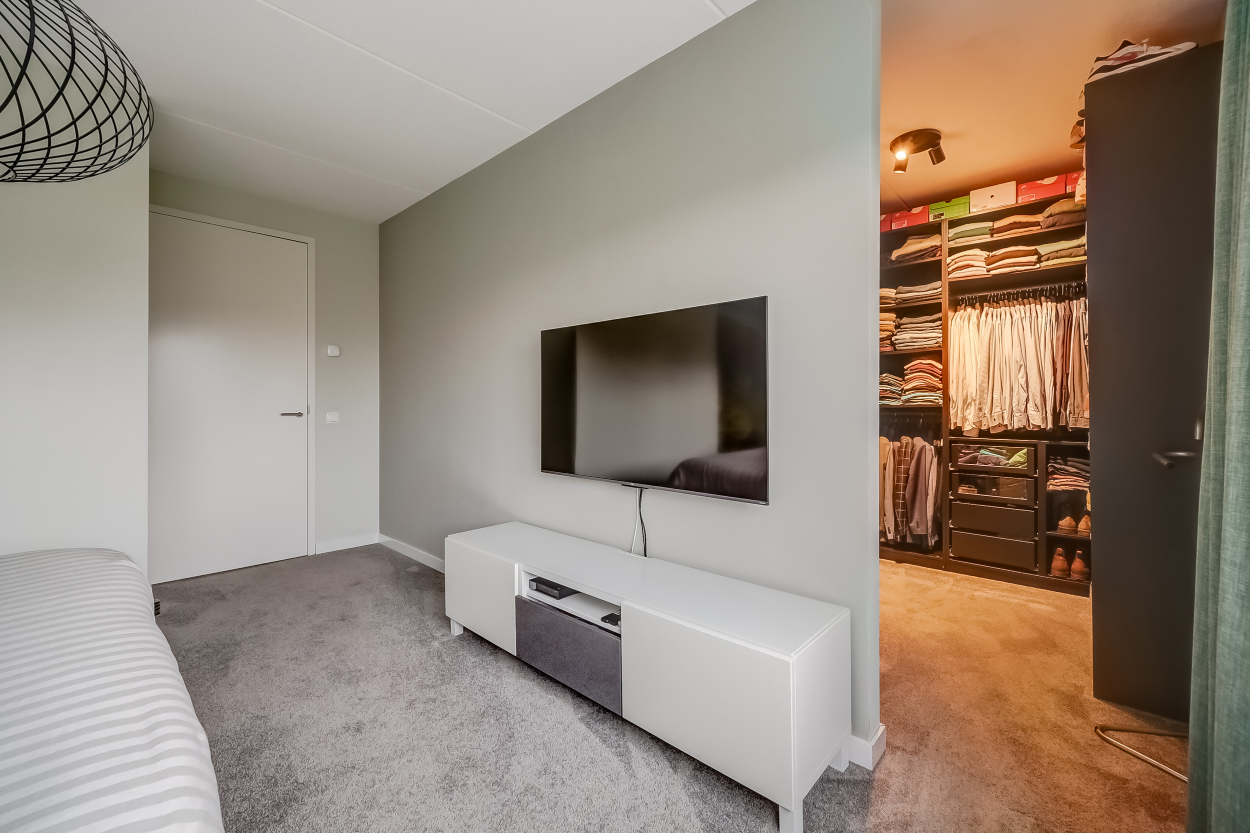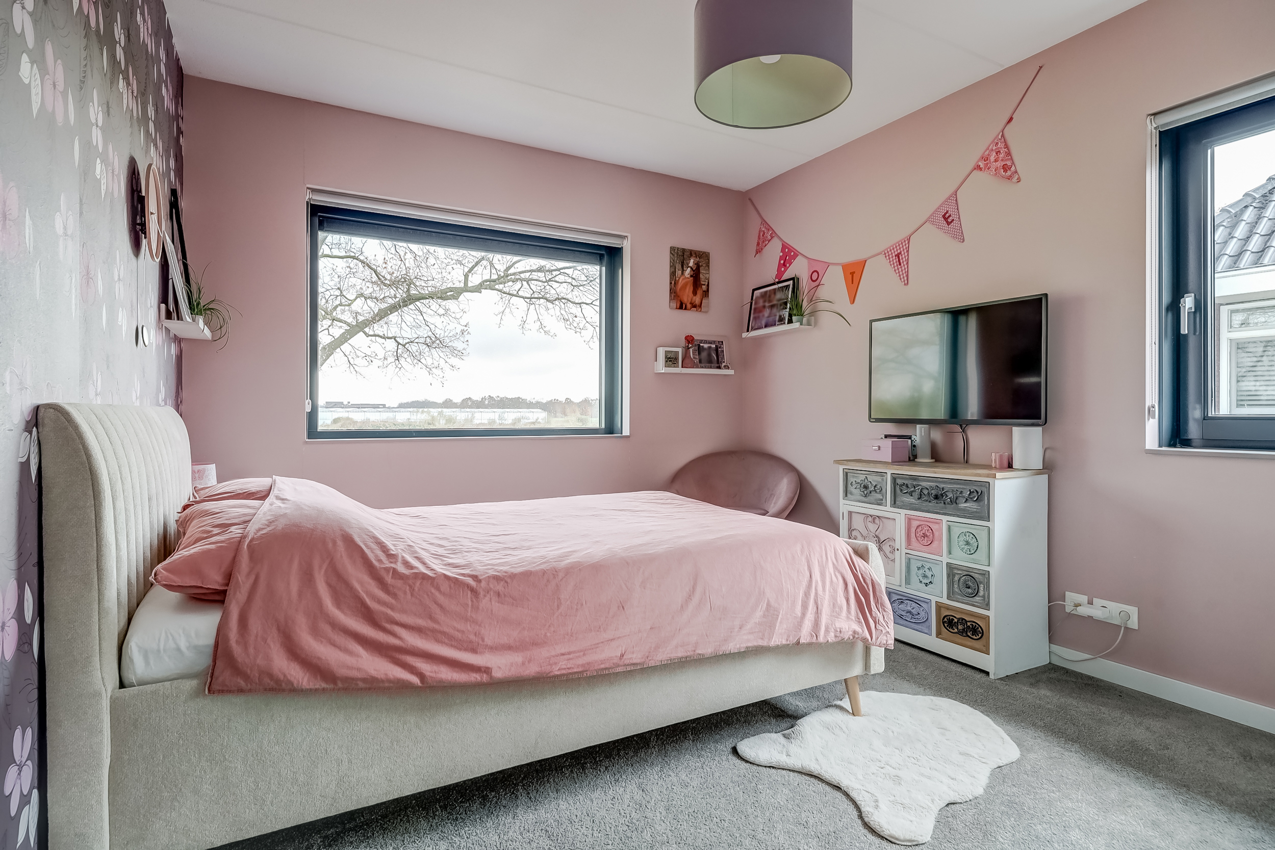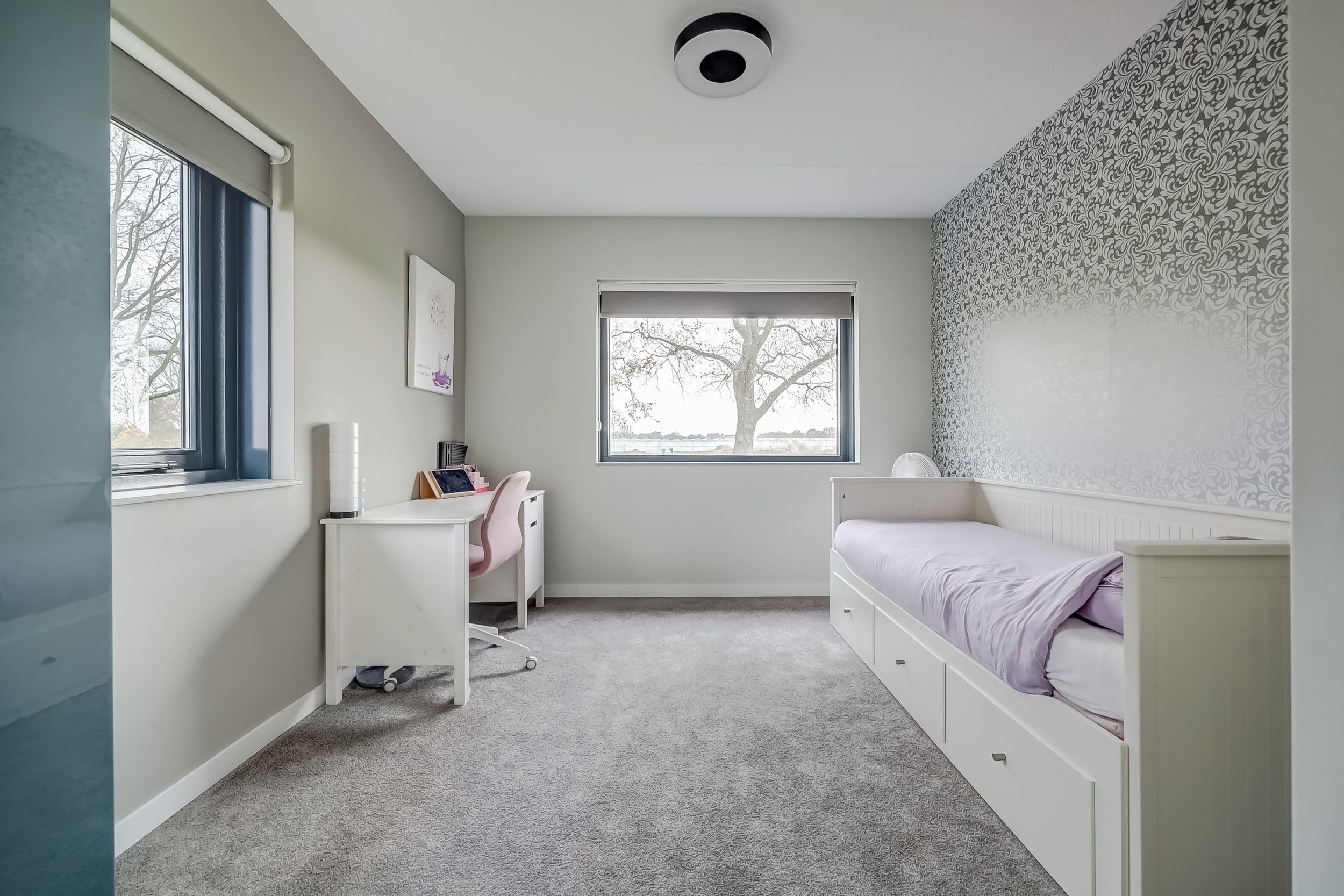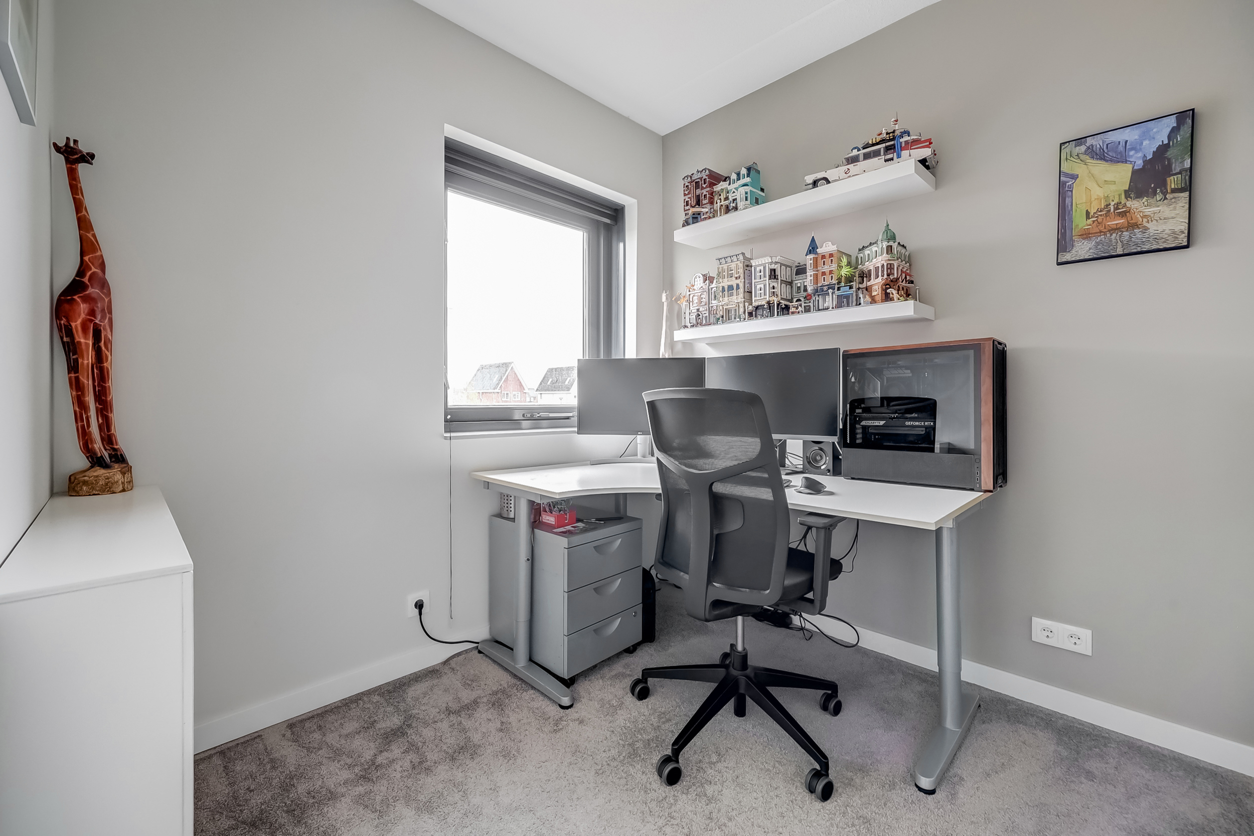 Via de trap in de entreehal bereik je de eerste verdieping. De overloop geeft toegang tot vier slaapkamers, de badkamer en een separaat toilet. De hoofdslaapkamer is ruim van formaat, biedt plaats aan een groot bed en is voorzien van een grote inloopkast. De twee slaapkamers aan de voorzijde zijn ideaal als kinderkamer, met genoeg ruimte voor een tweepersoonsbed en een bureau. De vierde slaapkamer leent zich ook uitstekend als kantoorruimte of hobbykamer. De badkamer is modern afgewerkt en uitgerust met een dubbele wastafel met meubel, een ligbad en een ruime inloopdouche.