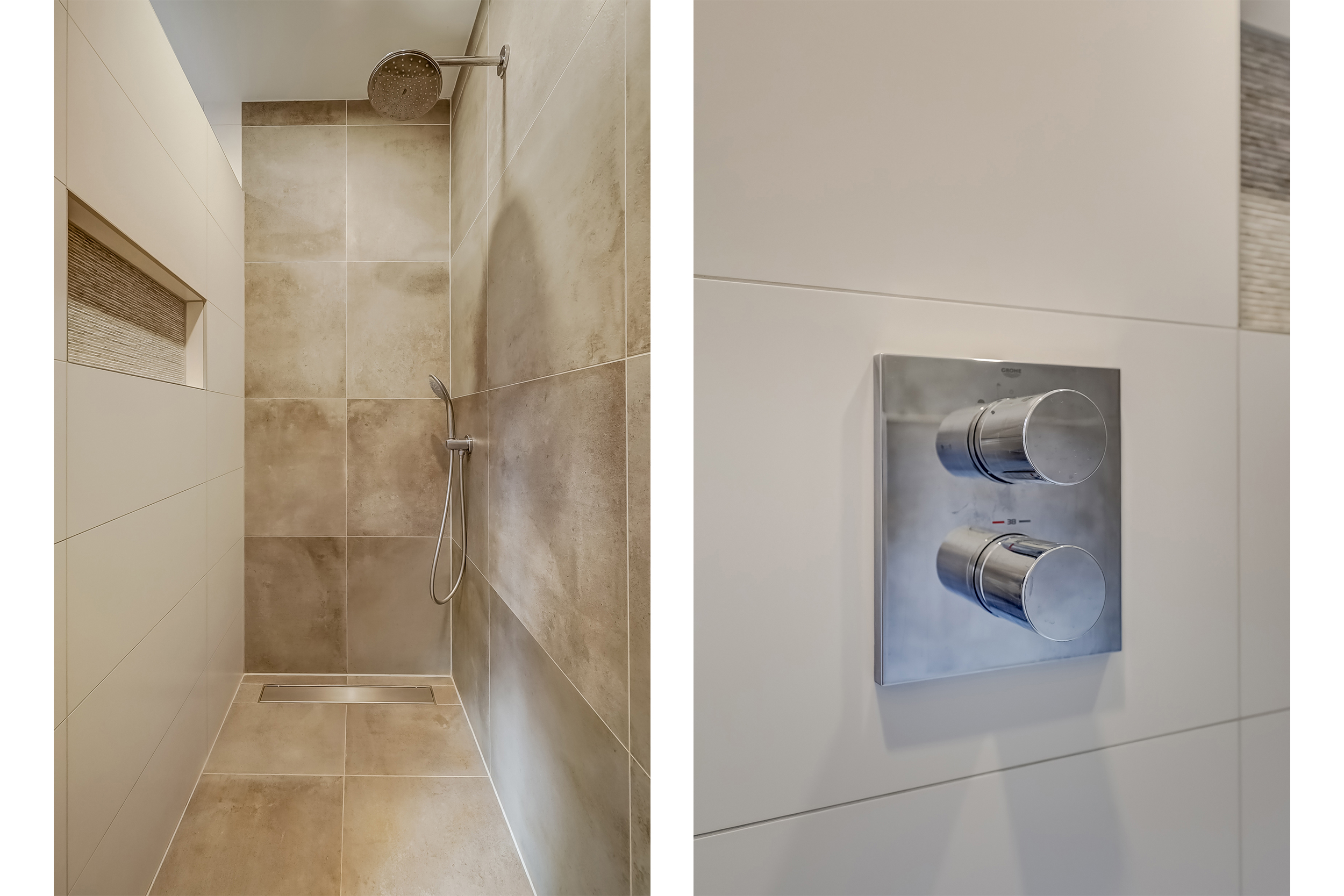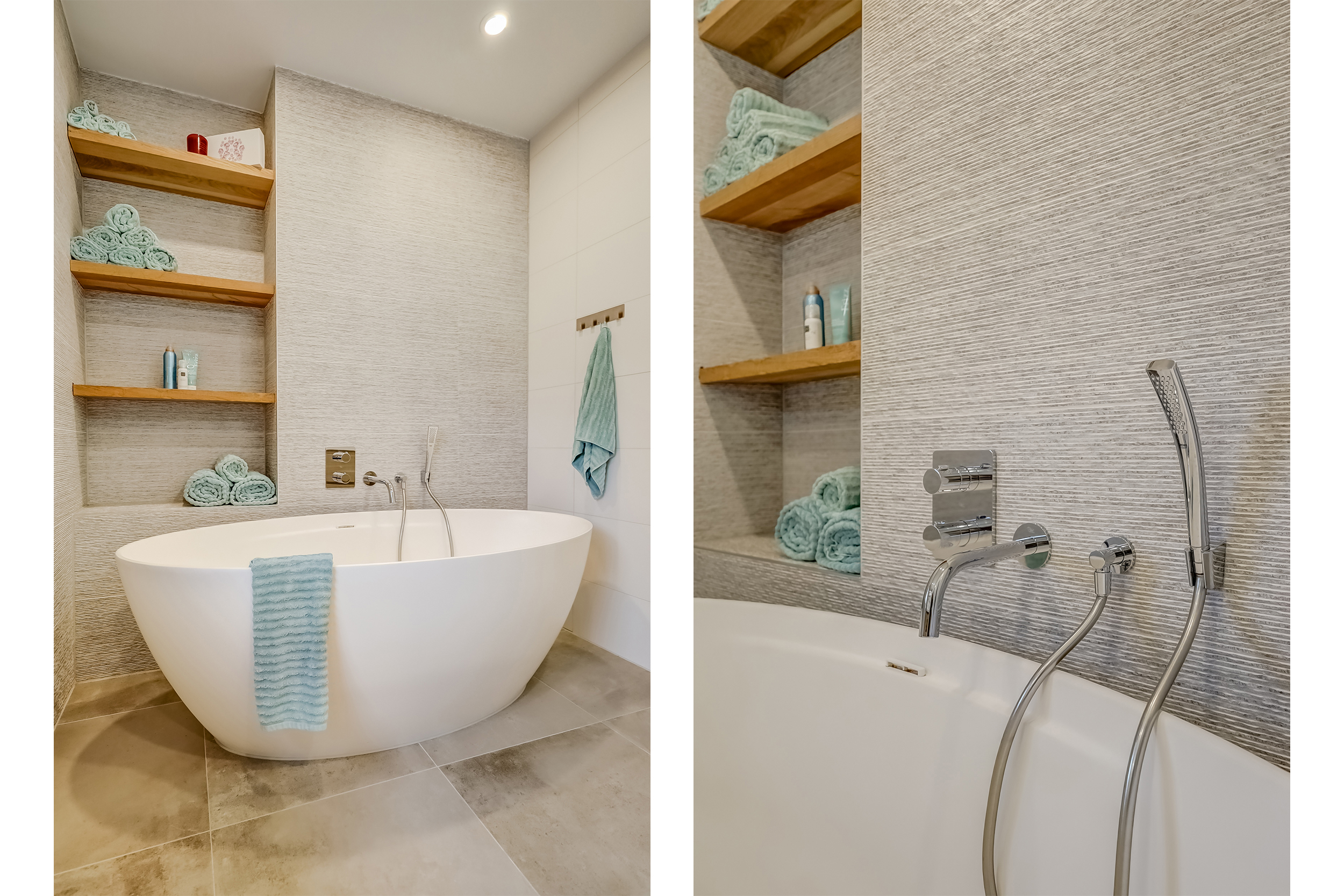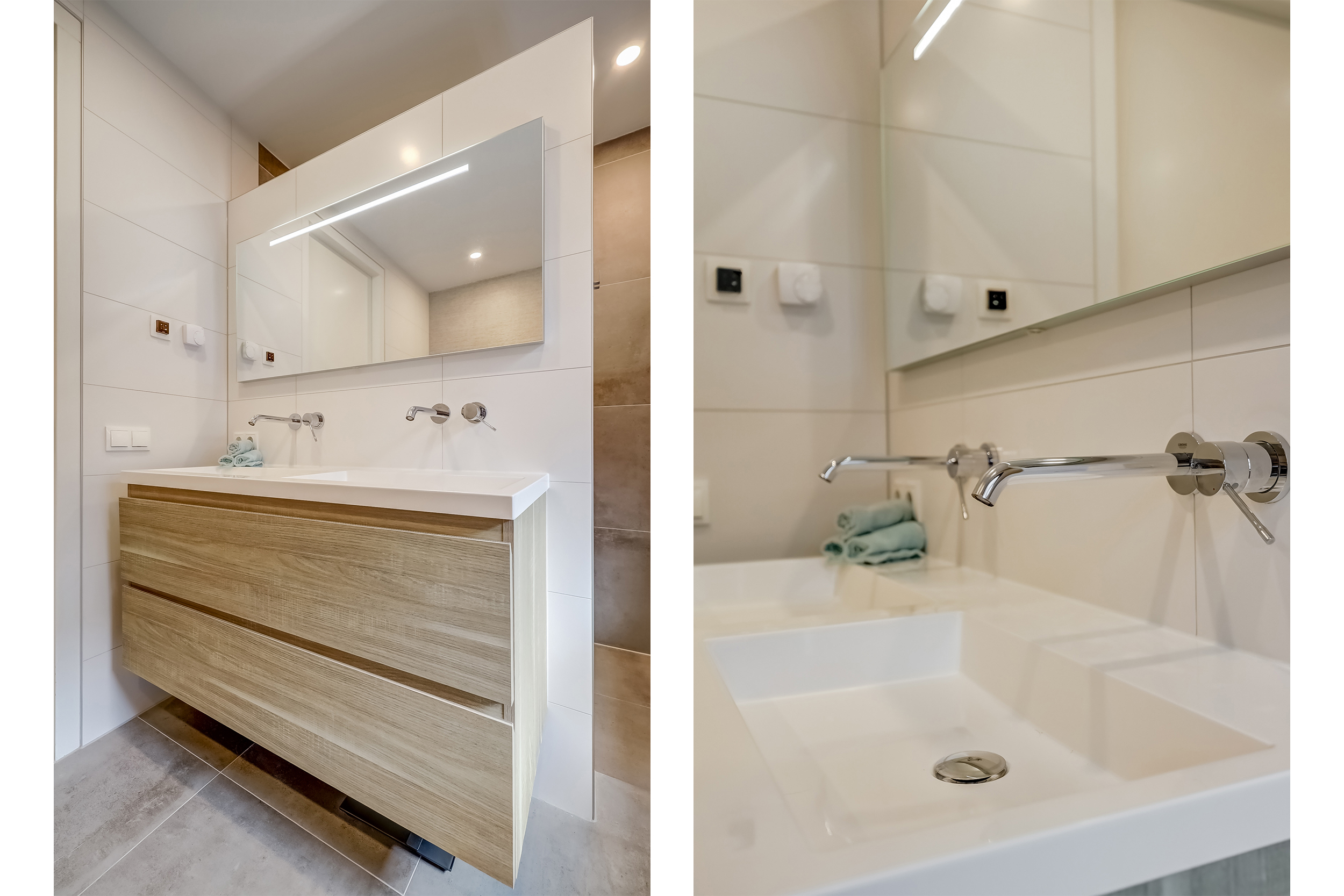 - Ligbad, dubbele wastafel, wastafelmeubel en inloopdouche