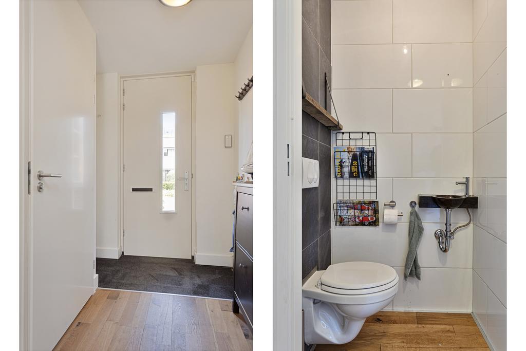 Hal/entree met toiletruimte, meterkast, en toegang tot de sfeervolle woonkamer die voorzien is van grote raampartijen vanuit de serre waardoor er veel natuurlijke lichtinval is.