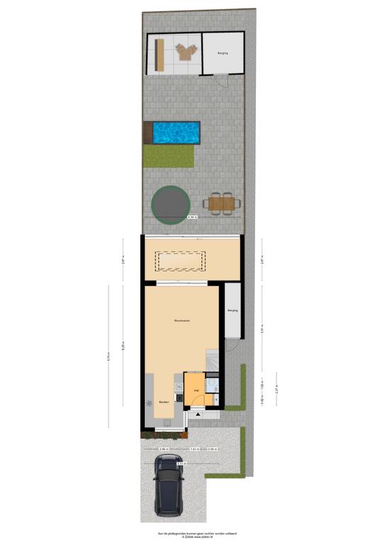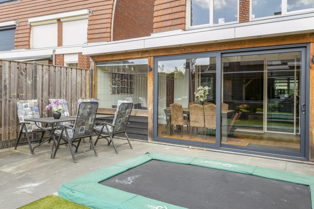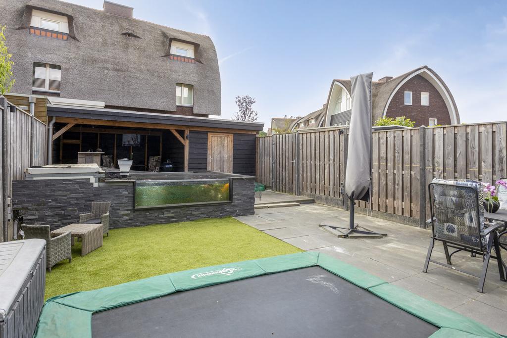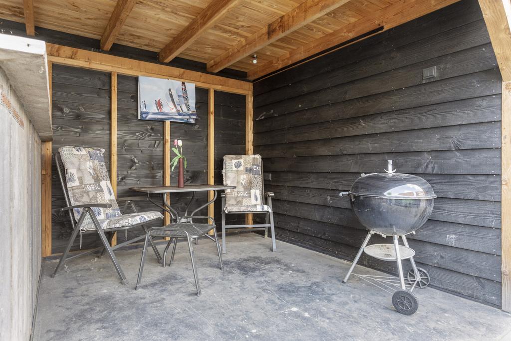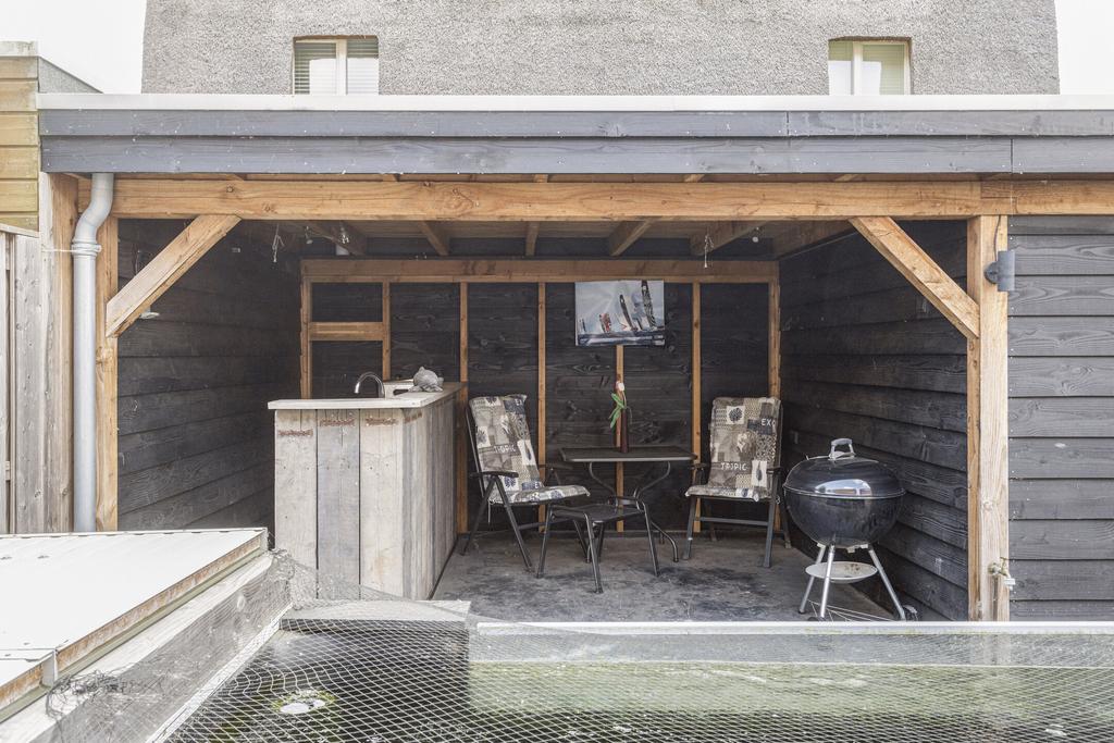 Achter in de tuin staat een ruime overkapping, waar zich een bar bevind voor een gezellig zomeravond. Naast de veranda bevindt zich nog een opbergruimte. Via de oprit naast de entree is nog een berging waar eventueel fietsen gestald kunnen worden.