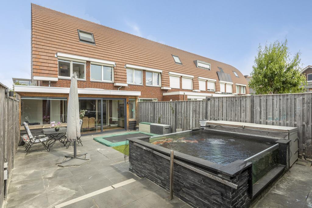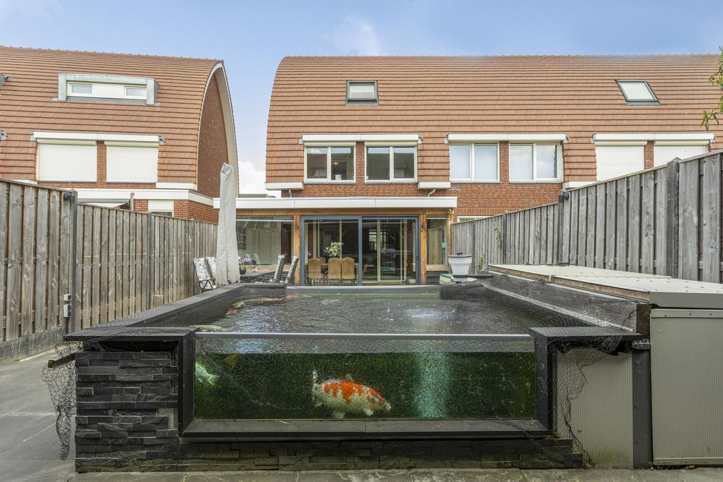 De ruime achtertuin is gunstig gelegen op het zuidoosten, waardoor je veel zon hebt. De tuin is onderhoudsvriendelijke en beschikt over een mooie tegelvloer, koivijver en een gazon.