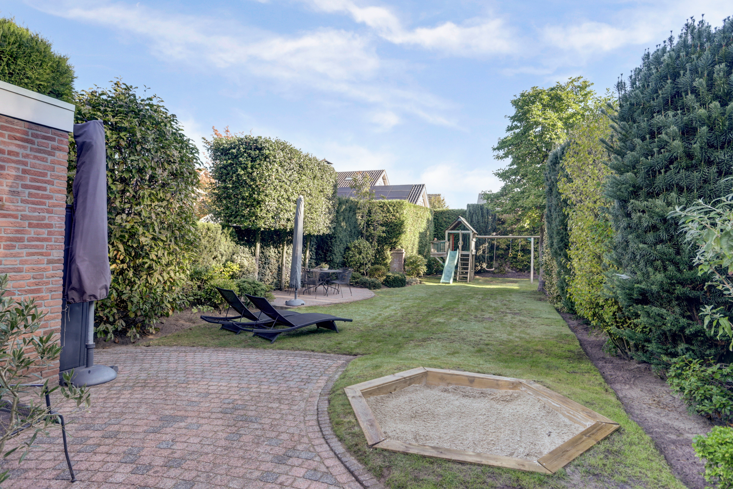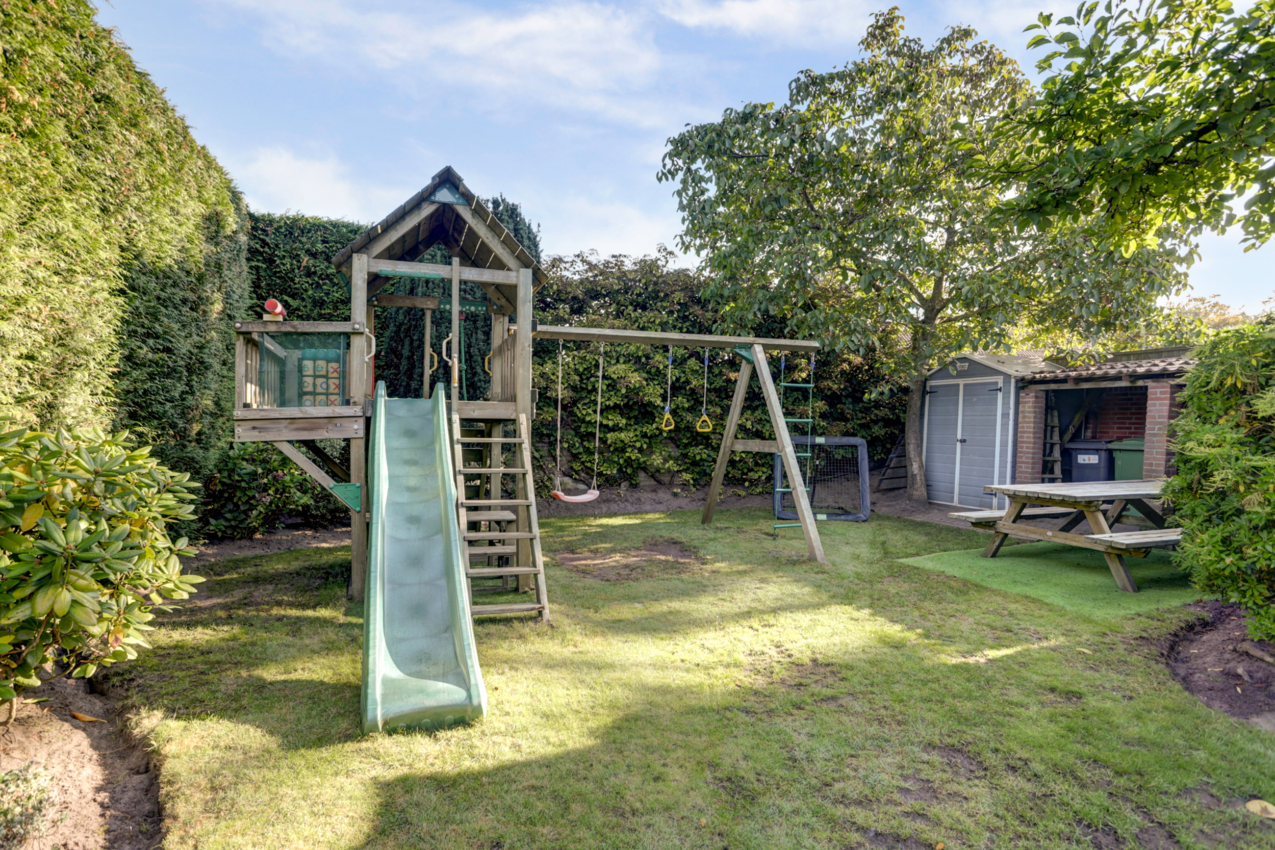 De buitenruimte is zonder twijfel een van de grootste pluspunten van deze woning. De tuin is diep bemeten en strekt zich uit over maar liefst drie percelen, waardoor er verrassend veel ruimte beschikbaar is. Dankzij de hoge, groene begroeiing geniet je hier van optimale privacy en een prettig buitenklimaat, zeker tijdens de warmere maanden van het jaar. De tuin heeft een aantrekkelijke combinatie van bestrating en groen, wat zorgt voor een verzorgde en sfeervolle uitstraling. Aan de achterzijde is een leuke speelplek gecreëerd voor kleine kinderen, terwijl er ook diverse zitmogelijkheden zijn om op elk moment van de dag van de zon, of juist de schaduw, te kunnen genieten. Daarnaast is er een praktische hoek ingericht voor het netjes plaatsen van de kliko’s en tuingereedschap, met aansluitend een kleine berging voor extra opslagruimte.