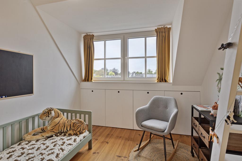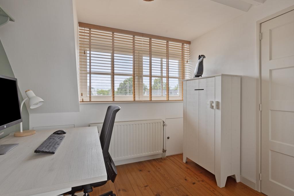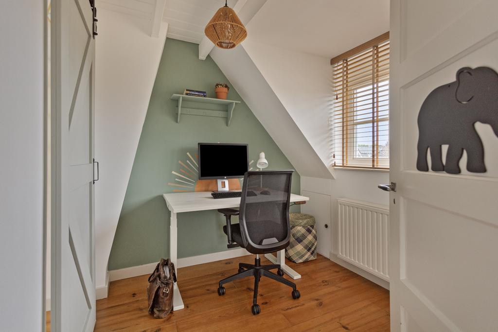 Op de tweede verdieping liggen een tweede en derde slaapkamer (met 2x dakkapel en bergruimte in de ingebouwde knieschotten). Vanaf de overloop is er toegang tot de bergruimte met wasmachine aansluiting en cv-ketel. De twee kamers worden via een schuifdeur van elkaar gescheiden. Een heeft een dakkapel aan de voorzijde en dus zicht op het centrum en de Nieuwstraat zelf. De andere heeft de dakkapel aan de achterzijde. De tweede kamer met het bureau betreft dus een doorloopkamer naar slaapkamer 3. Er is ook nog een vliering gerealiseerd voor extra bergruimte.
