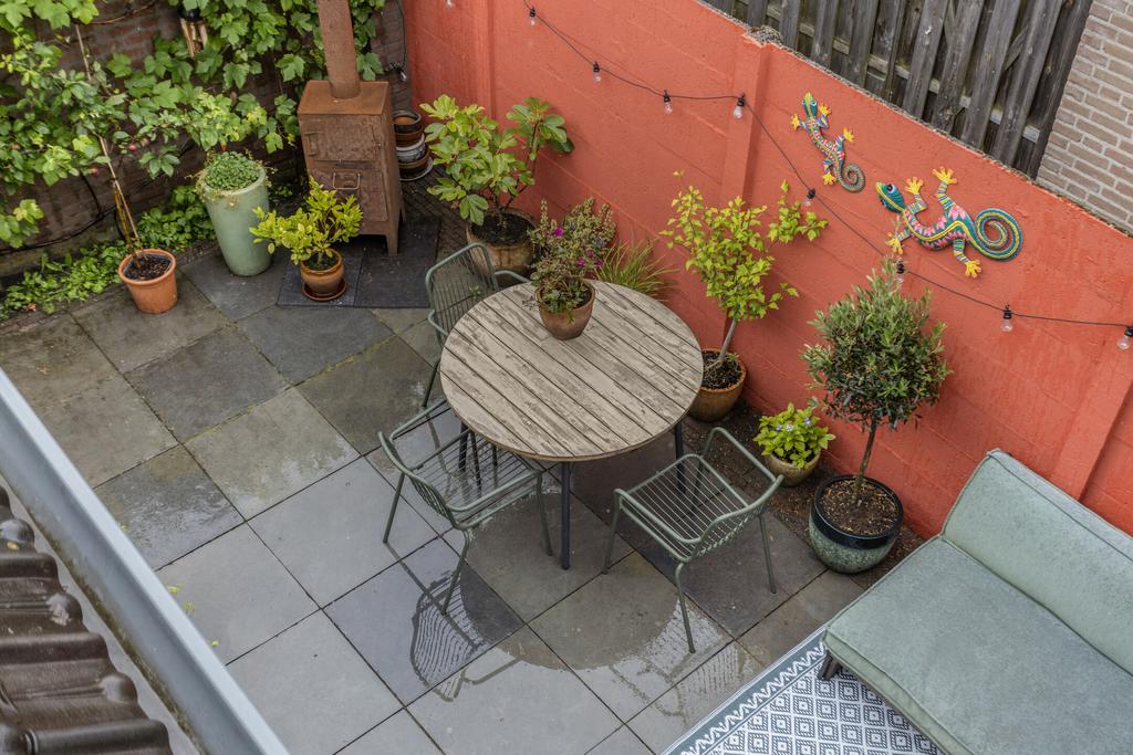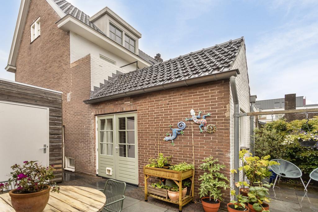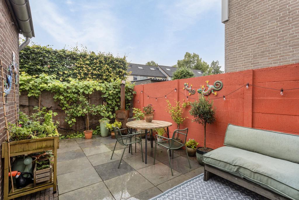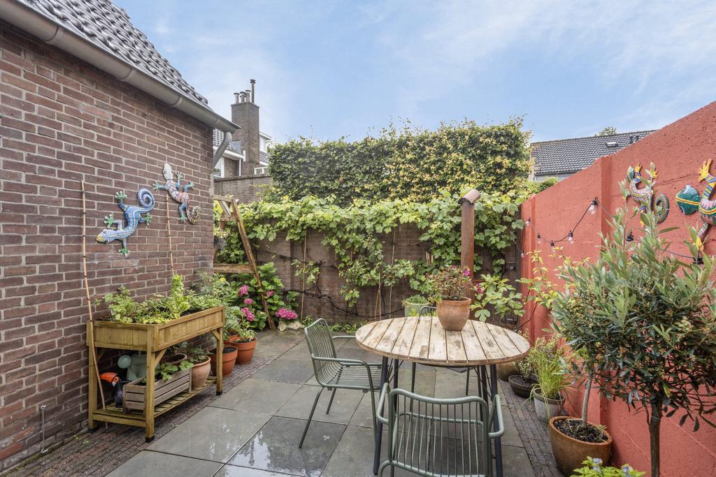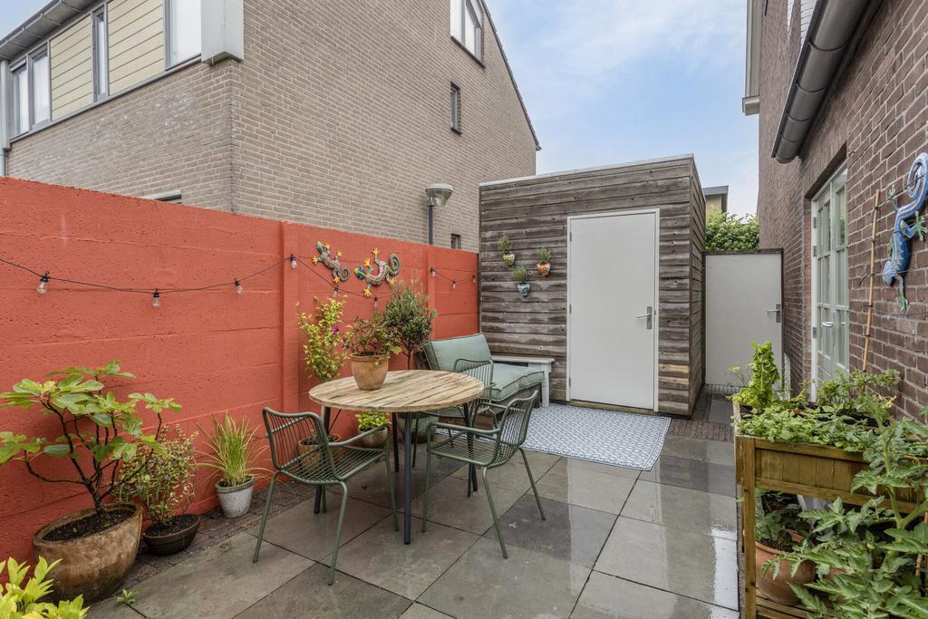 De achtertuin is gelegen op het zuiden en beschikt over een ruim terras met mooie grote tuintegels, er is een berging aanwezig, ideaal voor het stallen van fietsen en het opbergen van tuinspullen. De berging is voorzien van elektra en er is een poort naar de oprit. De oprit biedt plaats aan één auto. De tuin is bijzonder sfeervol en groen met volop privacy. Naast de tuin is er ook nog een balkon op de eerste verdieping, eveneens op het zuiden georiënteerd.