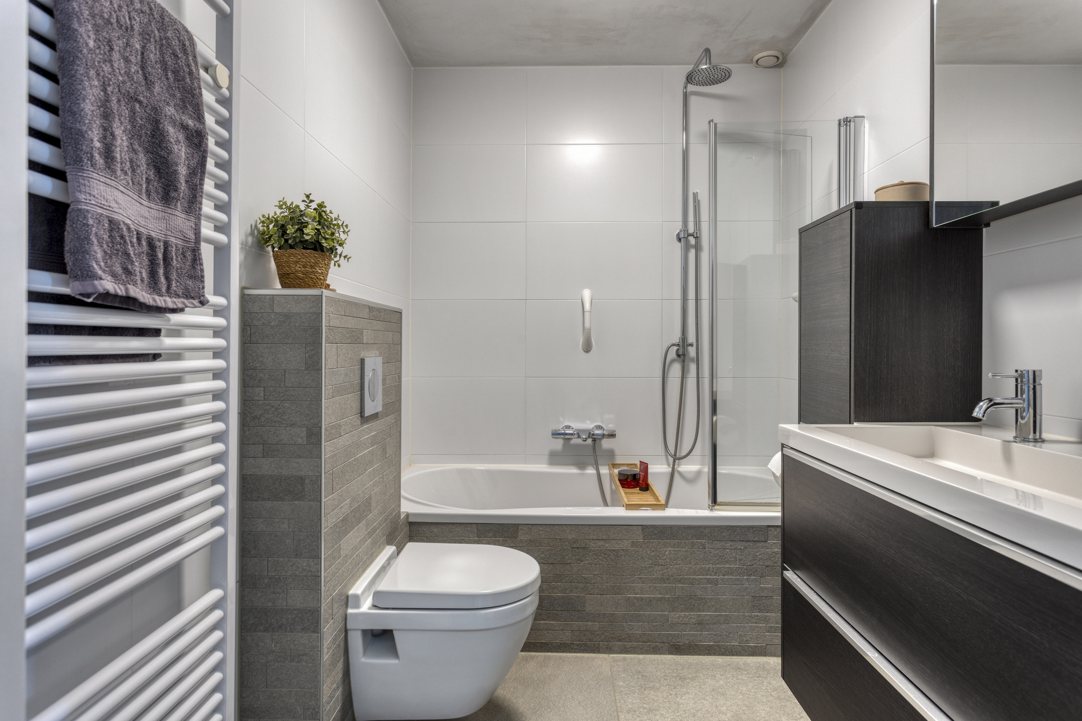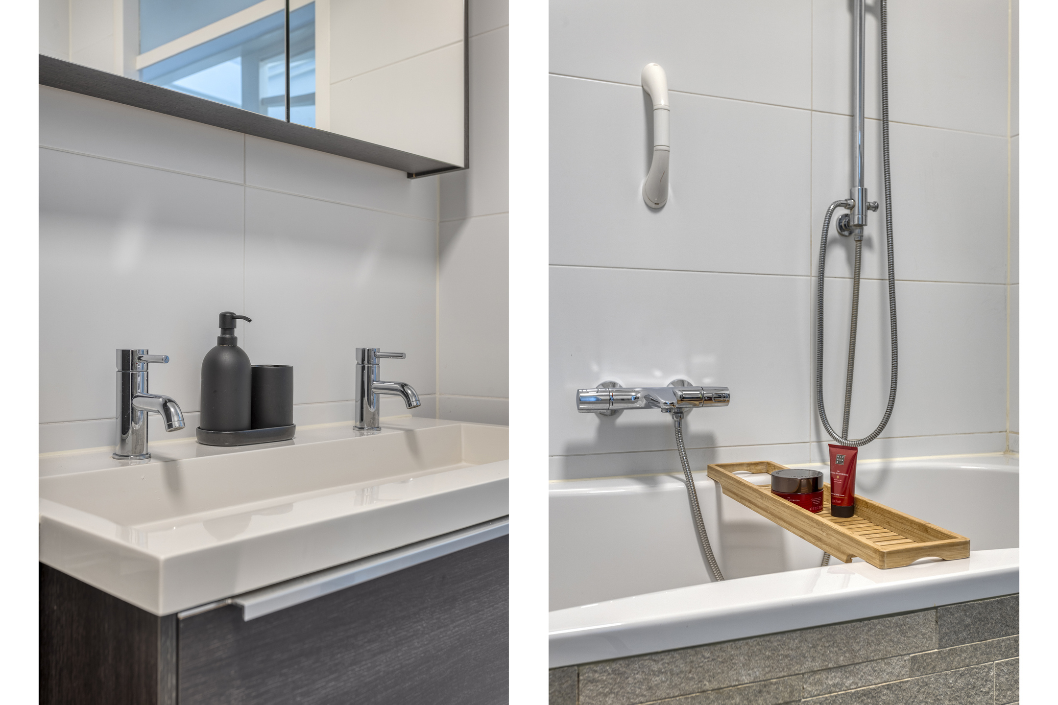 - Ligbad, toilet, douche, dubbele wastafel en wastafelmeubel
