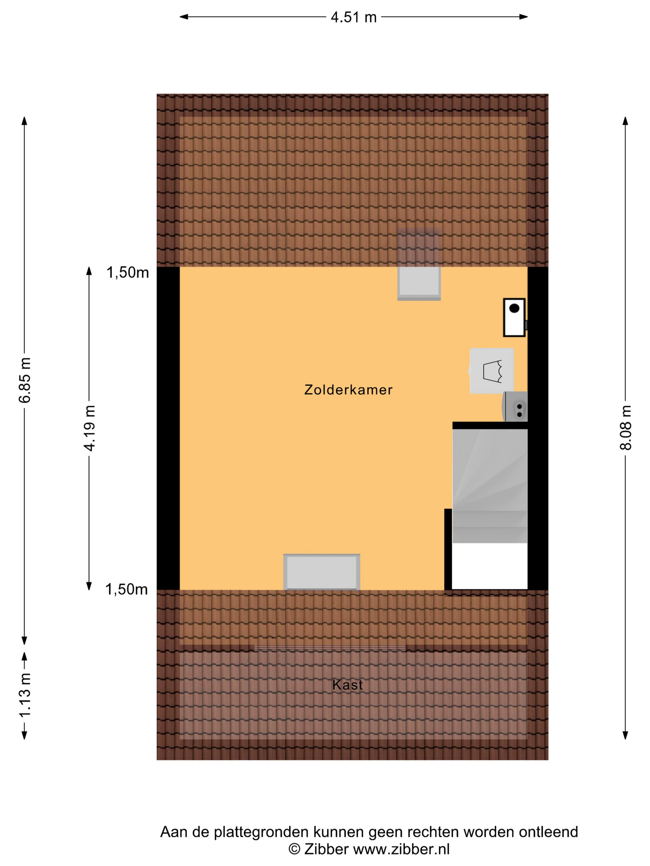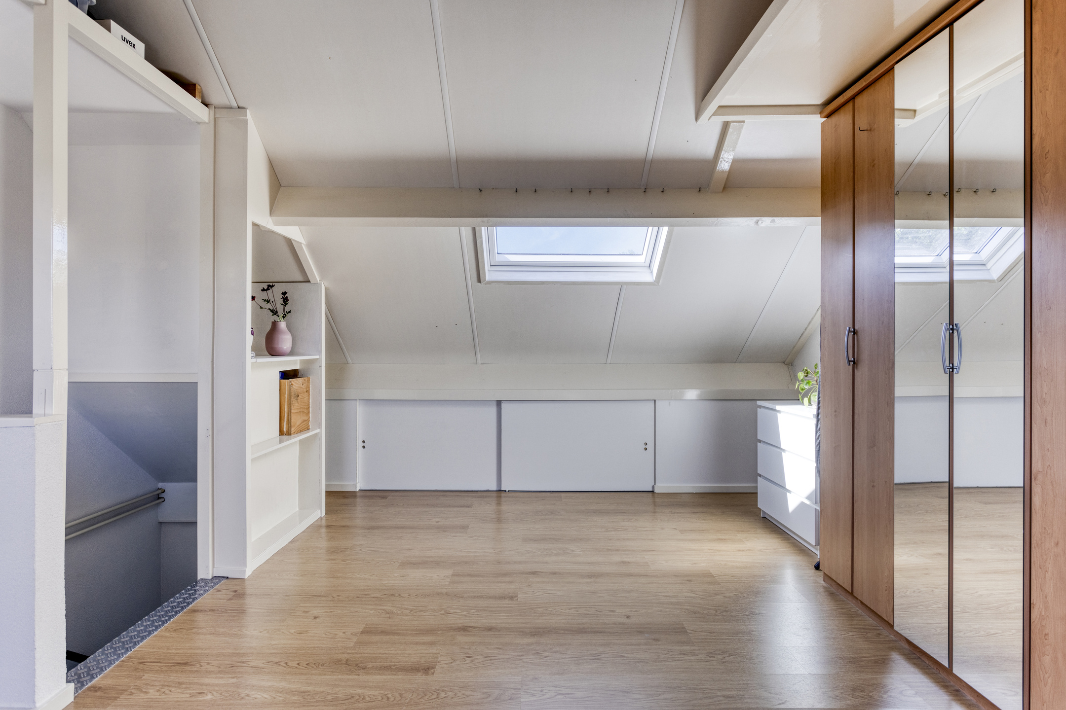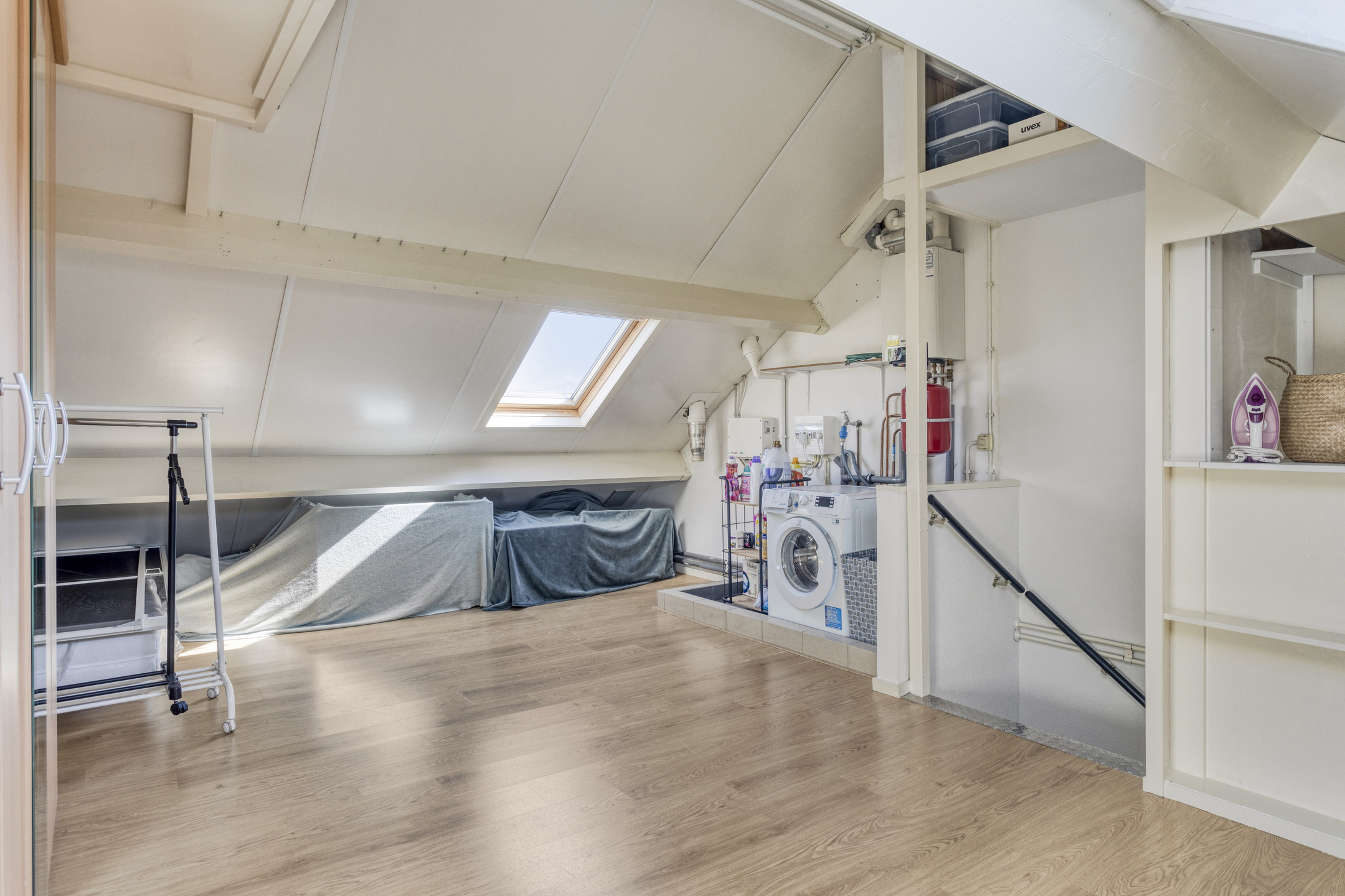 Via een vaste trap te bereiken zolderverdieping met twee dakramen, de opstelling van de cv-combiketel, mechanische afzuigbox en de aansluitpunten voor de wasapparatuur.
