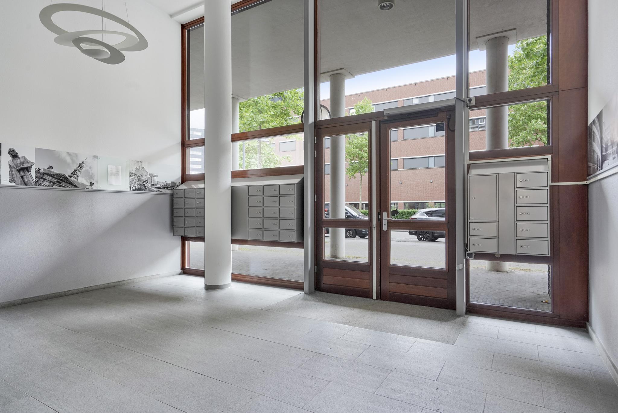 Aan de Onderwijsboulevard bevindt zich de gezamenlijke entree van het appartementencomplex Markiezenhof. De entree is voorzien van postbussen en bellentableau met videofooninstallatie. De verzorgde gemeenschappelijke entree biedt u toegang tot het trappenhuis en de lift. Het appartement kent een ligging op de derde verdieping van het complex. De voordeur van het appartement bereikt u middels de galerij. De galerij biedt u een heerlijke zitgelegenheid, waar u kunt genieten van de ochtendzon en het uitzicht over de groenrijke, rustige binnentuin.