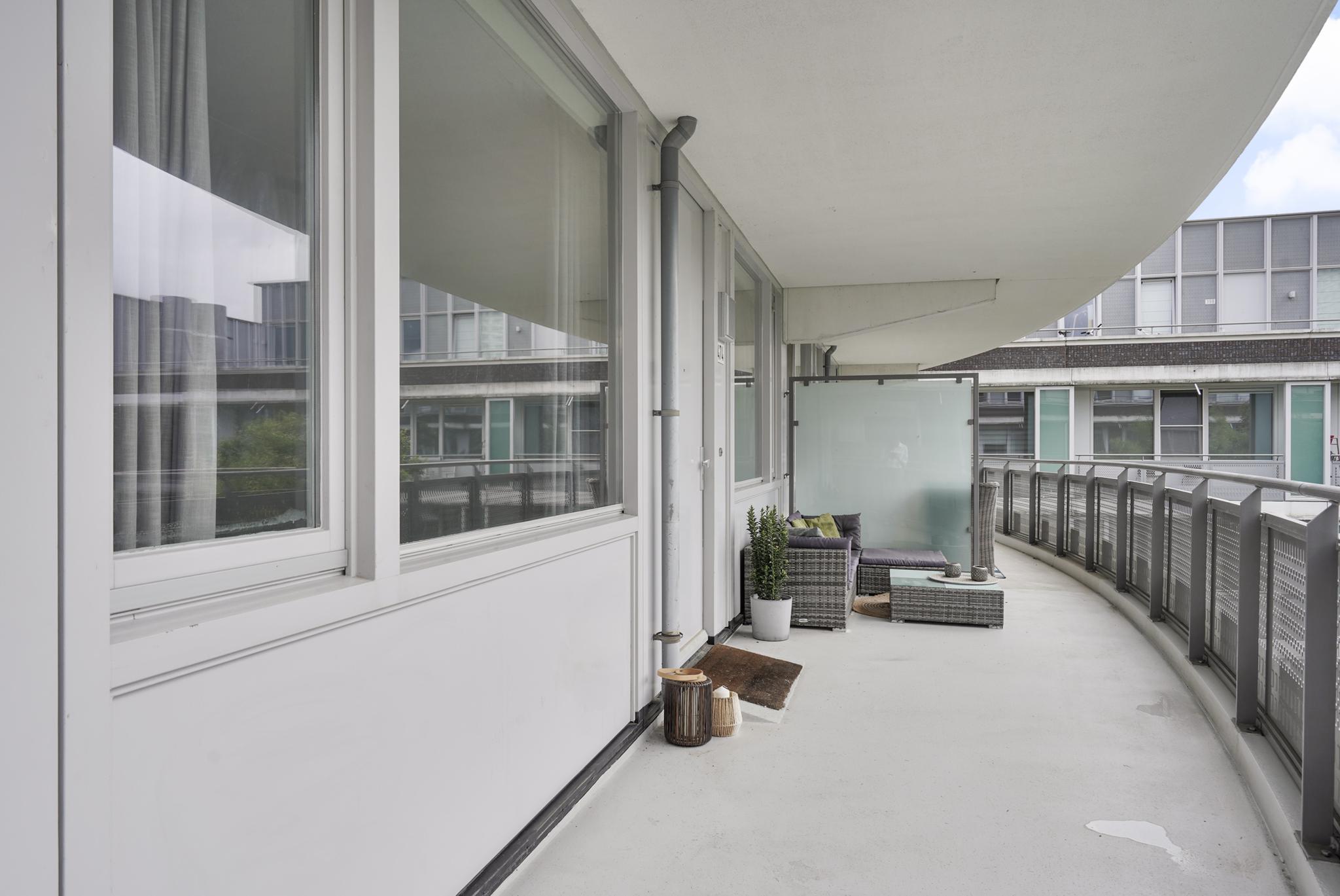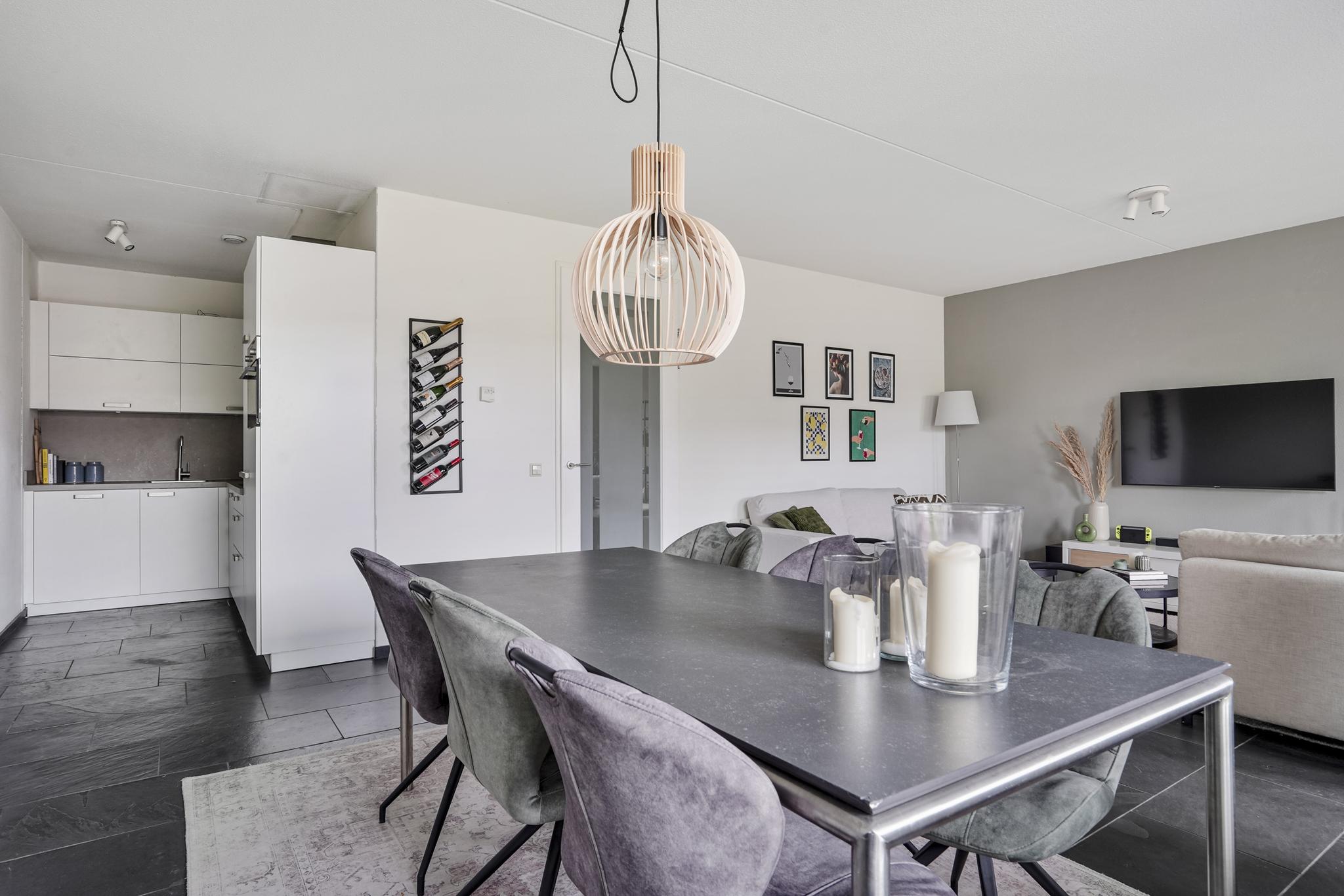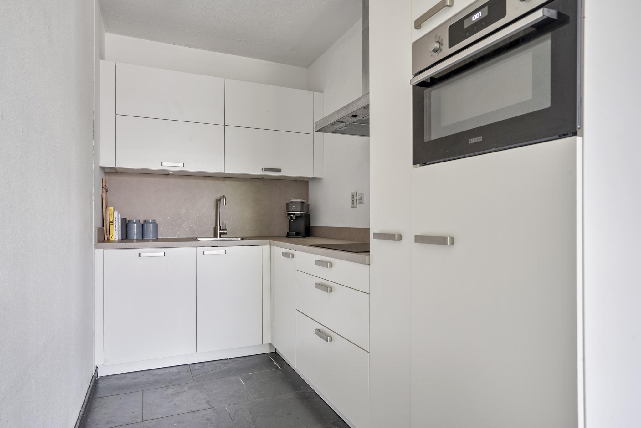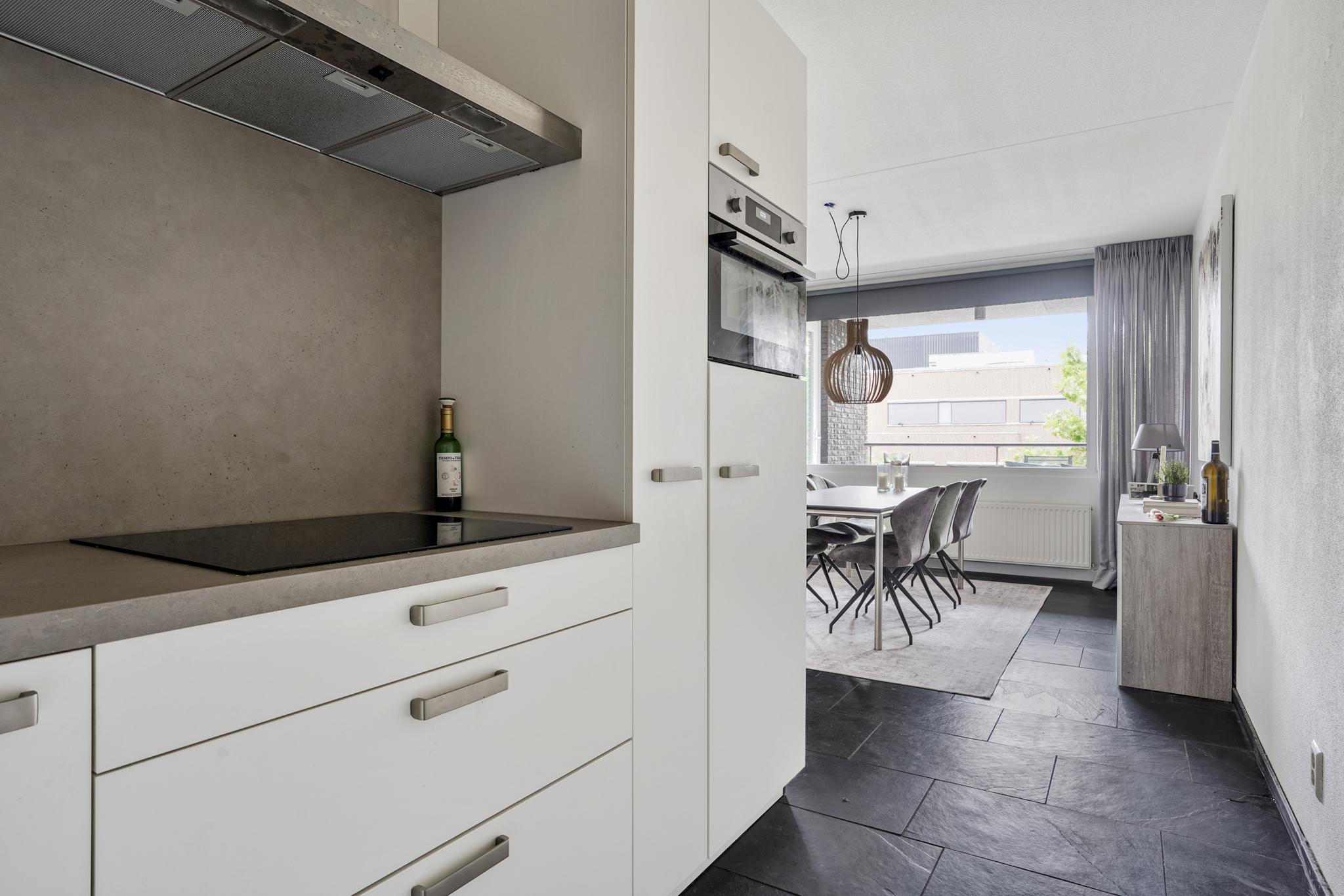 De woonkamer geniet door de grote raampartijen van een gunstige lichtinval en biedt u voldoende indelingsvrijheid. De woonkamer staat in open verbinding met de eethoek, waar u voldoende ruimte heeft voor een royale eettafel. De halfopen keuken, geplaatst in een hoekopstelling, is uitgevoerd in een lichte kleurstelling en stamt uit 2023. De keuken is voorzien van diverse inbouwapparatuur, zoals een elektrische kookplaat, afzuigkap, oven, combi-oven, koel-vriescombinatie en een vaatwasser. Vanuit de woonkamer is tevens het zonnige, ruime balkon (7 m²), gelegen op het westen, te bereiken. Het gehele balkon is afgewerkt met vlonders.