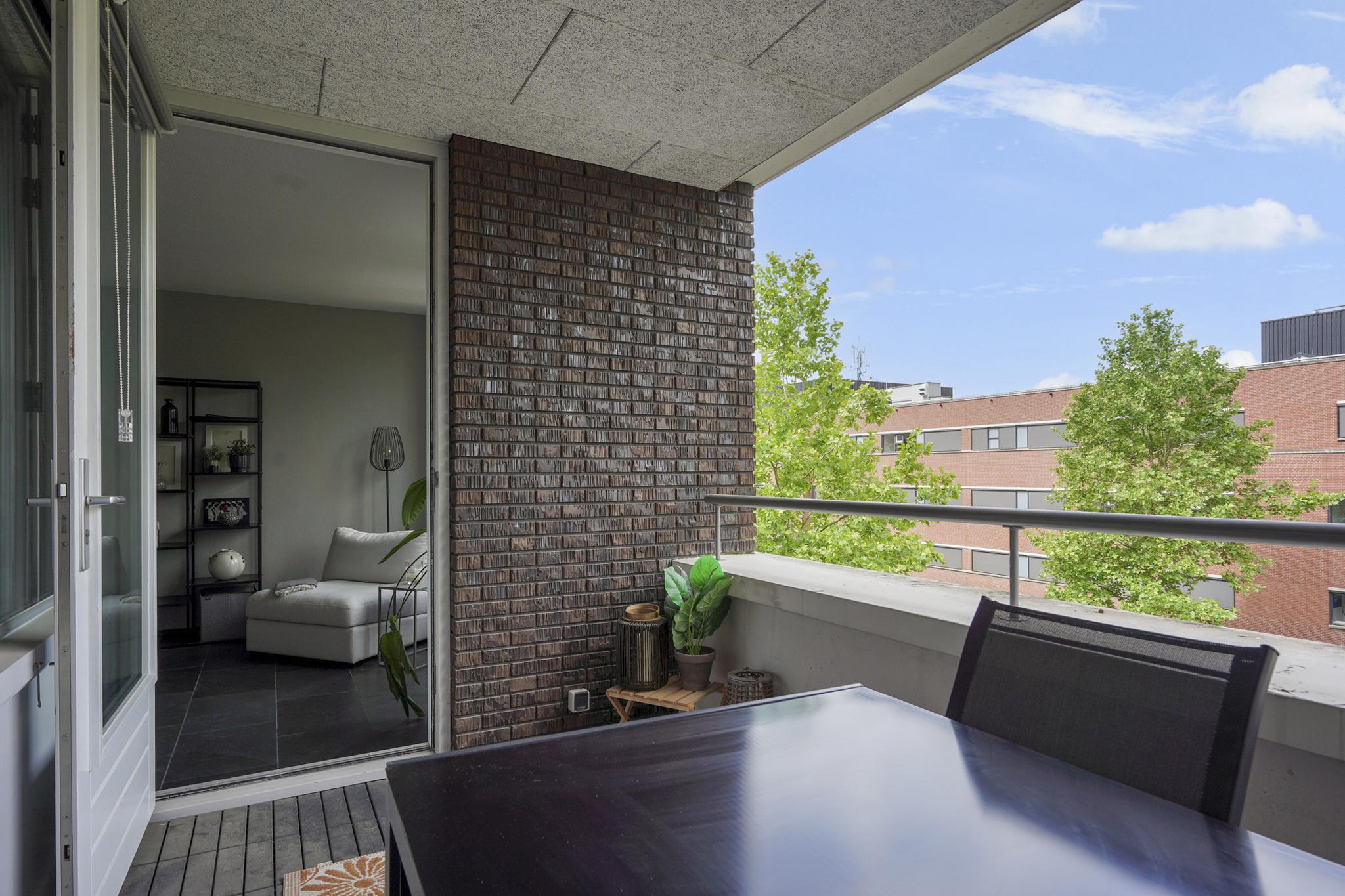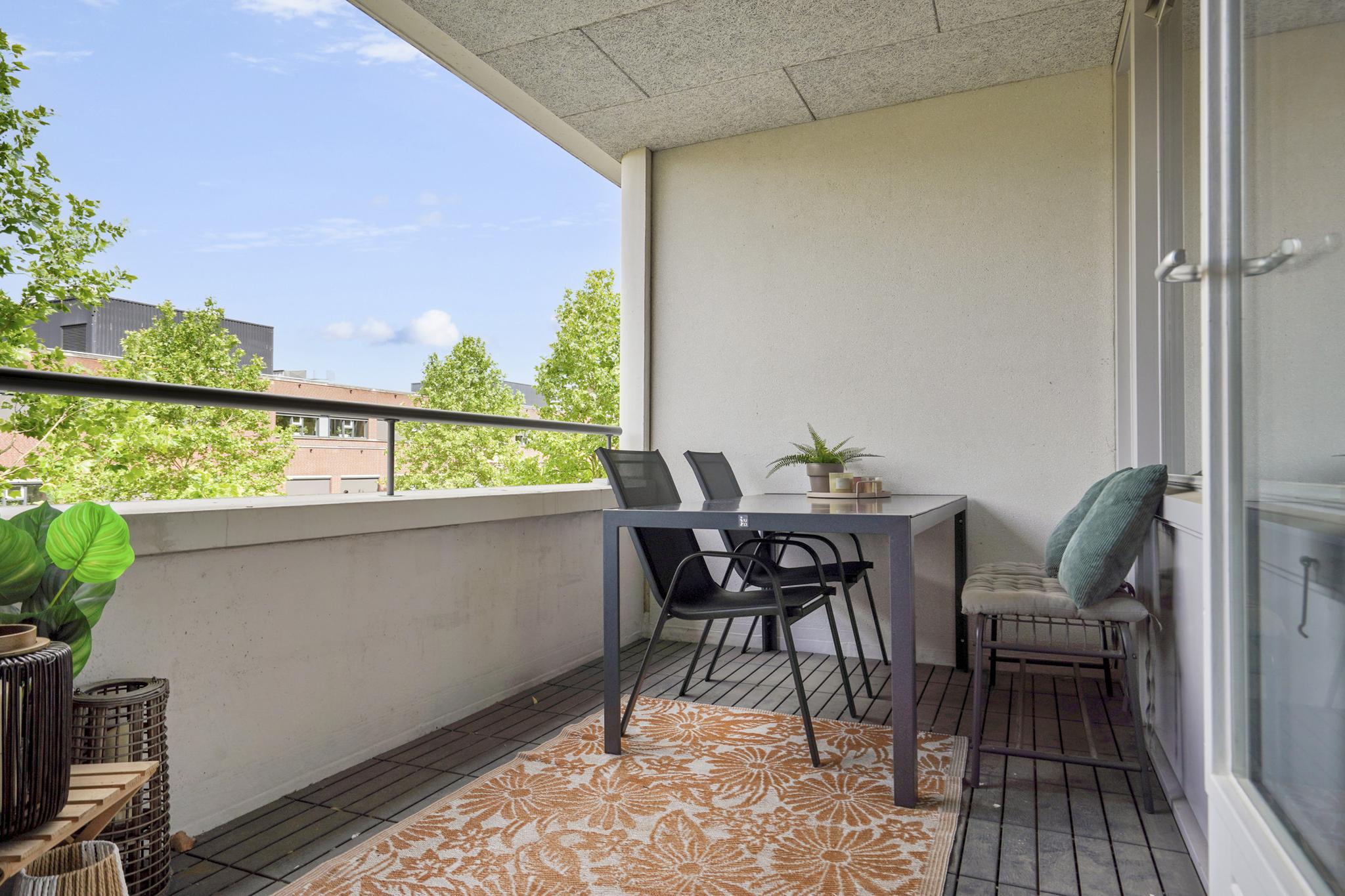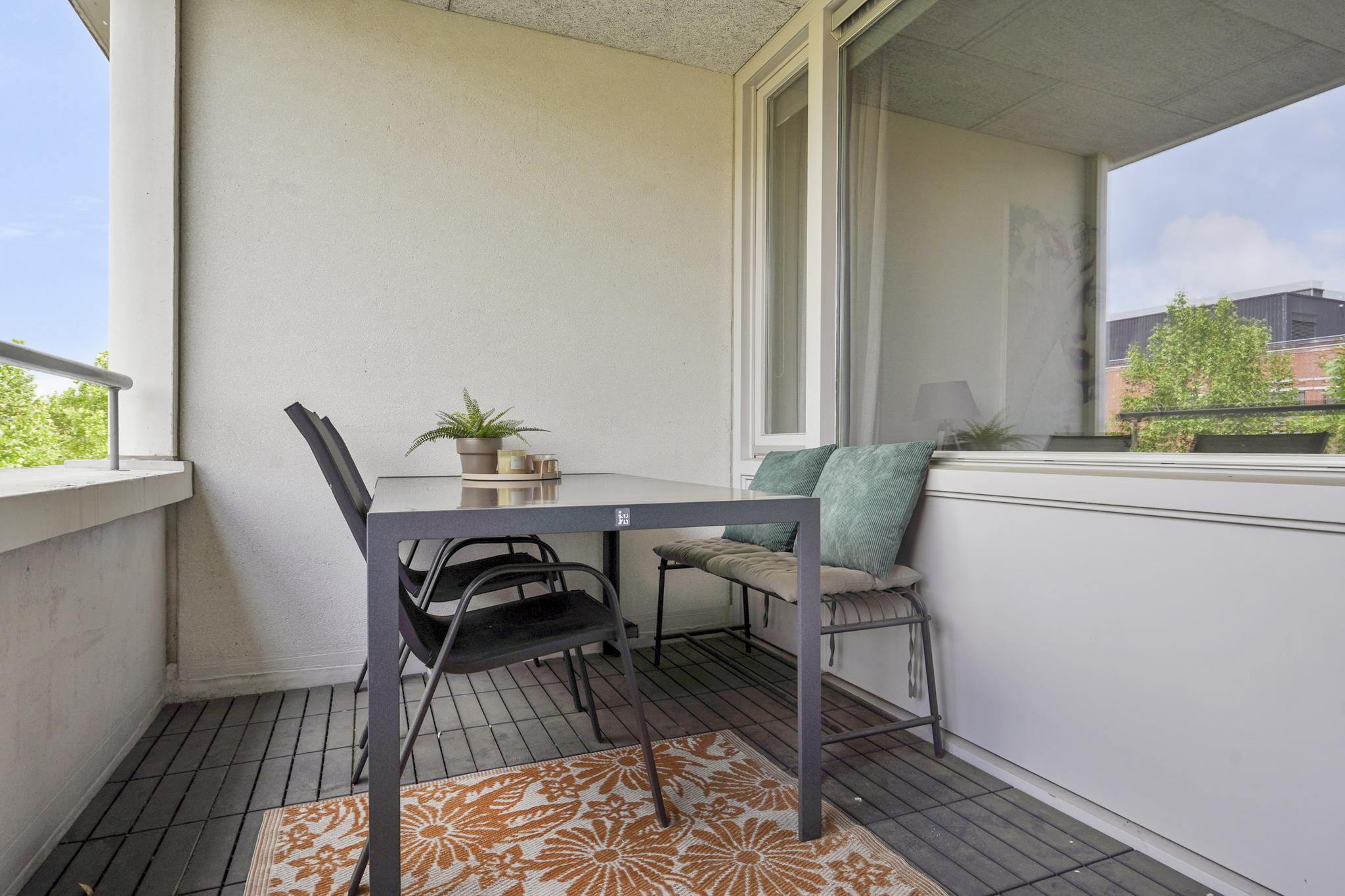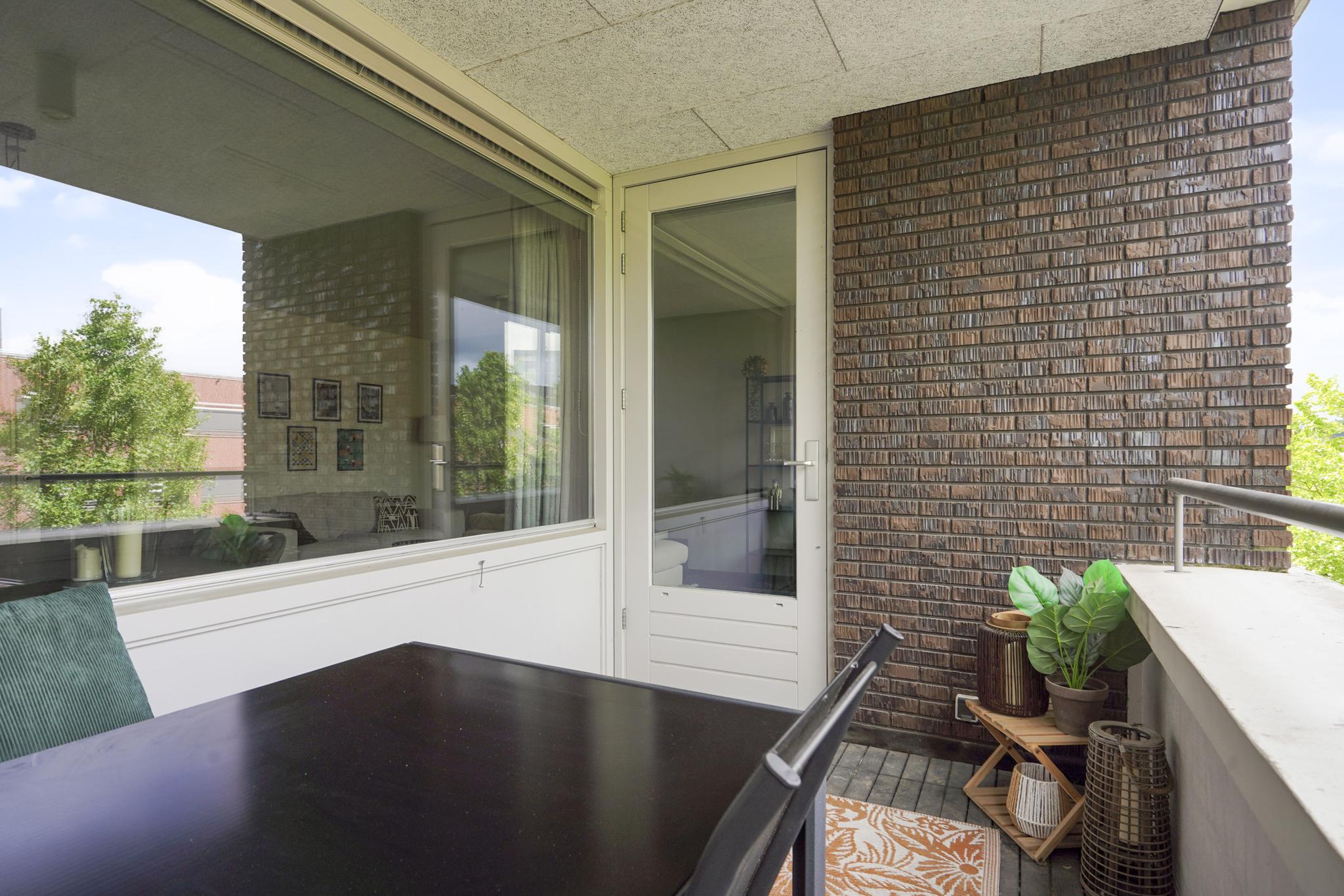 De woonkamer geniet door de grote raampartijen van een gunstige lichtinval en biedt u voldoende indelingsvrijheid. De woonkamer staat in open verbinding met de eethoek, waar u voldoende ruimte heeft voor een royale eettafel. De halfopen keuken, geplaatst in een hoekopstelling, is uitgevoerd in een lichte kleurstelling en stamt uit 2023. De keuken is voorzien van diverse inbouwapparatuur, zoals een elektrische kookplaat, afzuigkap, oven, combi-oven, koel-vriescombinatie en een vaatwasser. Vanuit de woonkamer is tevens het zonnige, ruime balkon (7 m²), gelegen op het westen, te bereiken. Het gehele balkon is afgewerkt met vlonders.