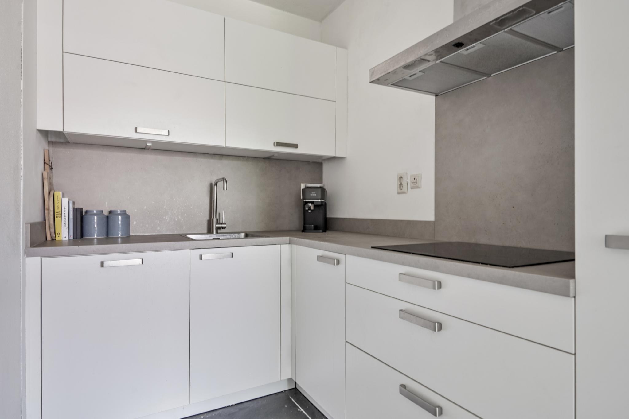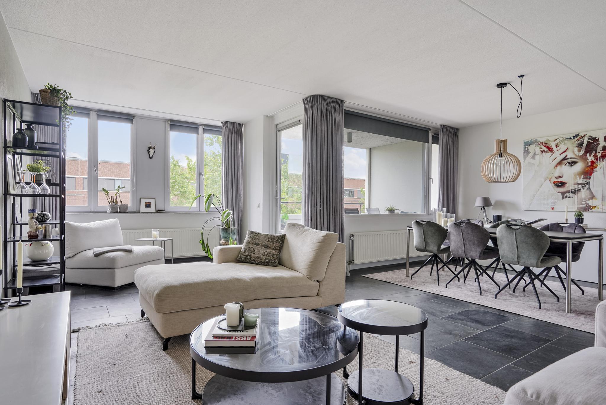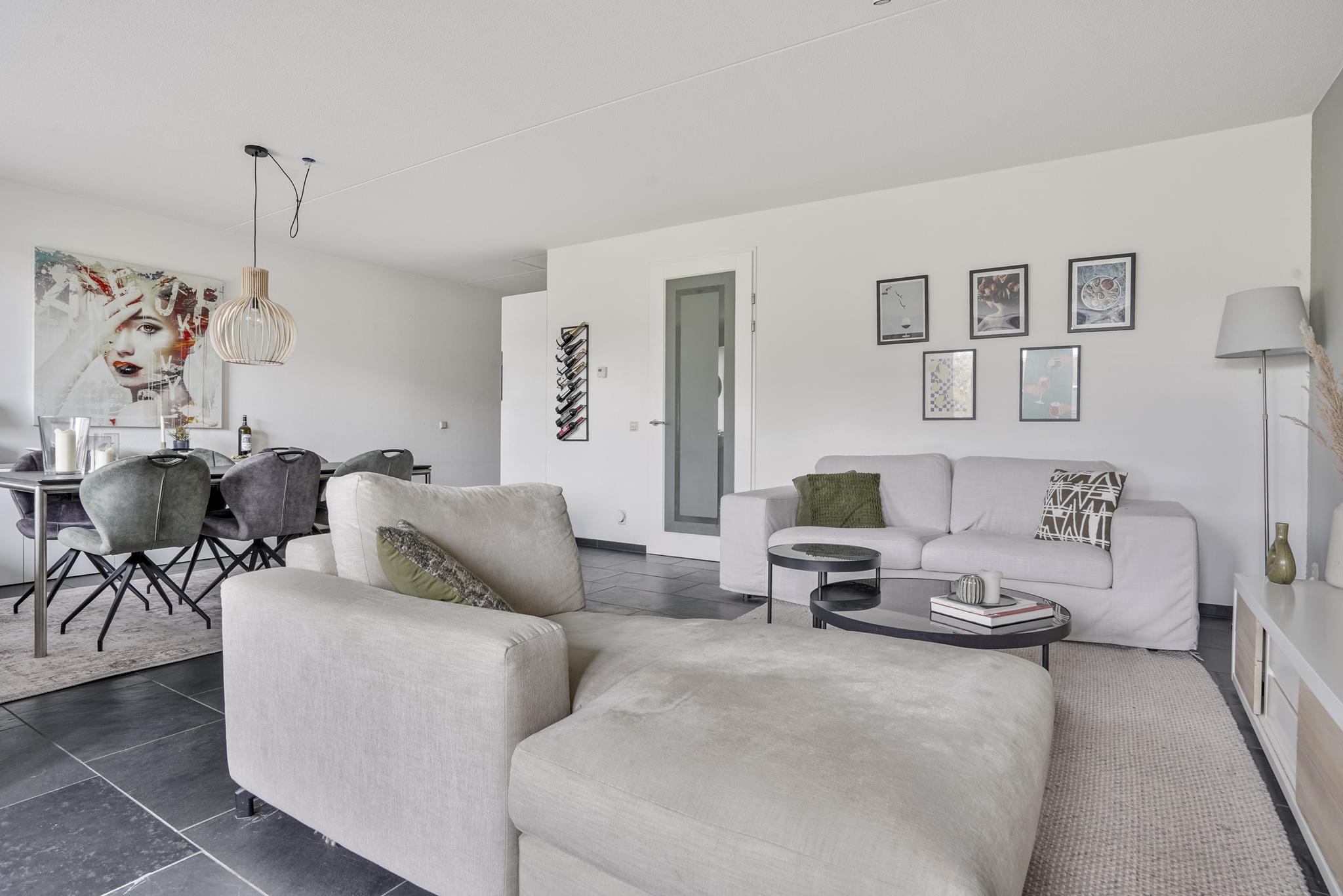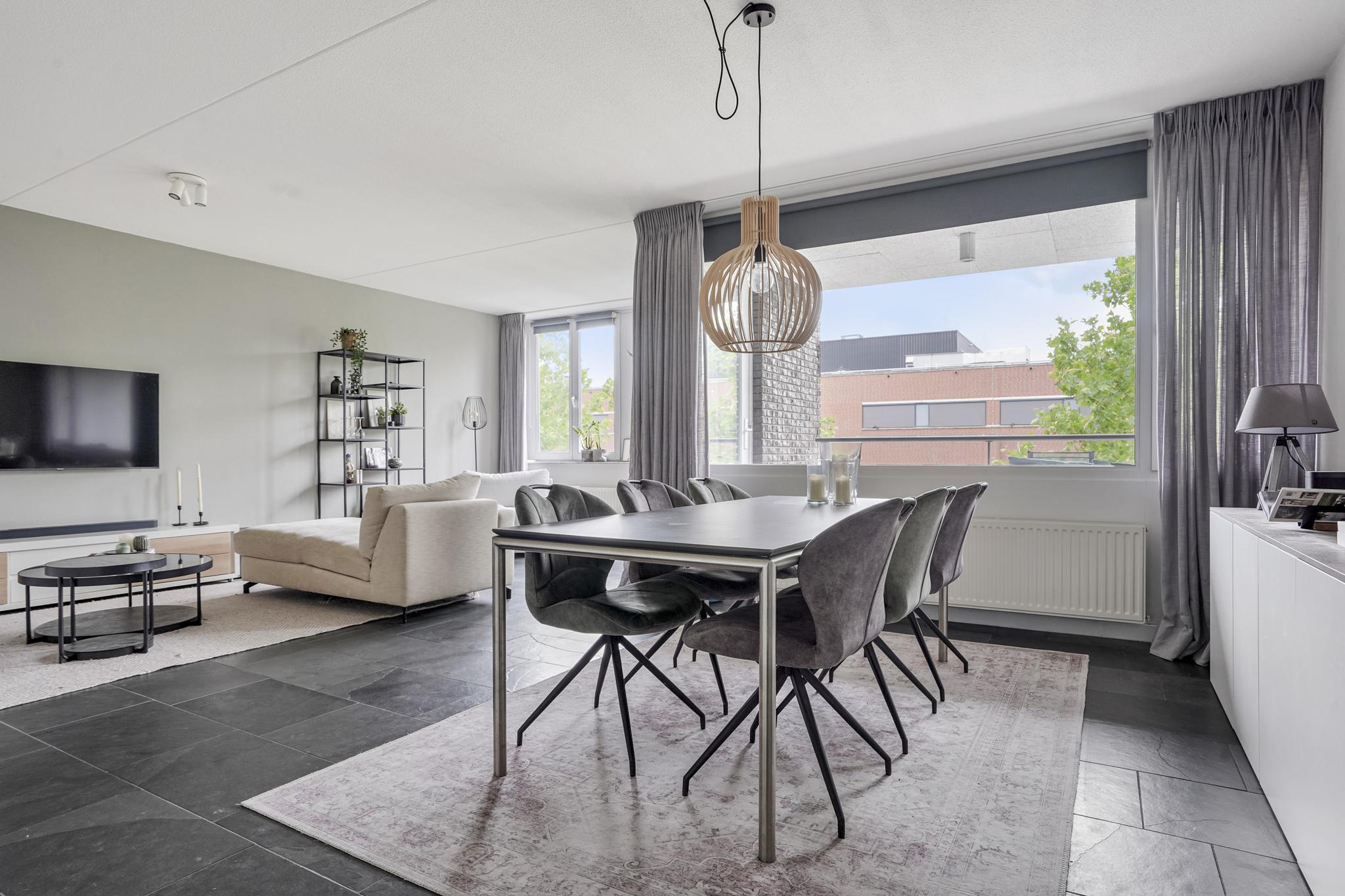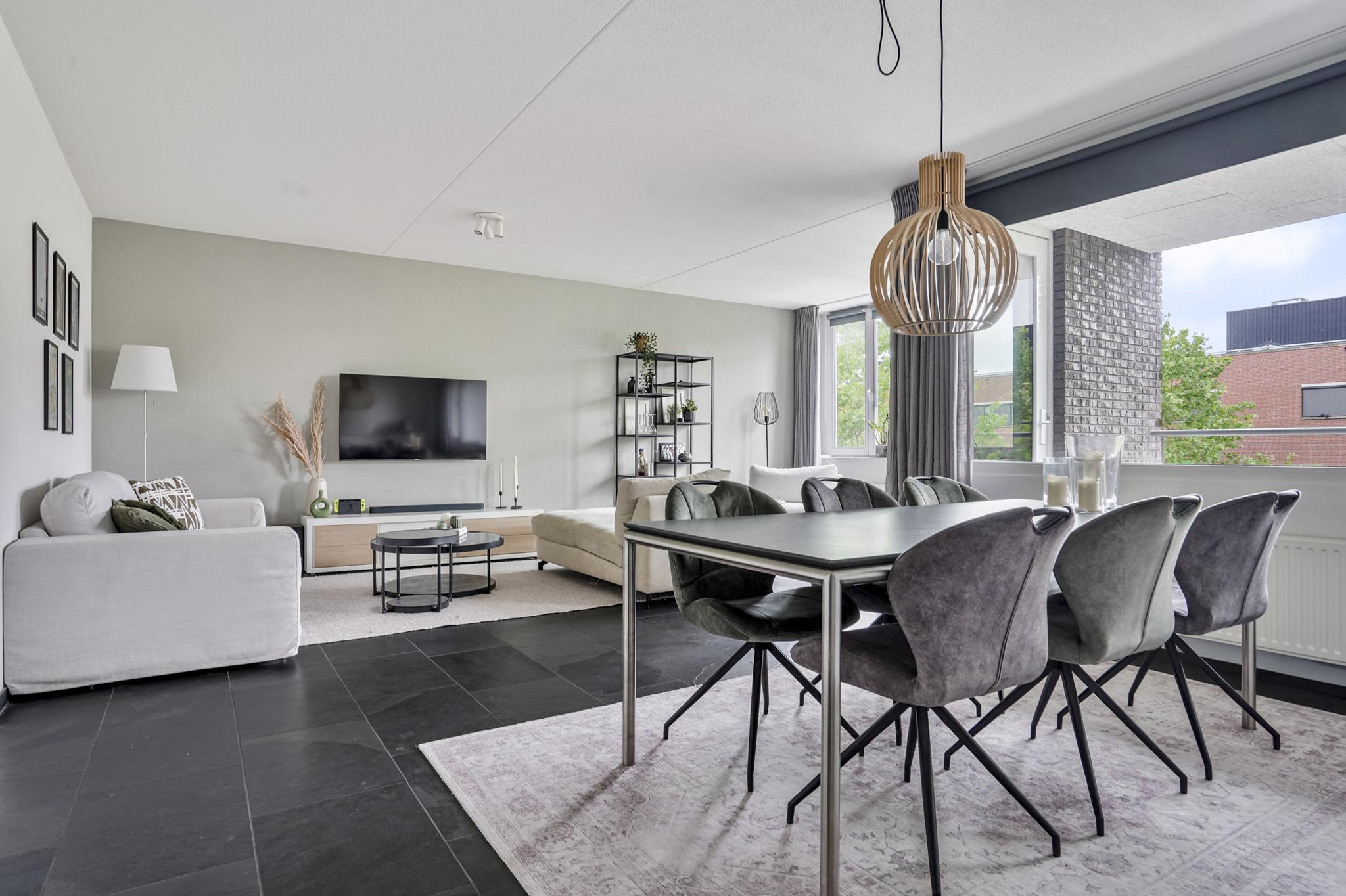 De woonkamer geniet door de grote raampartijen van een gunstige lichtinval en biedt u voldoende indelingsvrijheid. De woonkamer staat in open verbinding met de eethoek, waar u voldoende ruimte heeft voor een royale eettafel. De halfopen keuken, geplaatst in een hoekopstelling, is uitgevoerd in een lichte kleurstelling en stamt uit 2023. De keuken is voorzien van diverse inbouwapparatuur, zoals een elektrische kookplaat, afzuigkap, oven, combi-oven, koel-vriescombinatie en een vaatwasser. Vanuit de woonkamer is tevens het zonnige, ruime balkon (7 m²), gelegen op het westen, te bereiken. Het gehele balkon is afgewerkt met vlonders.