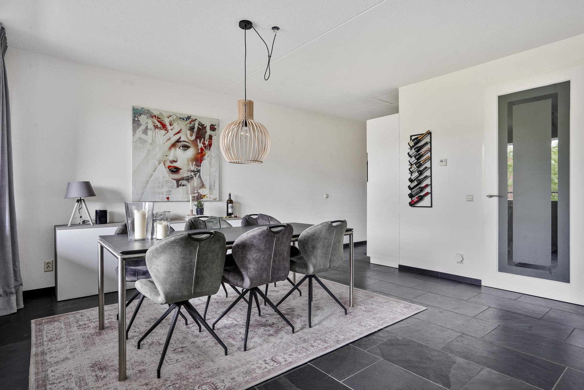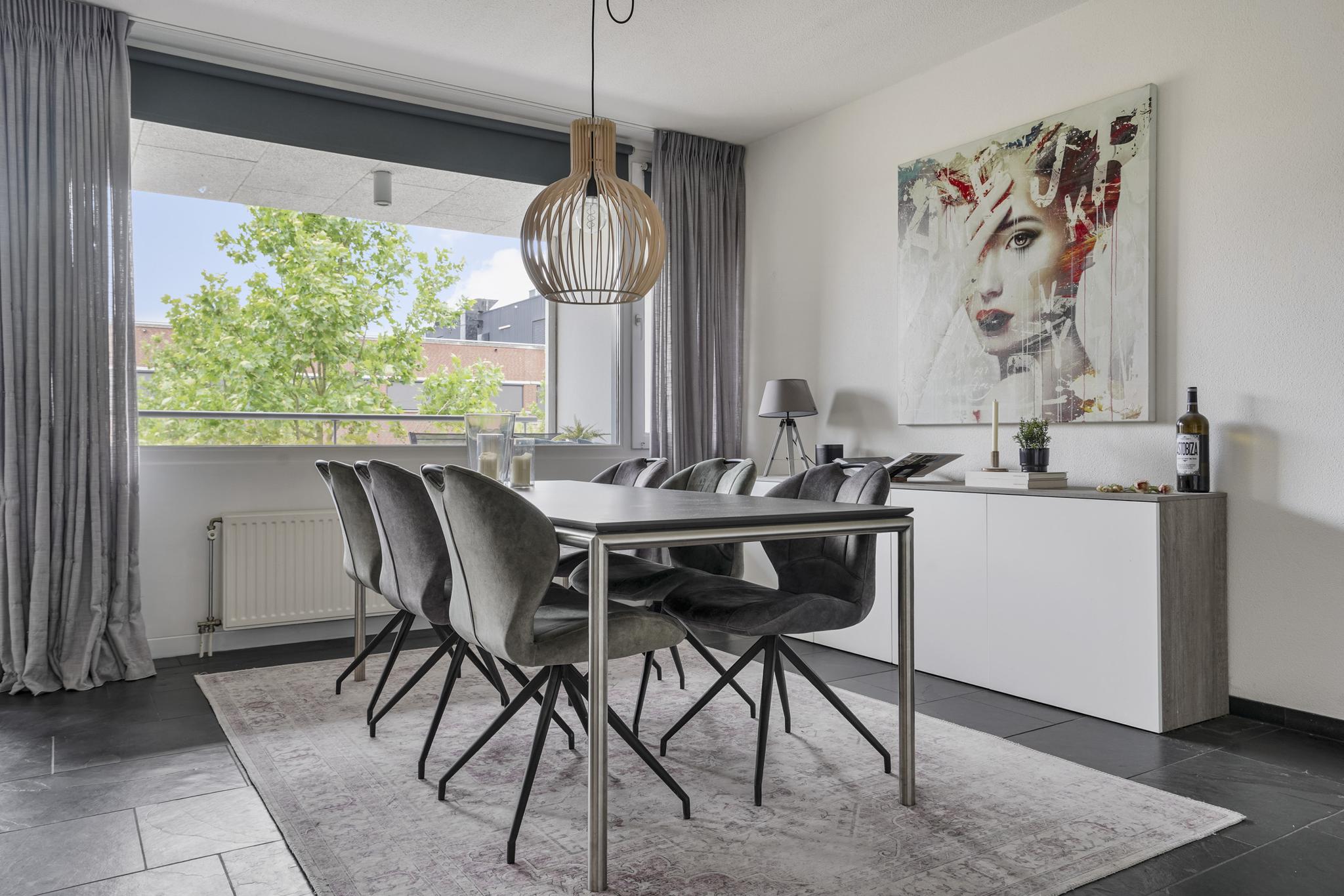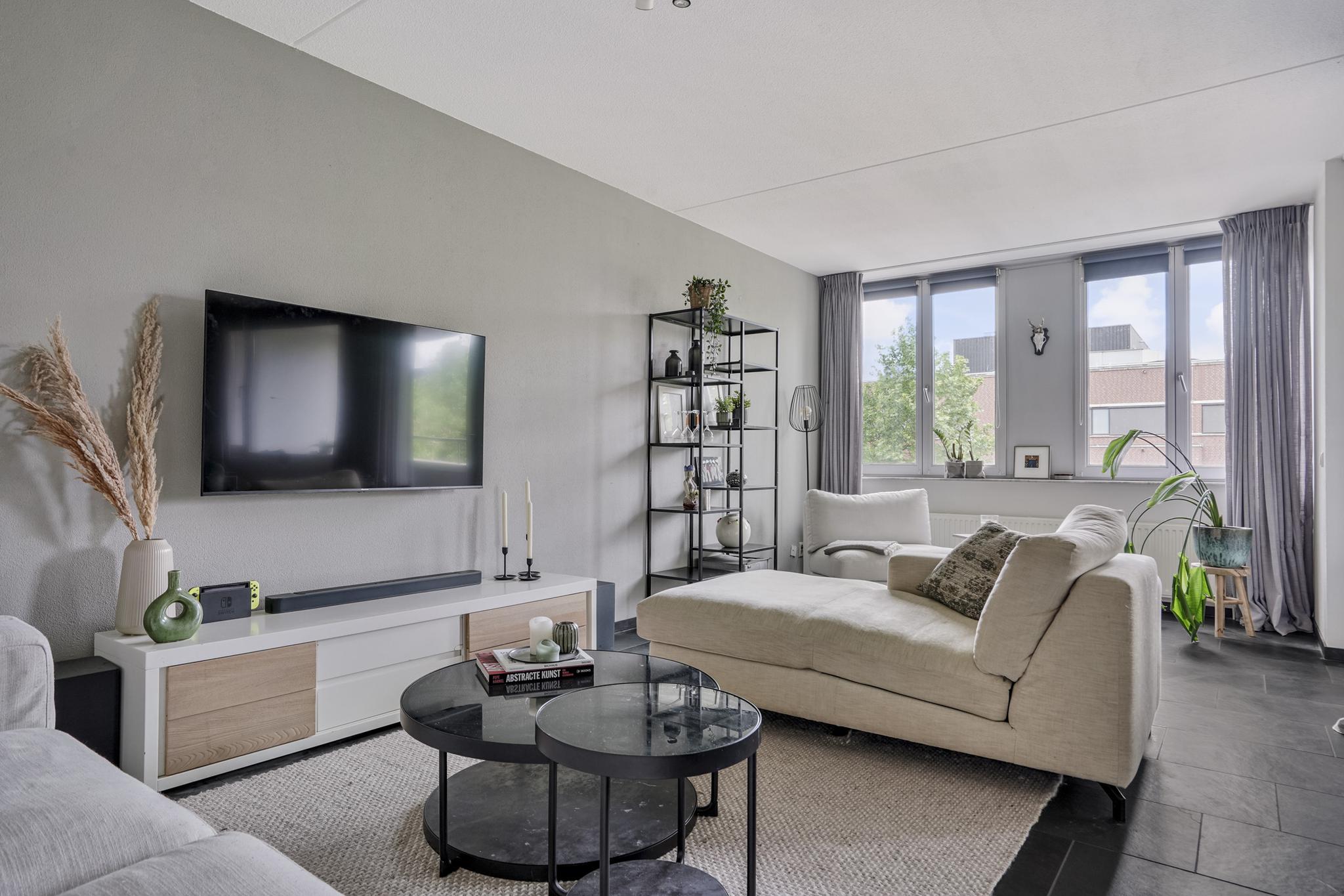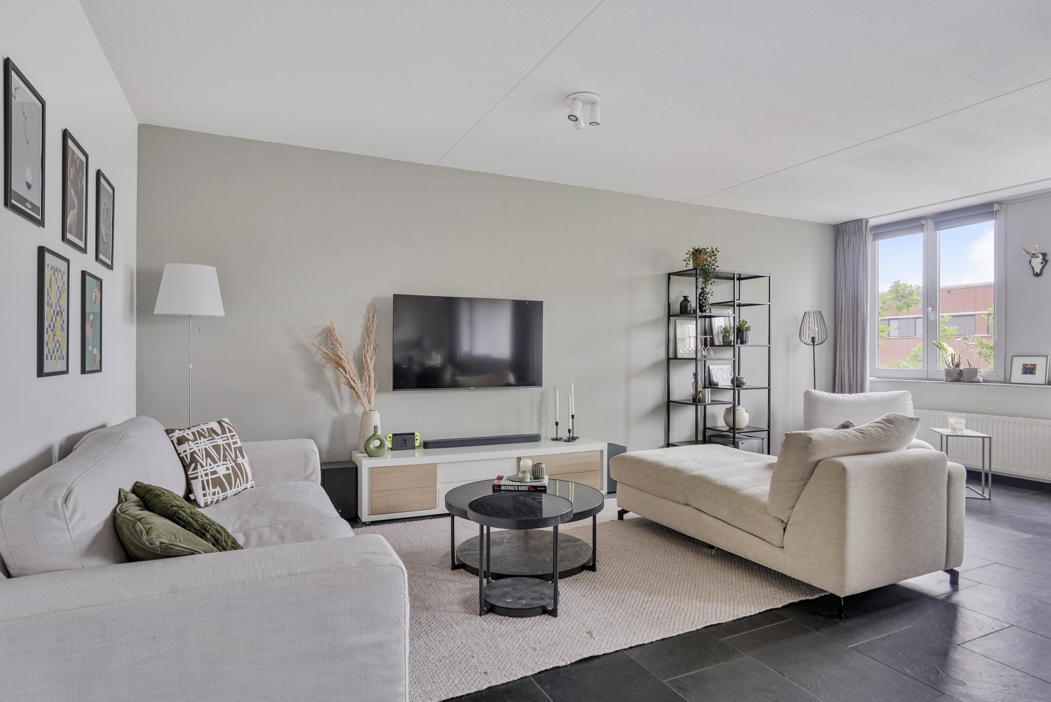 De woonkamer geniet door de grote raampartijen van een gunstige lichtinval en biedt u voldoende indelingsvrijheid. De woonkamer staat in open verbinding met de eethoek, waar u voldoende ruimte heeft voor een royale eettafel. De halfopen keuken, geplaatst in een hoekopstelling, is uitgevoerd in een lichte kleurstelling en stamt uit 2023. De keuken is voorzien van diverse inbouwapparatuur, zoals een elektrische kookplaat, afzuigkap, oven, combi-oven, koel-vriescombinatie en een vaatwasser. Vanuit de woonkamer is tevens het zonnige, ruime balkon (7 m²), gelegen op het westen, te bereiken. Het gehele balkon is afgewerkt met vlonders.