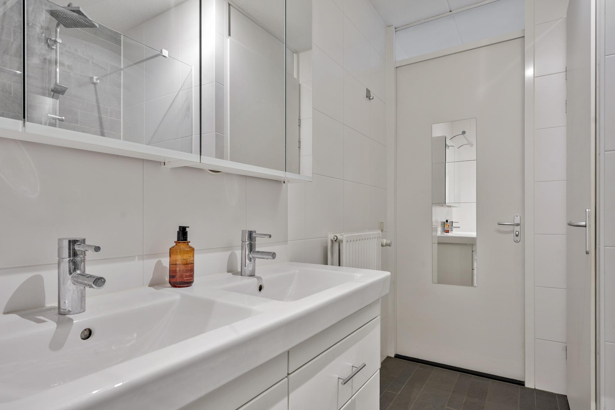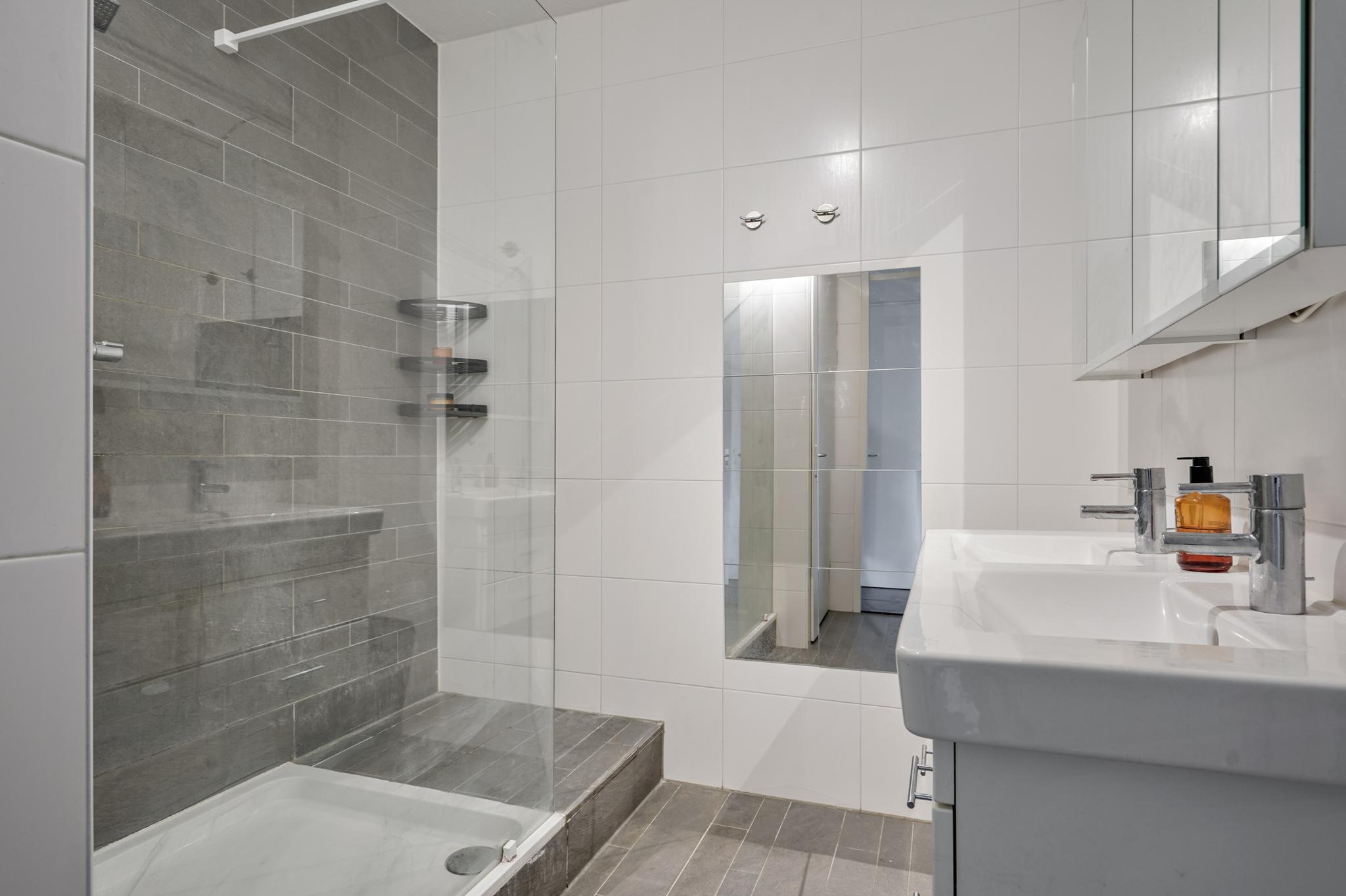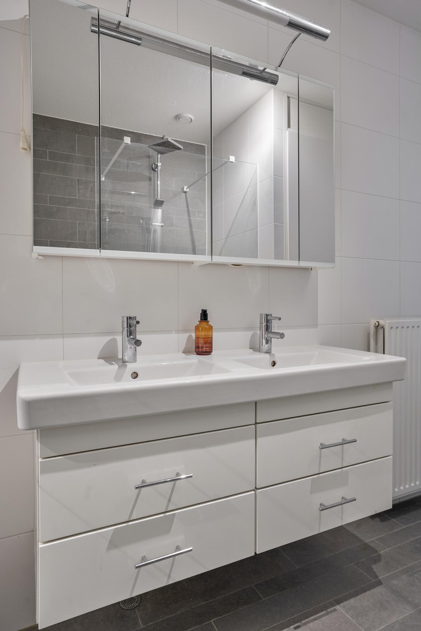 De badkamer is uitgevoerd in een moderne kleurstelling en uitstekend onderhouden. U heeft de beschikking over een riante inloopdouche en een tweepersoonswastafelmeubel. Vanuit de badkamer is de wasruimte met de aansluitingen voor de wasapparatuur bereikbaar.