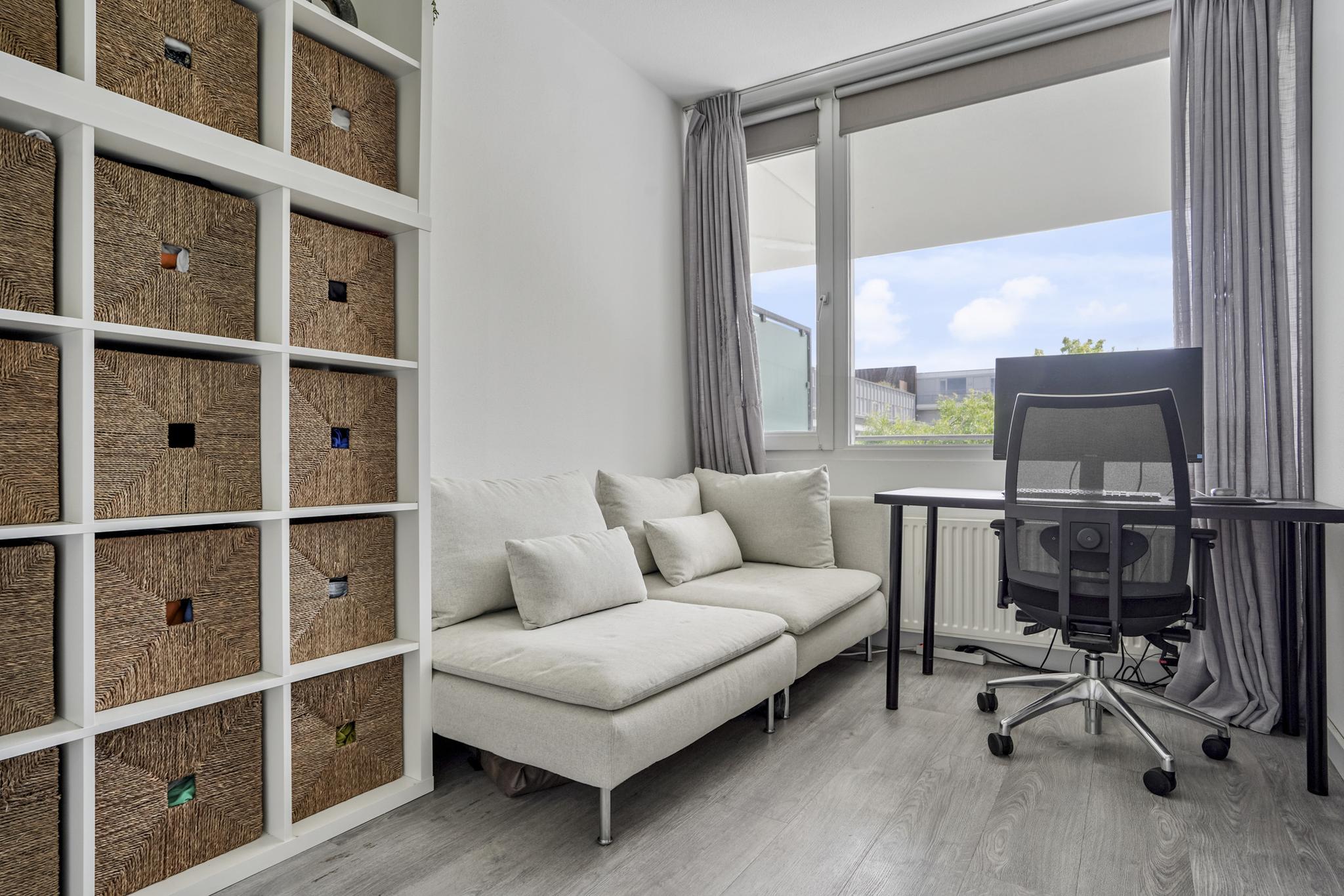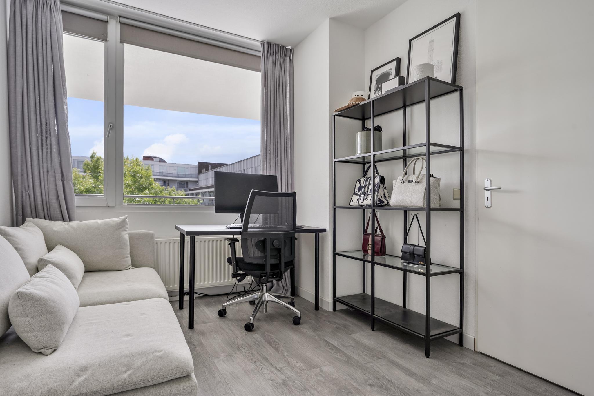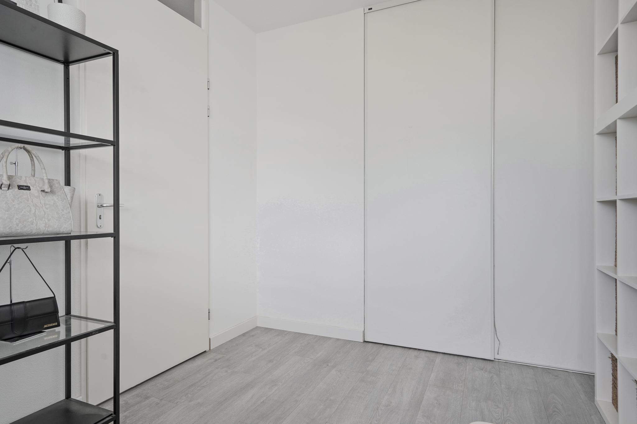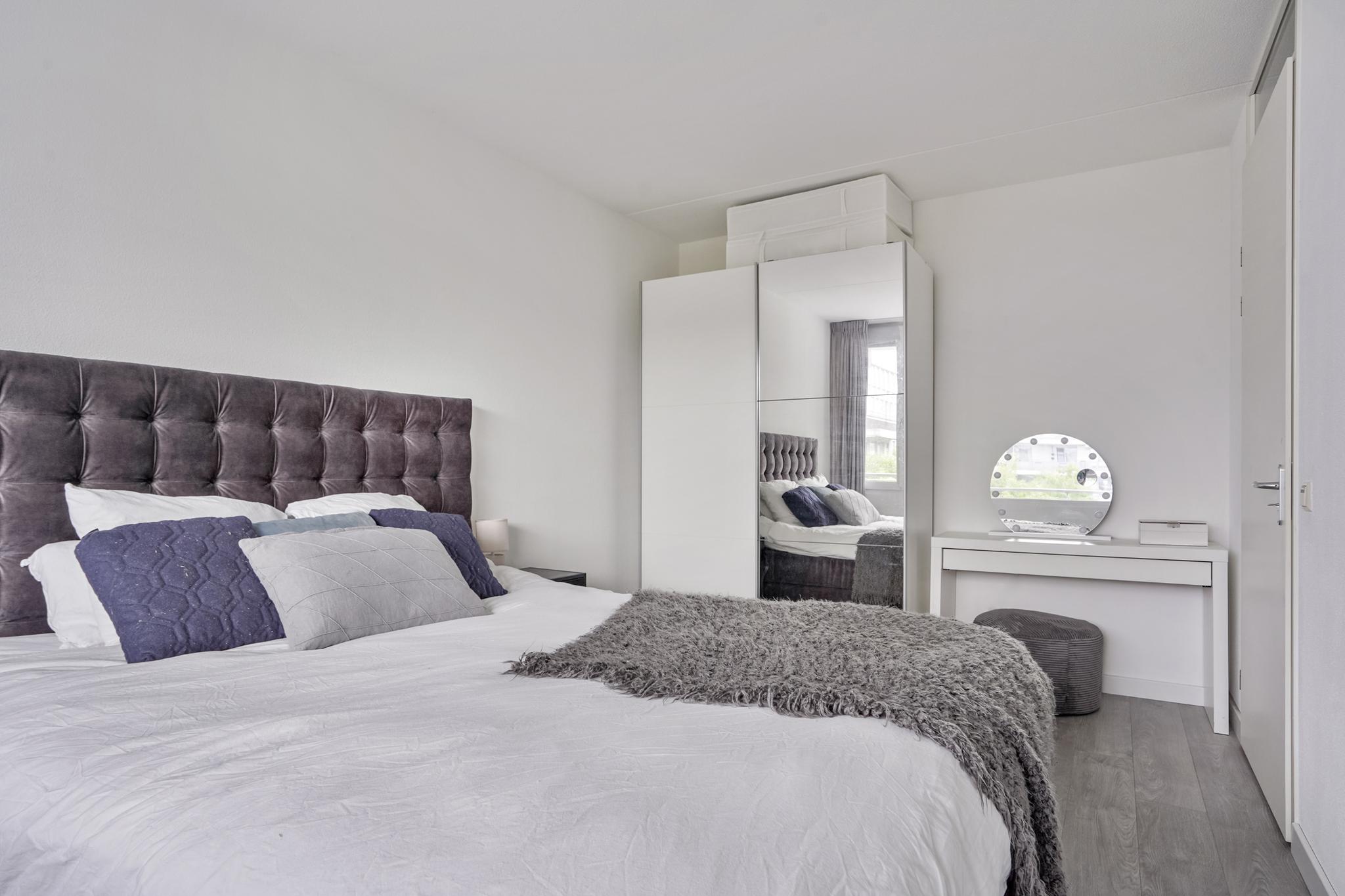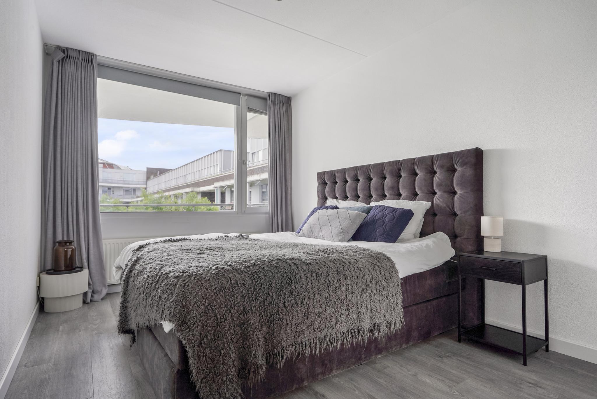 Aan de voorzijde van het appartement bevinden zich de twee ruime slaapkamers met uitzicht over de groenrijke, rustgevende binnentuin. Beide slaapkamers zijn ruim van opzet en voorzien van een pvc vloer. De hoofdslaapkamer biedt voldoende ruimte aan een tweepersoonsbed en kastenwand. De tweede slaapkamer is voorzien van een vaste kastenwand. Deze kasten blijven in het appartement staan.