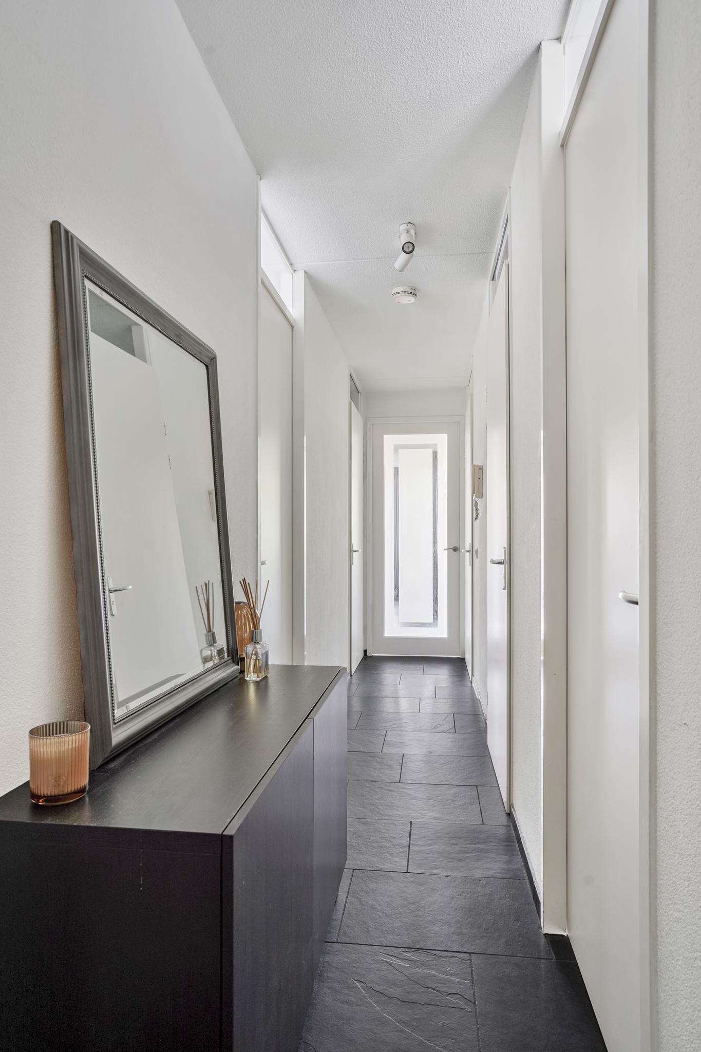 De entree, voorzien van meterkast en garderobe, biedt u toegang tot twee slaapkamers, een moderne badkamer, de technische ruimte met de opstelling van de mechanische ventilatie en warmte-unit, een separate toiletruimte en de living met halfopen keuken en toegang tot het balkon op het zonnige westen. Vanuit de entree is de hoogwaardige leistenen tegelvloer doorgelegd richting de living. De tegelvloer is uitgevoerd in een antracieten kleurstelling, welke het appartement een moderne uitstraling geeft.