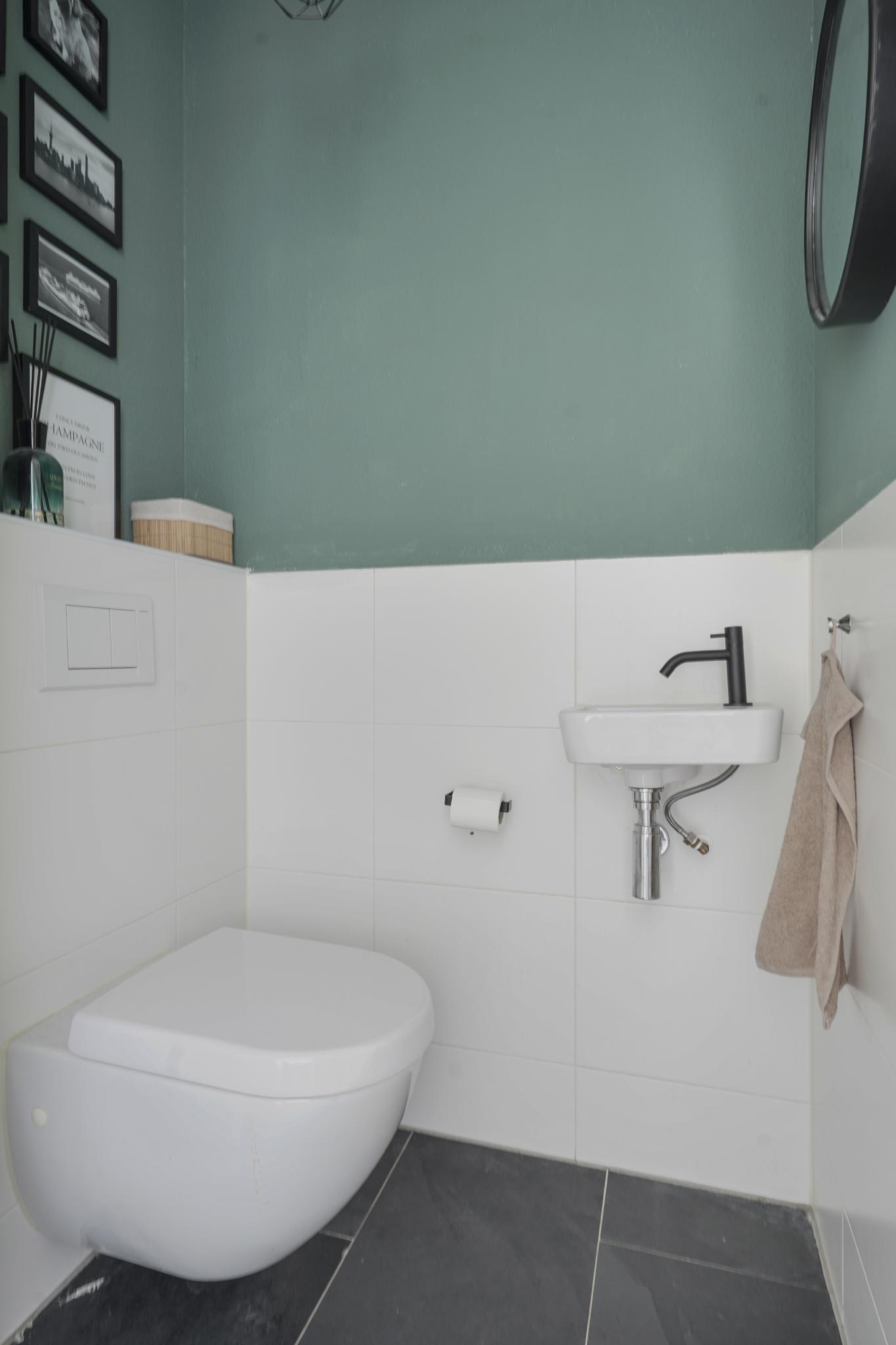 De moderne separate toiletruimte is voorzien van een zwevend toilet en een fonteintje.