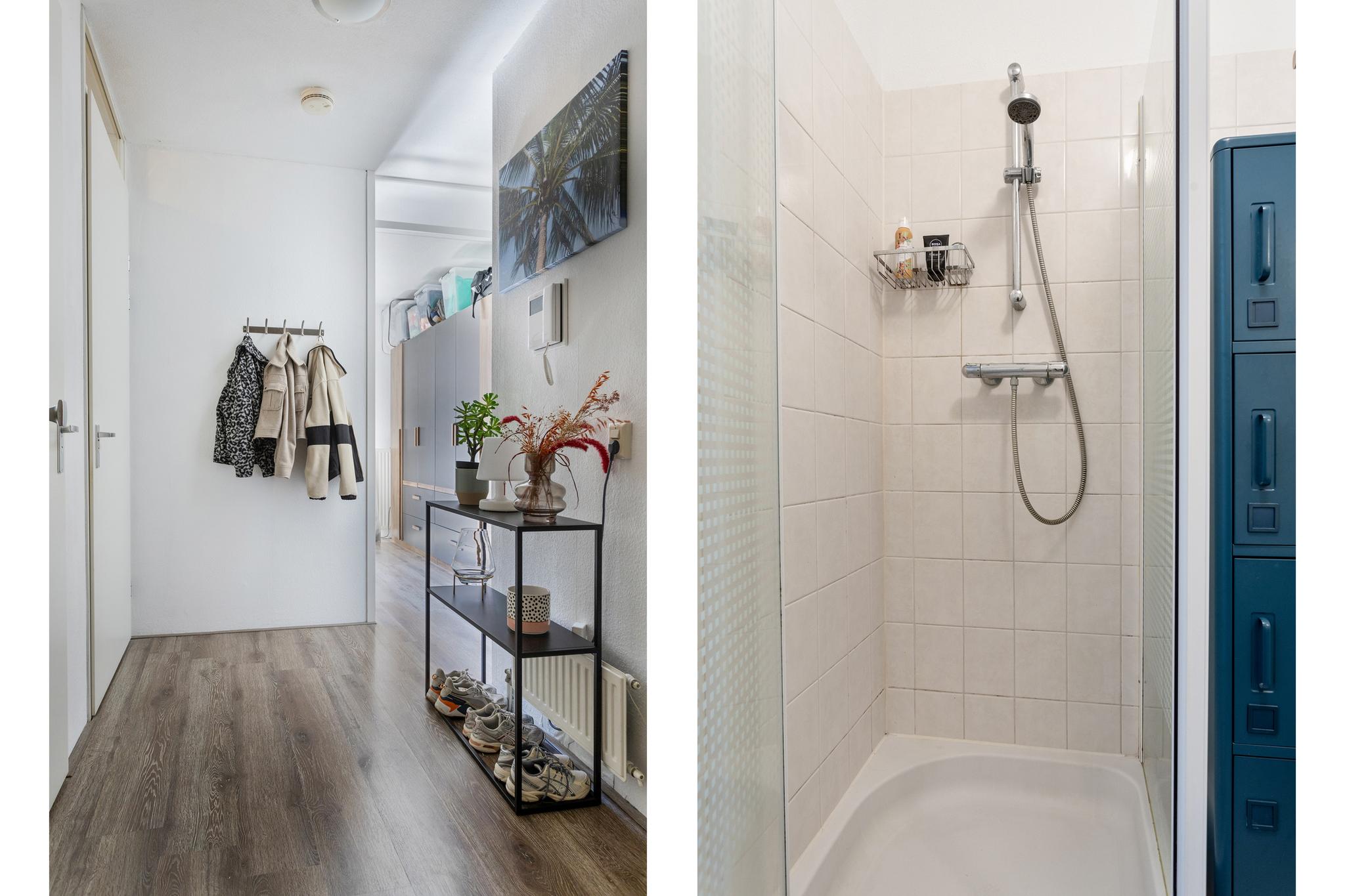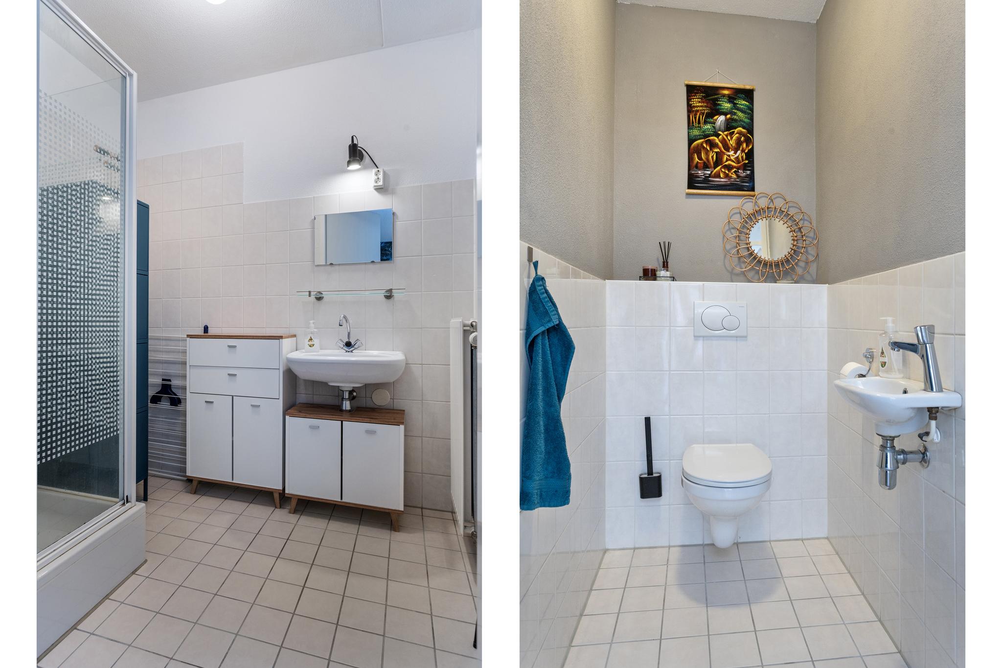 De badkamer is uitgerust met een douchecabine en wastafel. Het geheel is afgewerkt in een lichte kleurstelling. In de hal bevindt zich ook nog een aparte bergruimte met de was- en drogeraansluitingen en de wisselaar voor de stadsverwarming en de mechanische afzuiging.