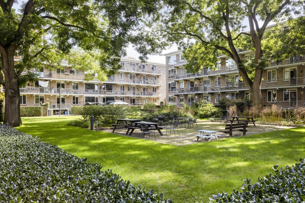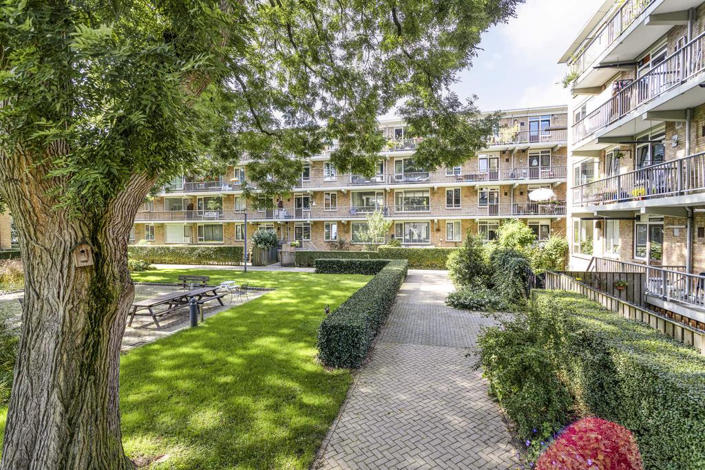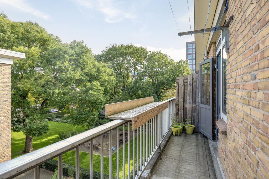 Het balkon aan de achterzijde van het complex heeft een fraai uitzicht over de gezamenlijke binnentuin. Deze afgesloten binnentuin is alleen toegankelijk voor de bewoners van het complex en staat dus ook tot uw beschikking. Een zeer riante berging in het souterrain met elektra en volop ruimte voor stellingkasten en meerdere fietsen.