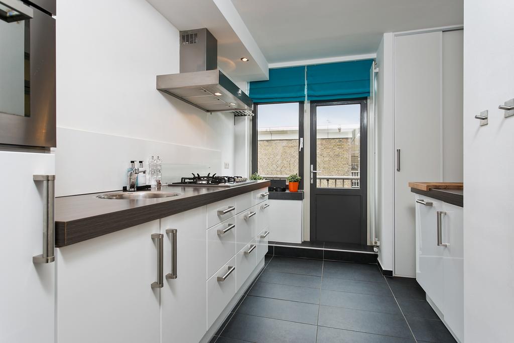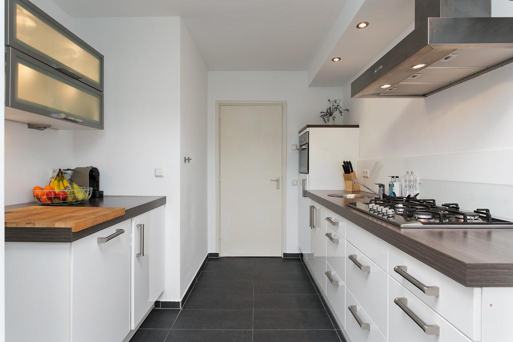 Dichte keuken voorzien van modern keukenmeubel met inbouwapparatuur als; koelkast, 5-pits gasfornuis, afzuigkap en combi-oven. Doordat de oude doucheruimte bij de keuken is gevoegd beschikt u over een extra werkblad met daaronder een vriezer en een vaatwasser. De keuken is afgewerkt met een antraciet tegelvloer, een designradiator en een inbouwkast met opstelling van de c.v.-combiketel.