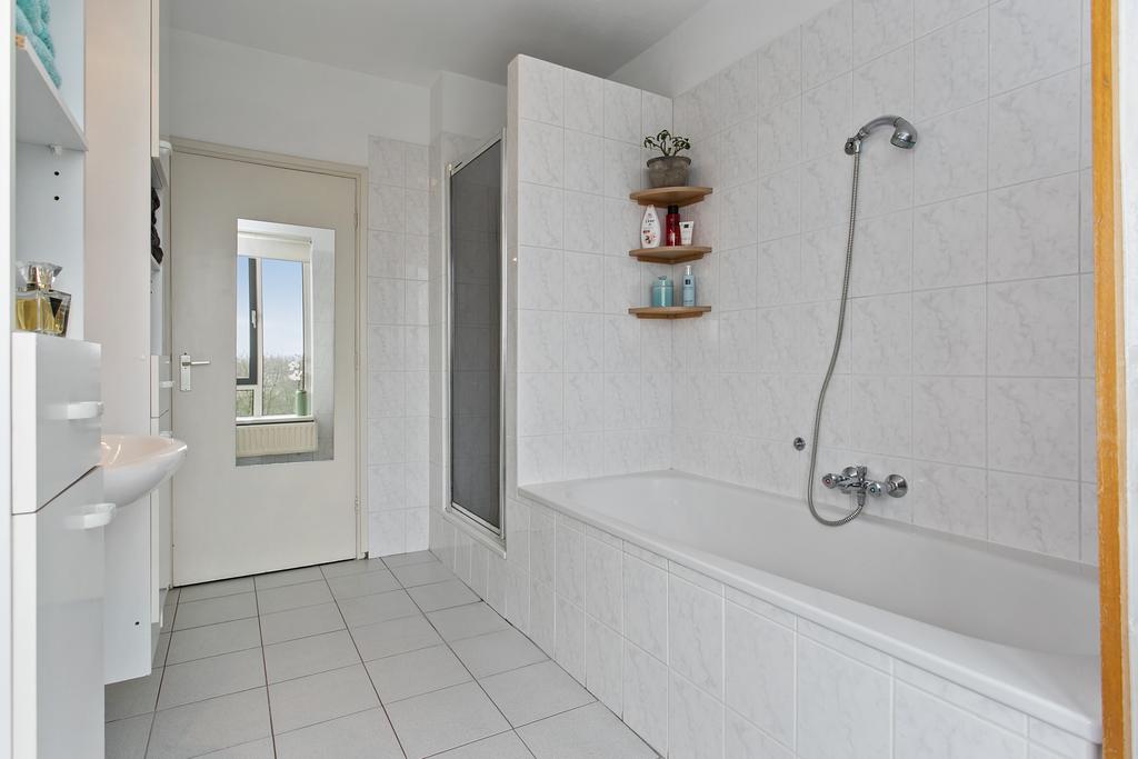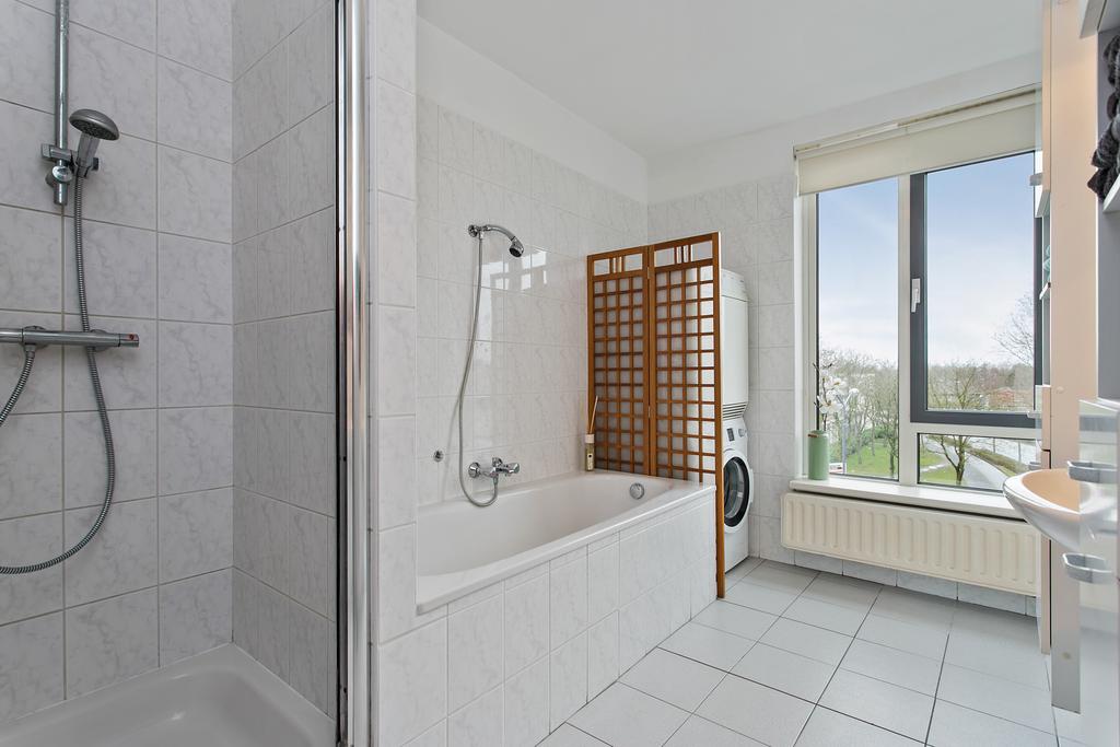- Ligbad, douche, wastafel, wastafelmeubel en wasmachineaansluiting